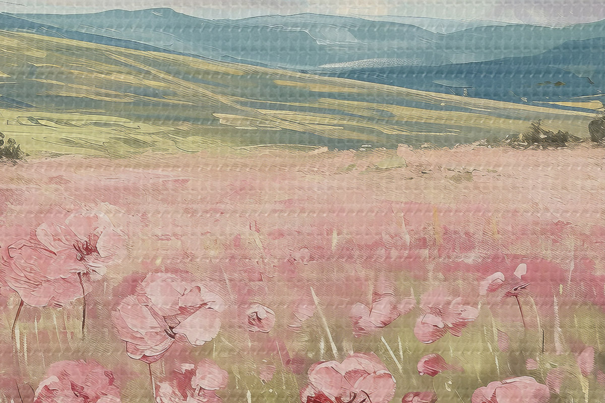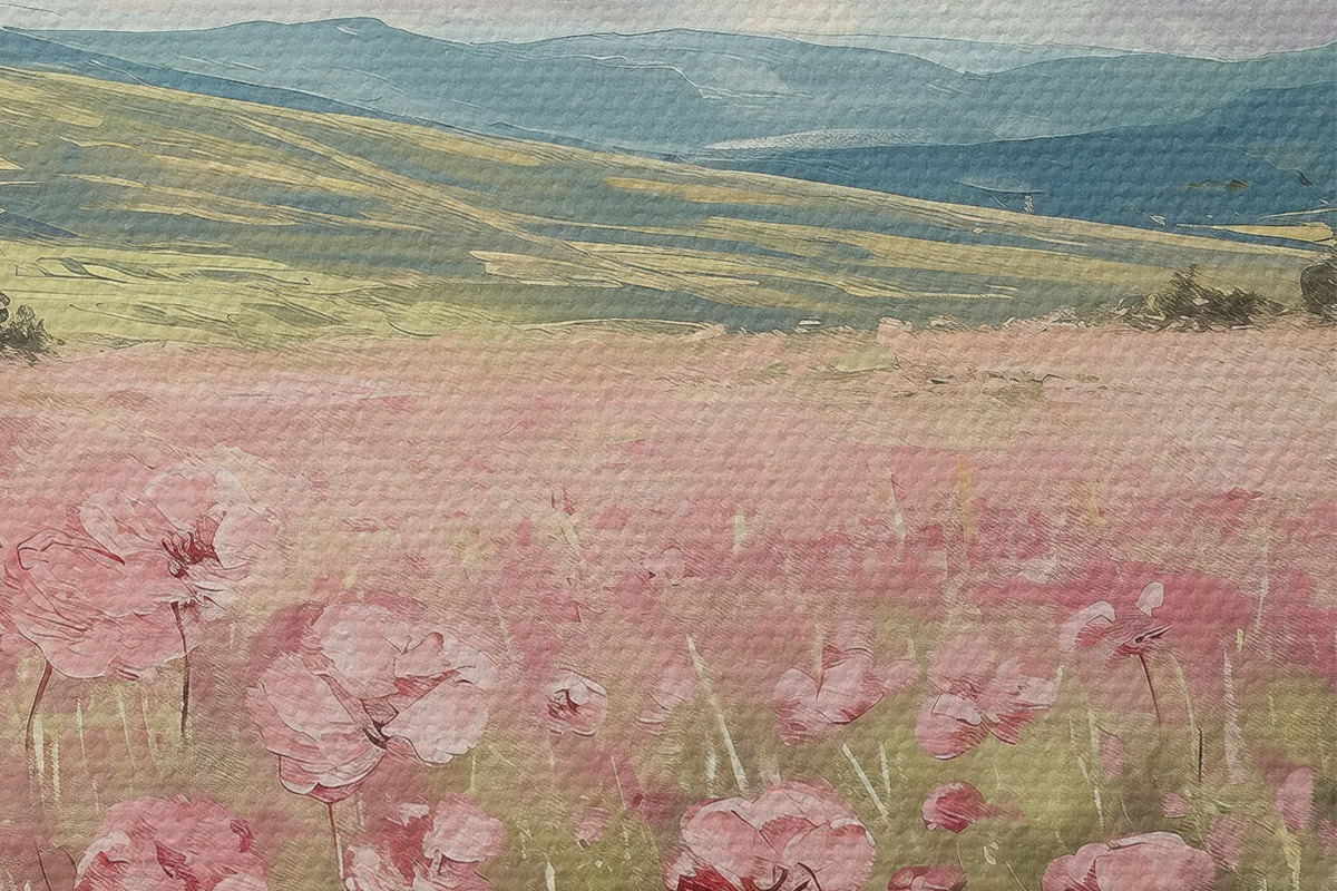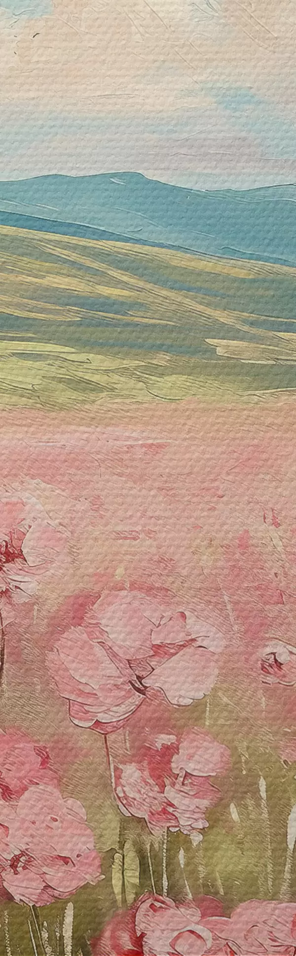 Afbeelding Weide met roze bloemen, bergen, natuurlandschap, blauwe lucht met wolken, acryl Nr r40232