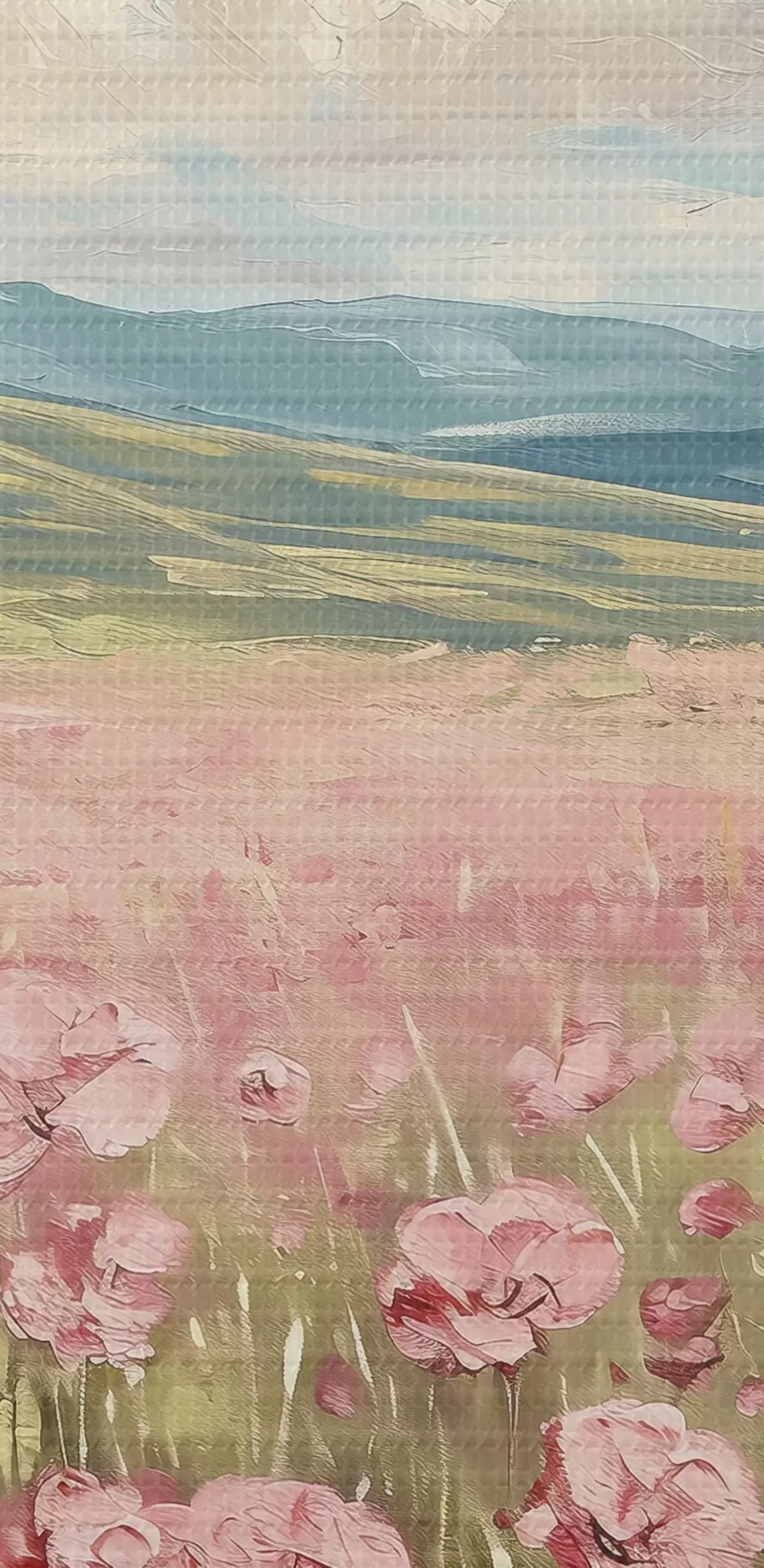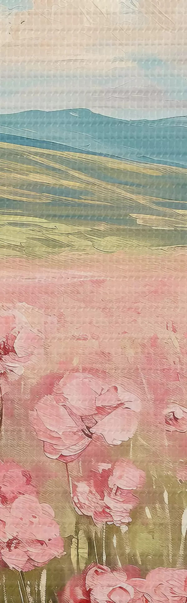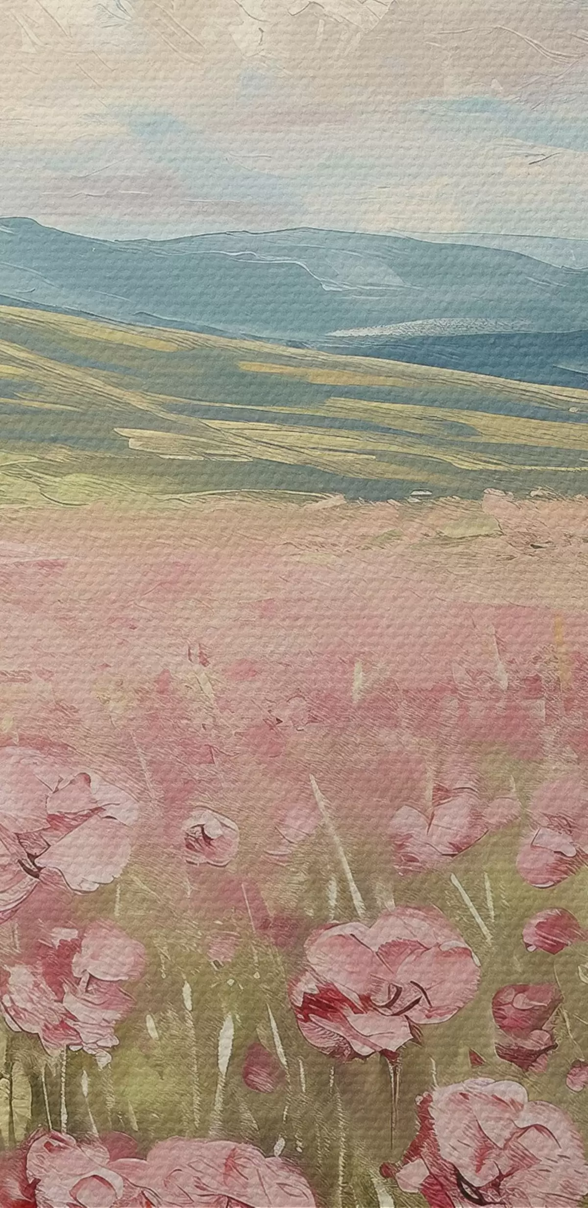 Afbeelding Weide met roze bloemen, bergen, natuurlandschap, blauwe lucht met wolken, acryl Nr r40232