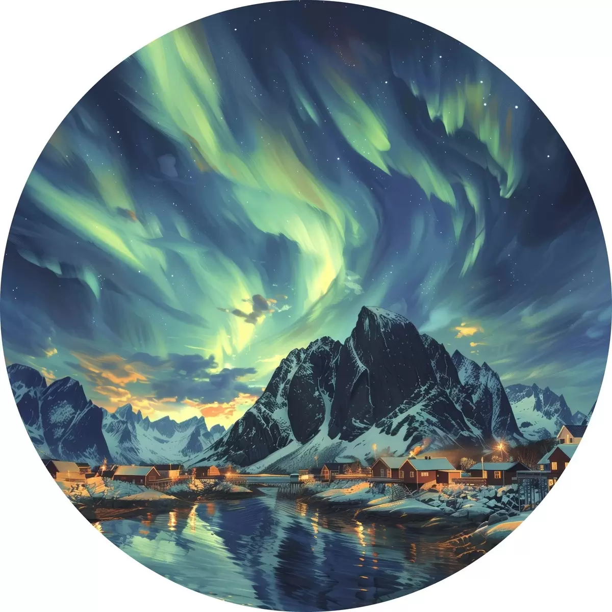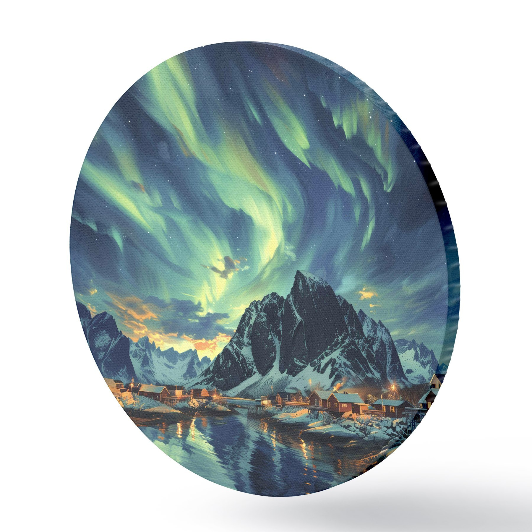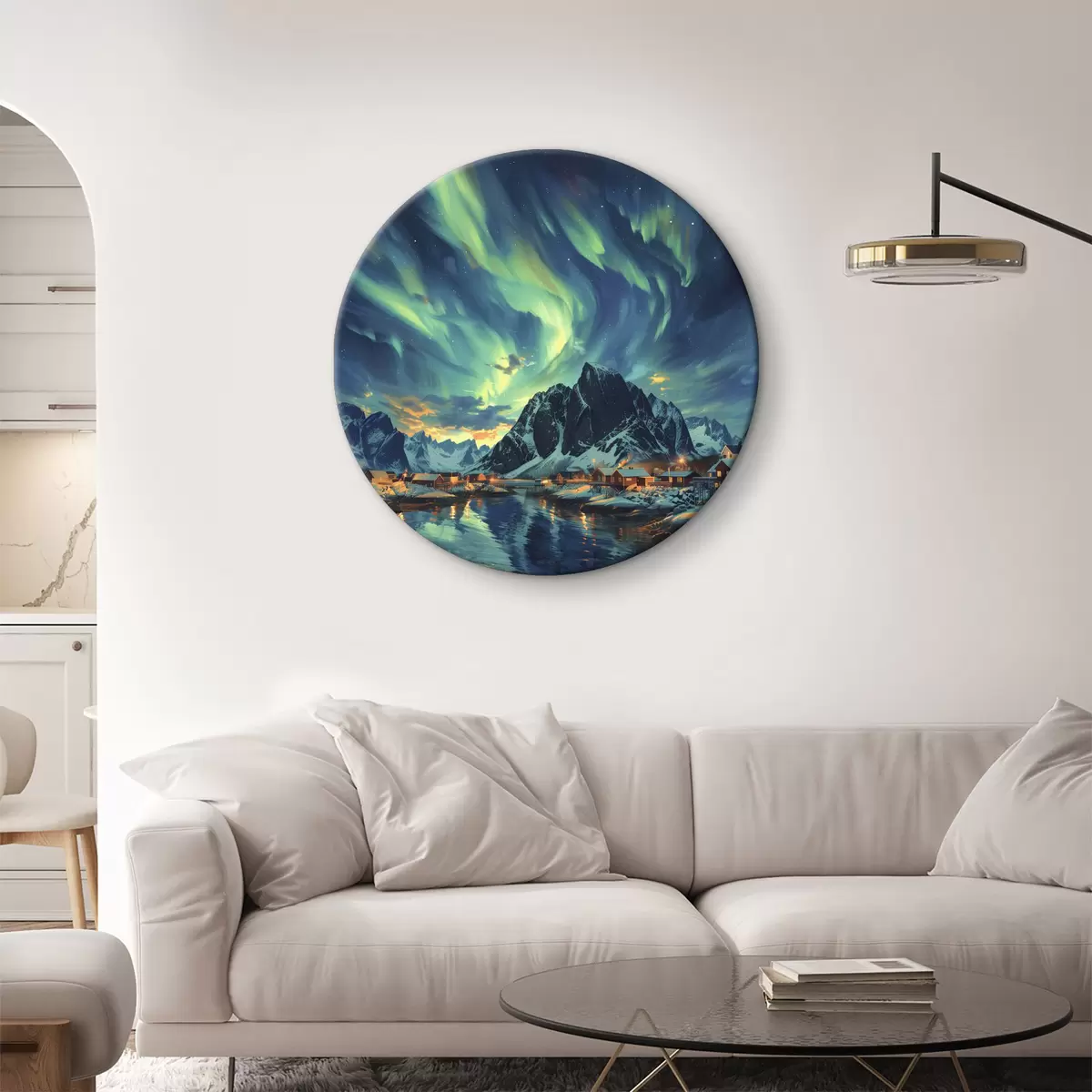 Ronde schilderijen Lofoten, noorderlicht, winterdorp r40299