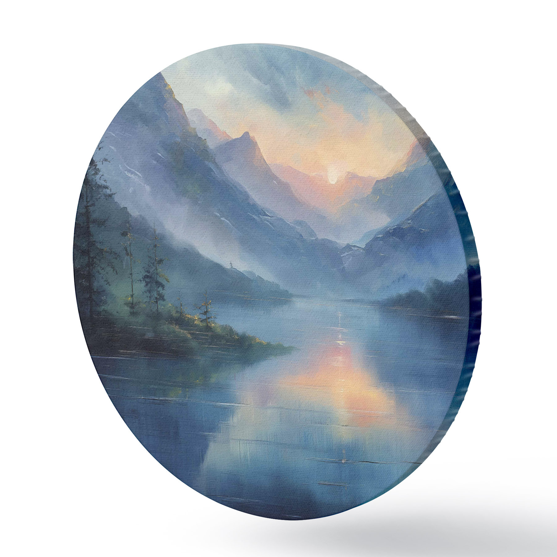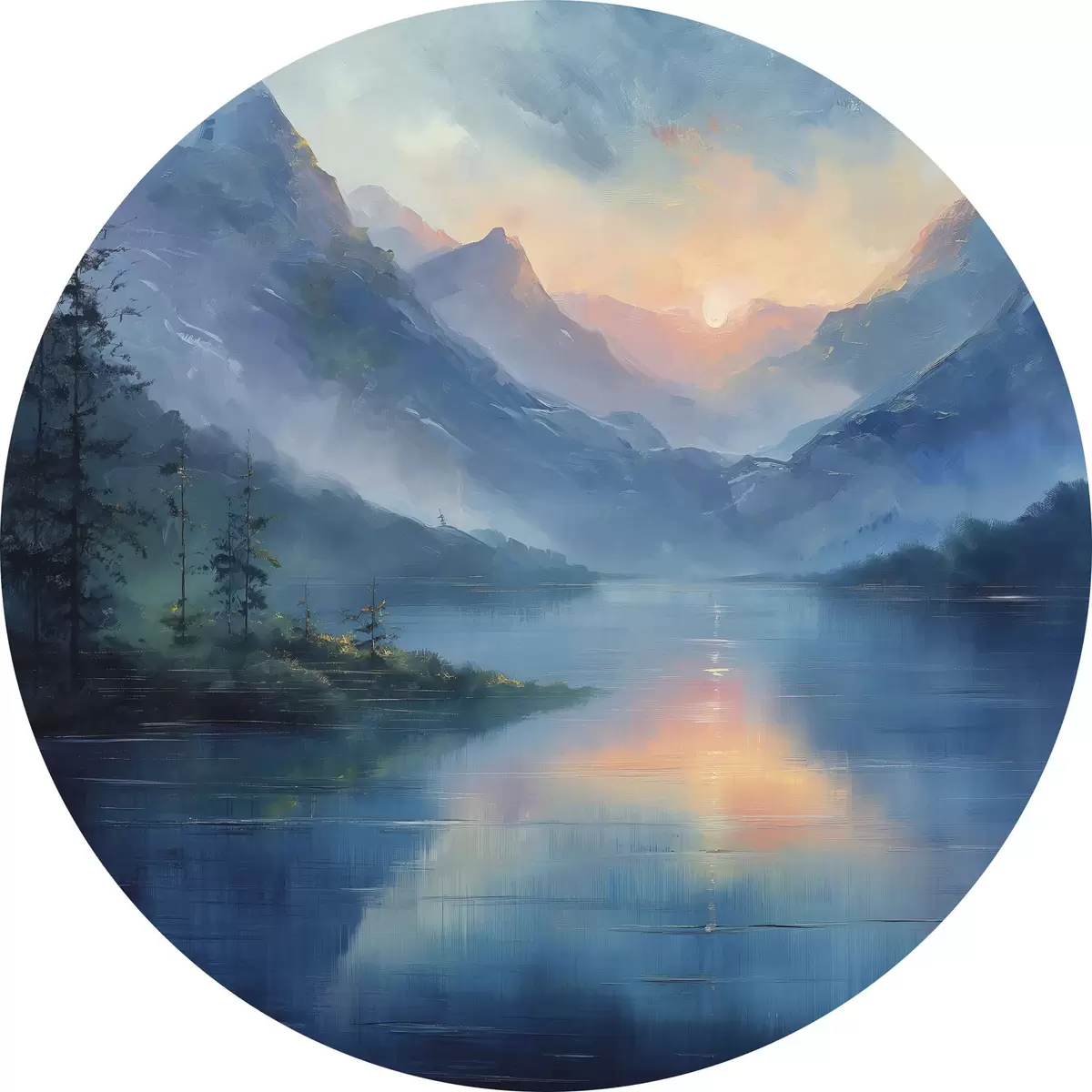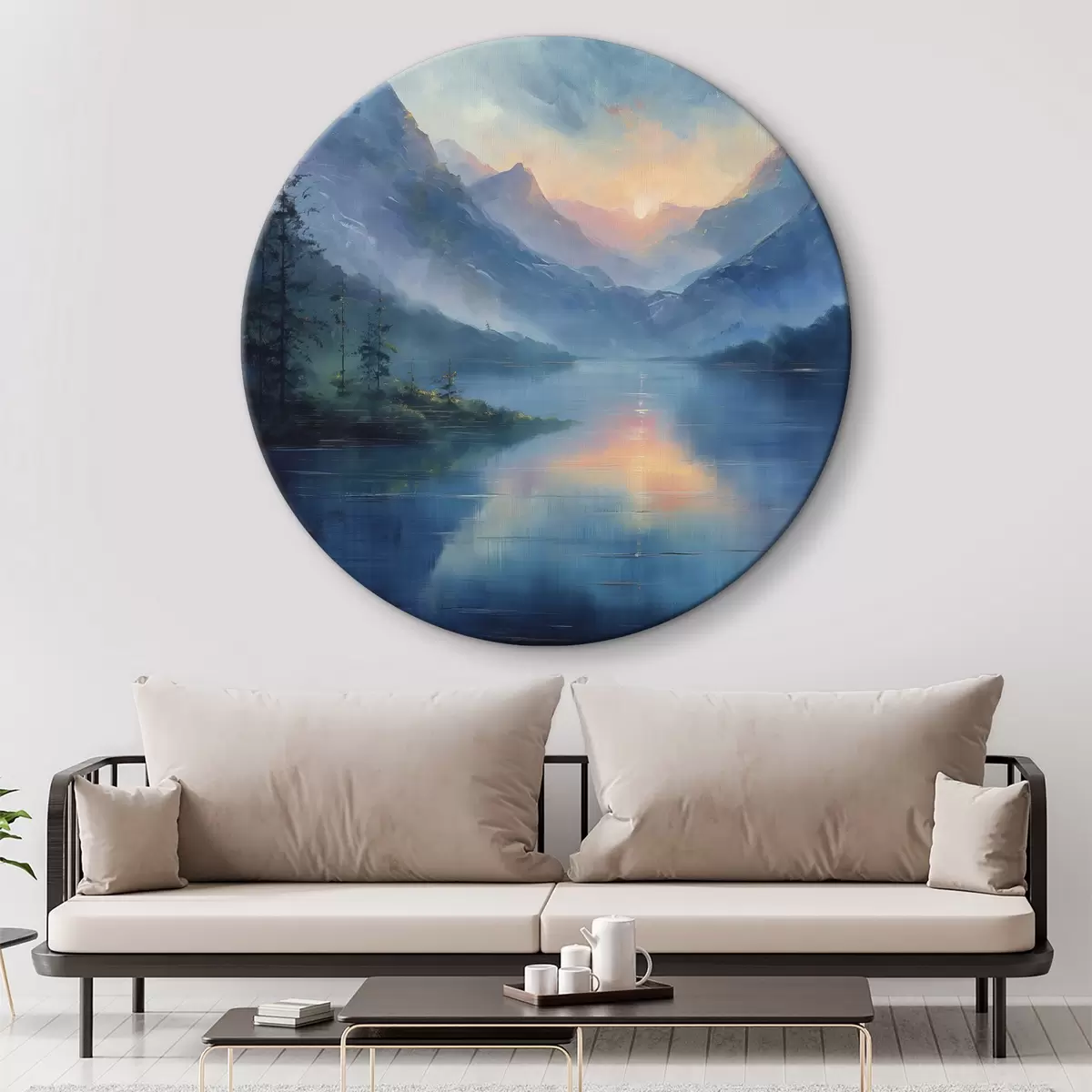 Ronde schilderijen Zonsondergang in de bergen, mist, rivier, bos, olieverfschilderij r40302