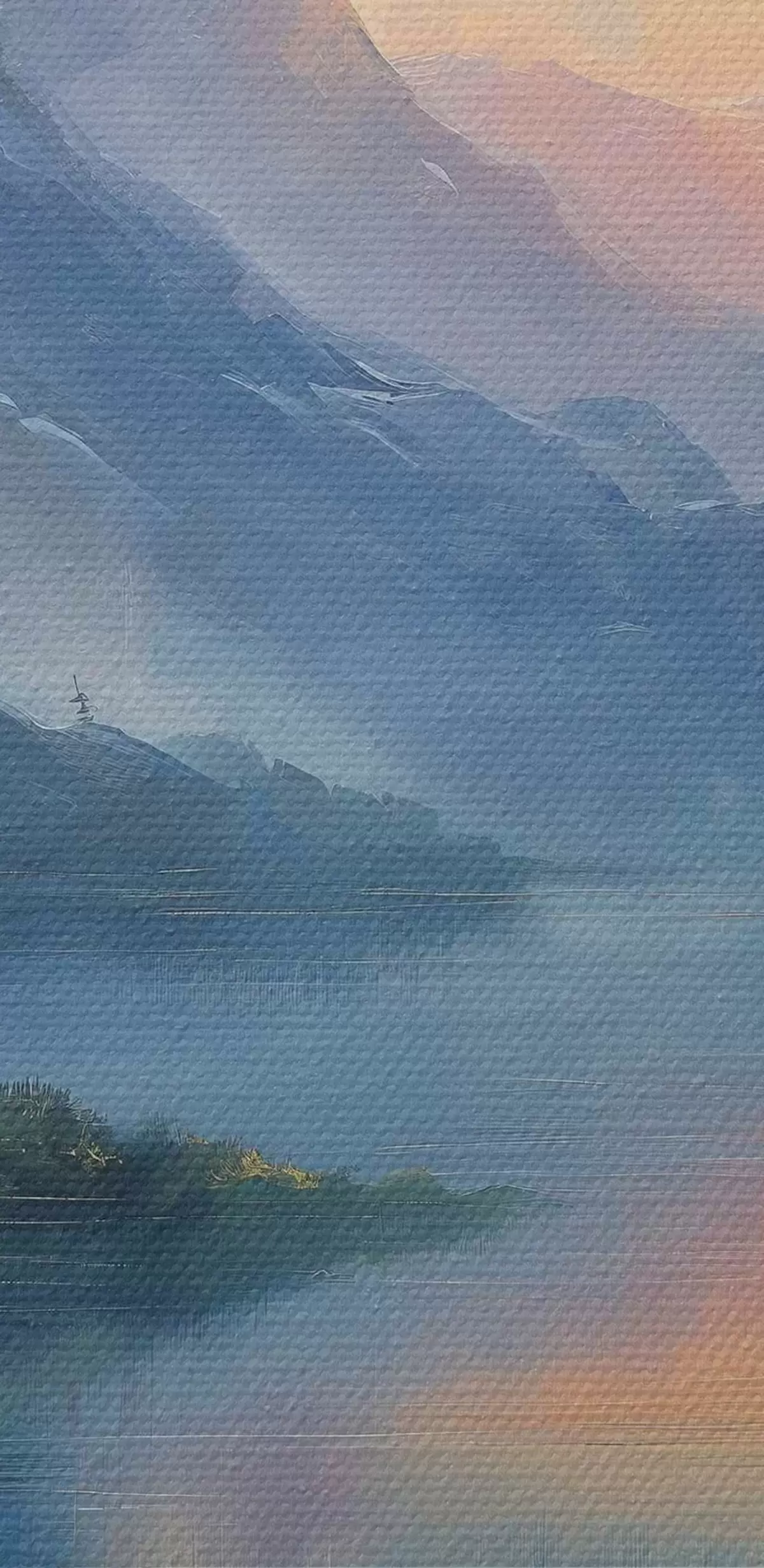 Afbeelding Zonsondergang in de bergen, mist, rivier, bos, olieverfschilderij Nr r40302