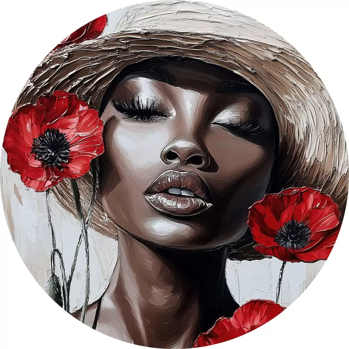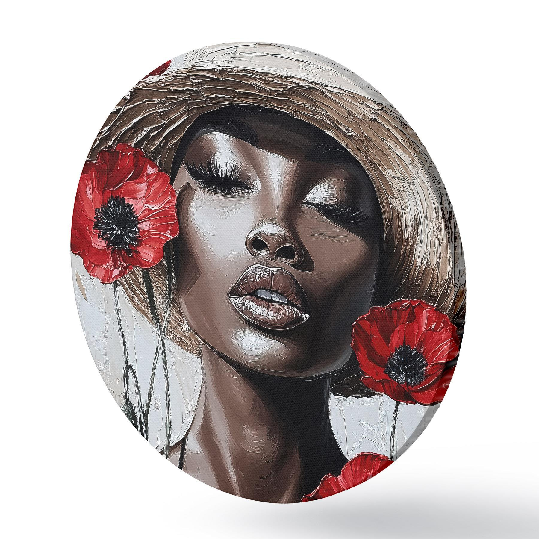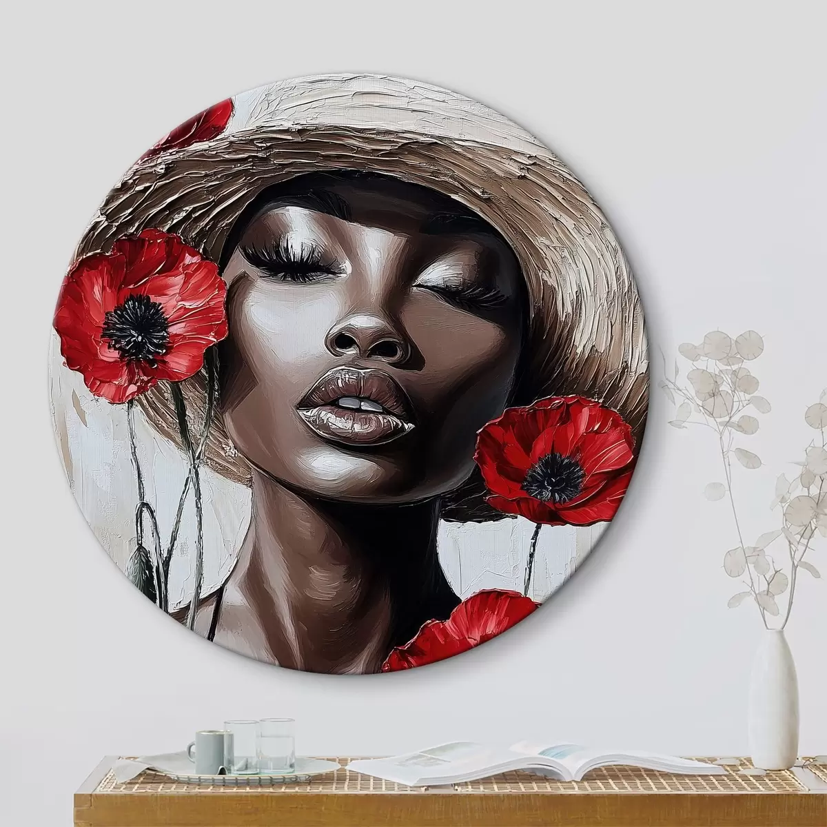 Ronde schilderijen Portret van een vrouw in een hoed met rode klaprozen r40350