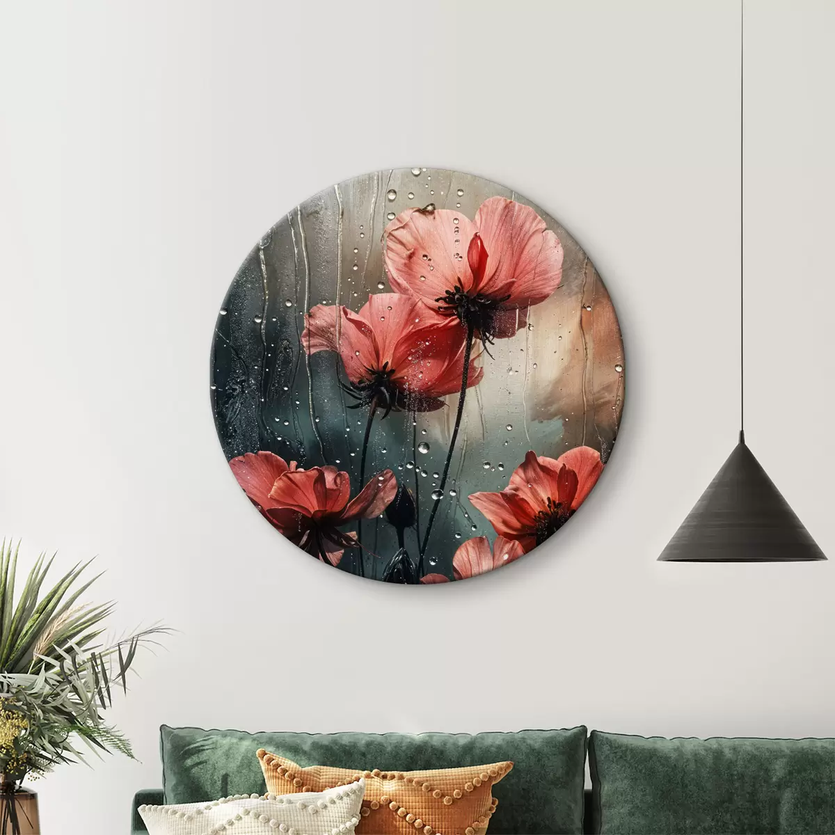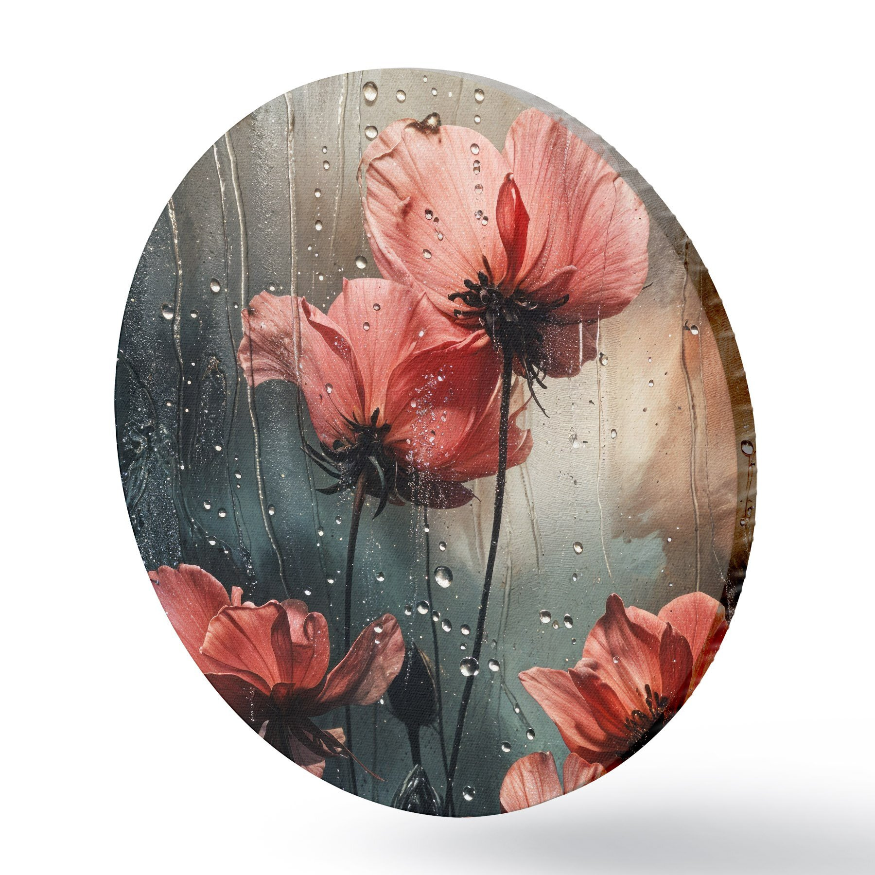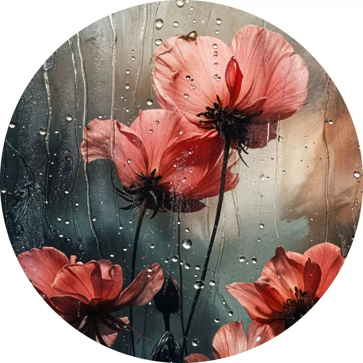 Ronde schilderijen Rode bloemen met waterdruppels tegen een wazige achtergrond r40412