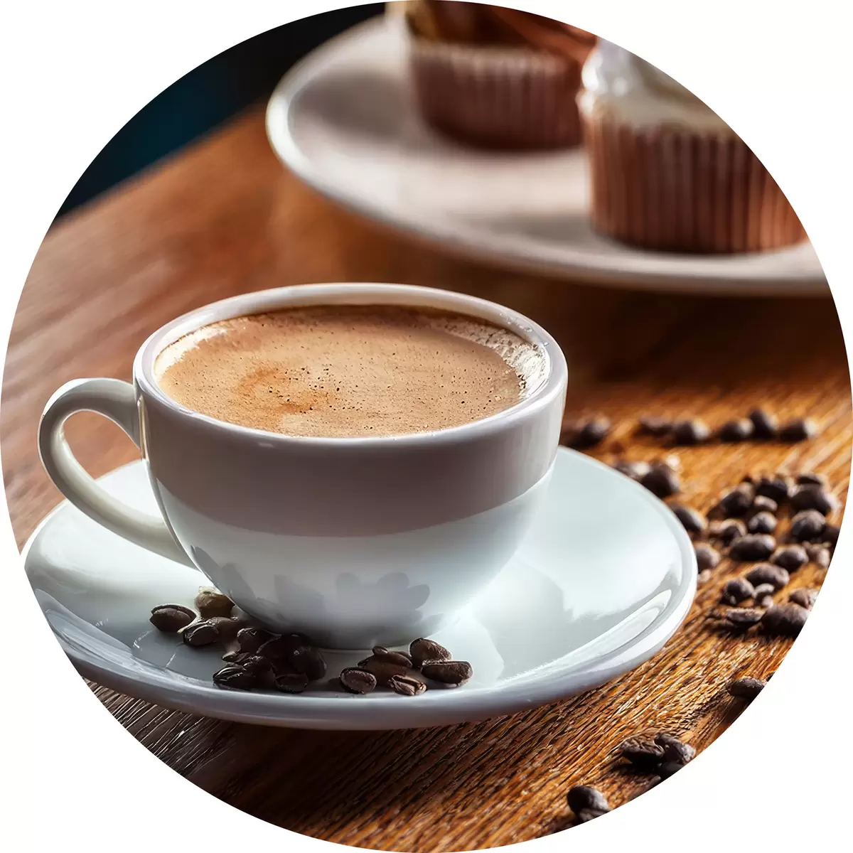 Ronde schilderijen kopje koffie, koffiebonen, taarten, stilleven r40417