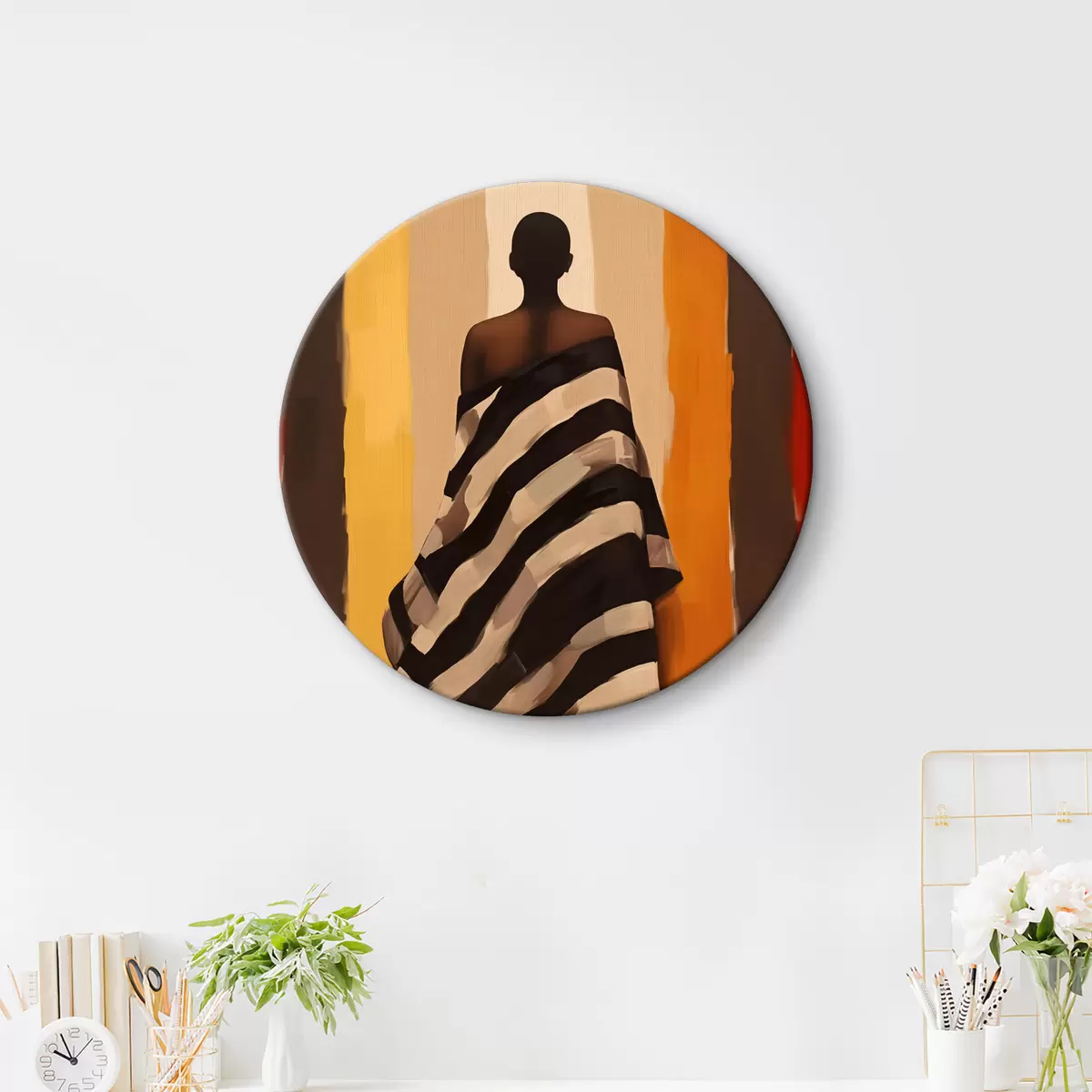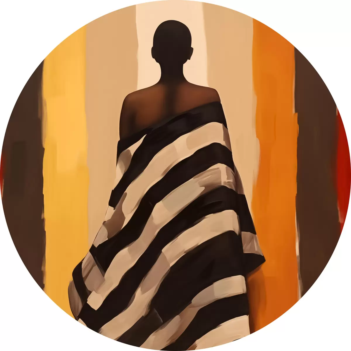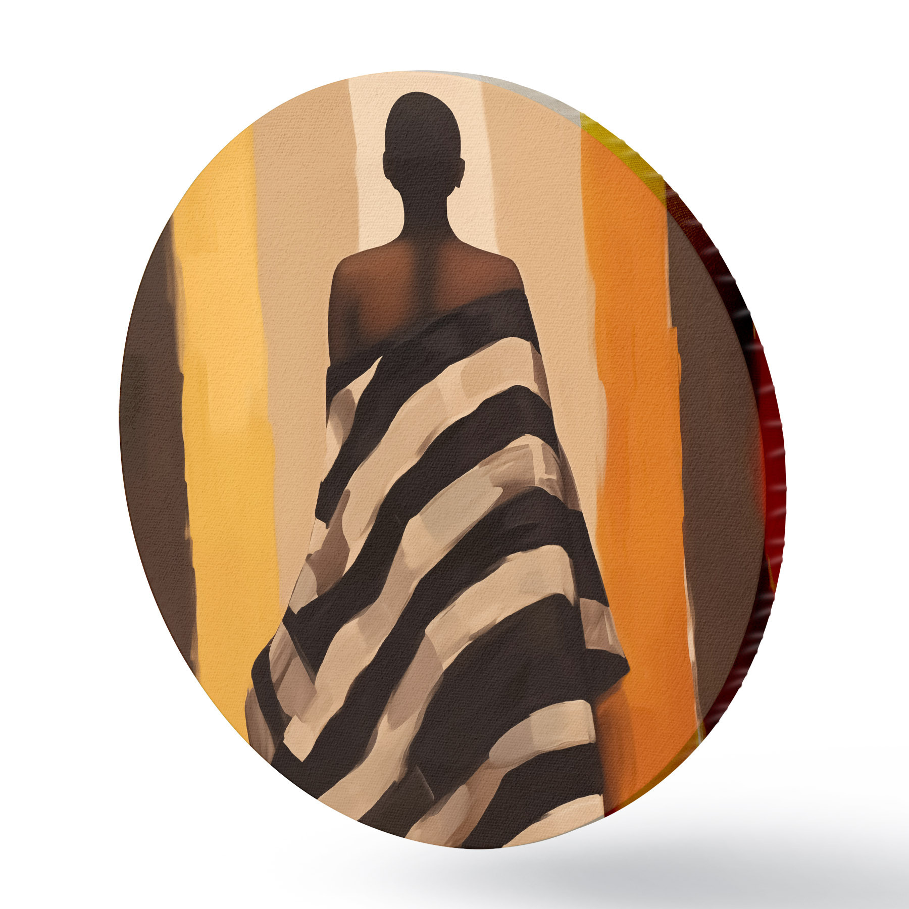 Ronde schilderijen Silhouet van een Afro-Amerikaanse vrouw in een gestreepte cape op een achtergrond met verticale strepen, zwart, beige, geel, rood, bruin r40487