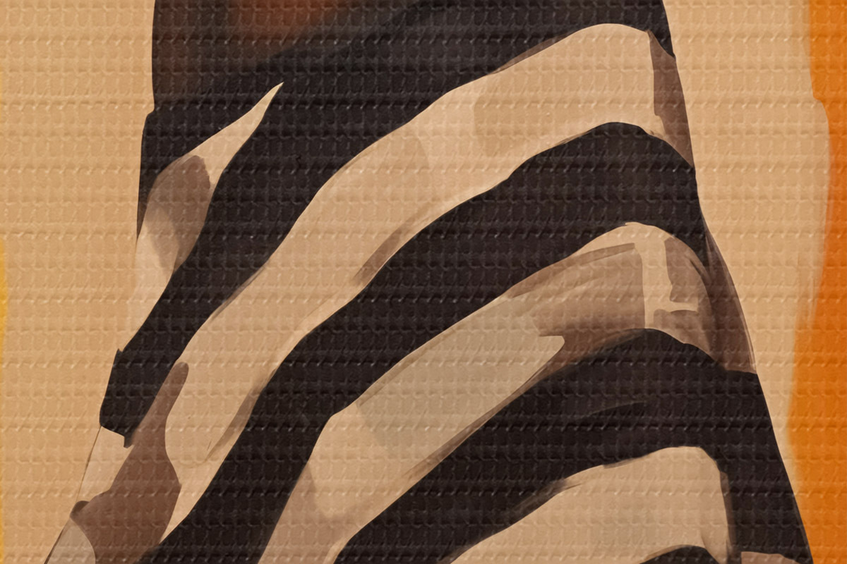 Afbeelding Silhouet van een Afro-Amerikaanse vrouw in een gestreepte cape op een achtergrond met verticale strepen, zwart, beige, geel, rood, bruin Nr r40487