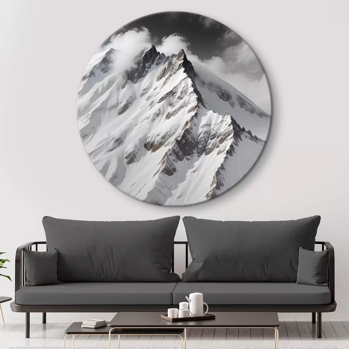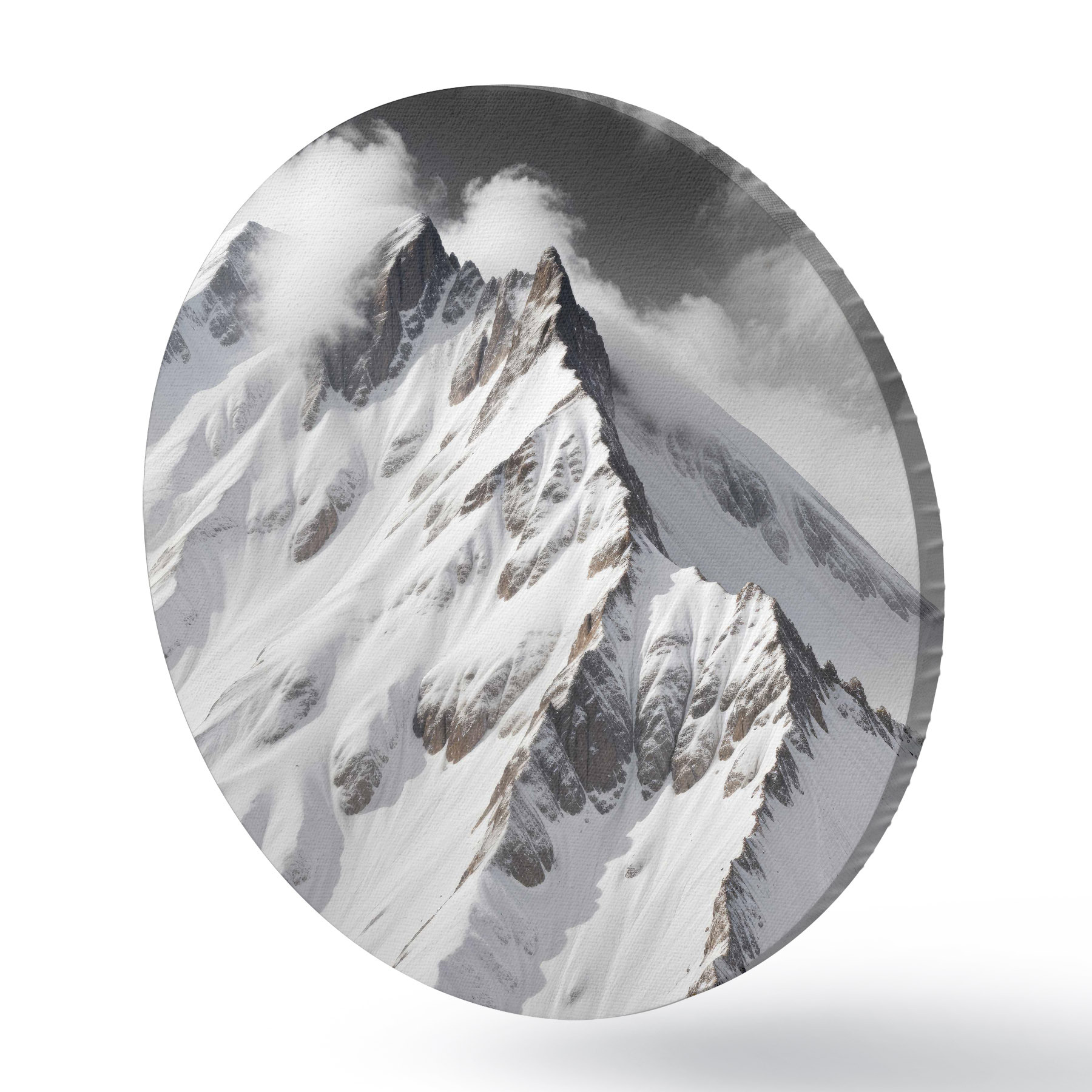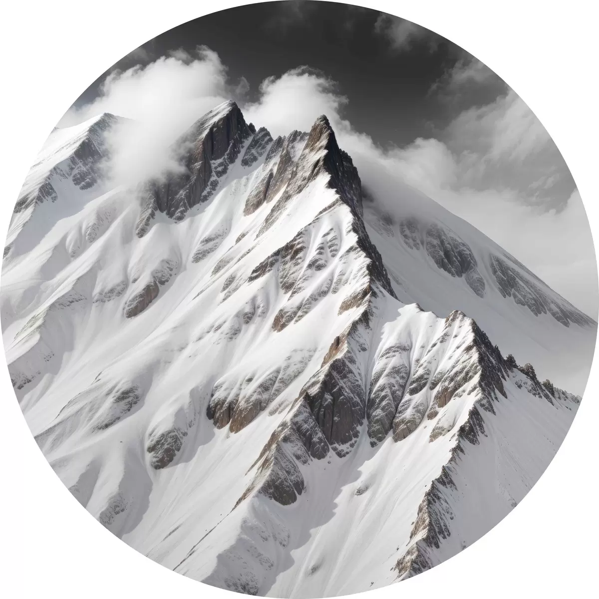 Ronde schilderijen Besneeuwde zwarte en witte bergtoppen in een bewolkt, dramatisch landschap r40553