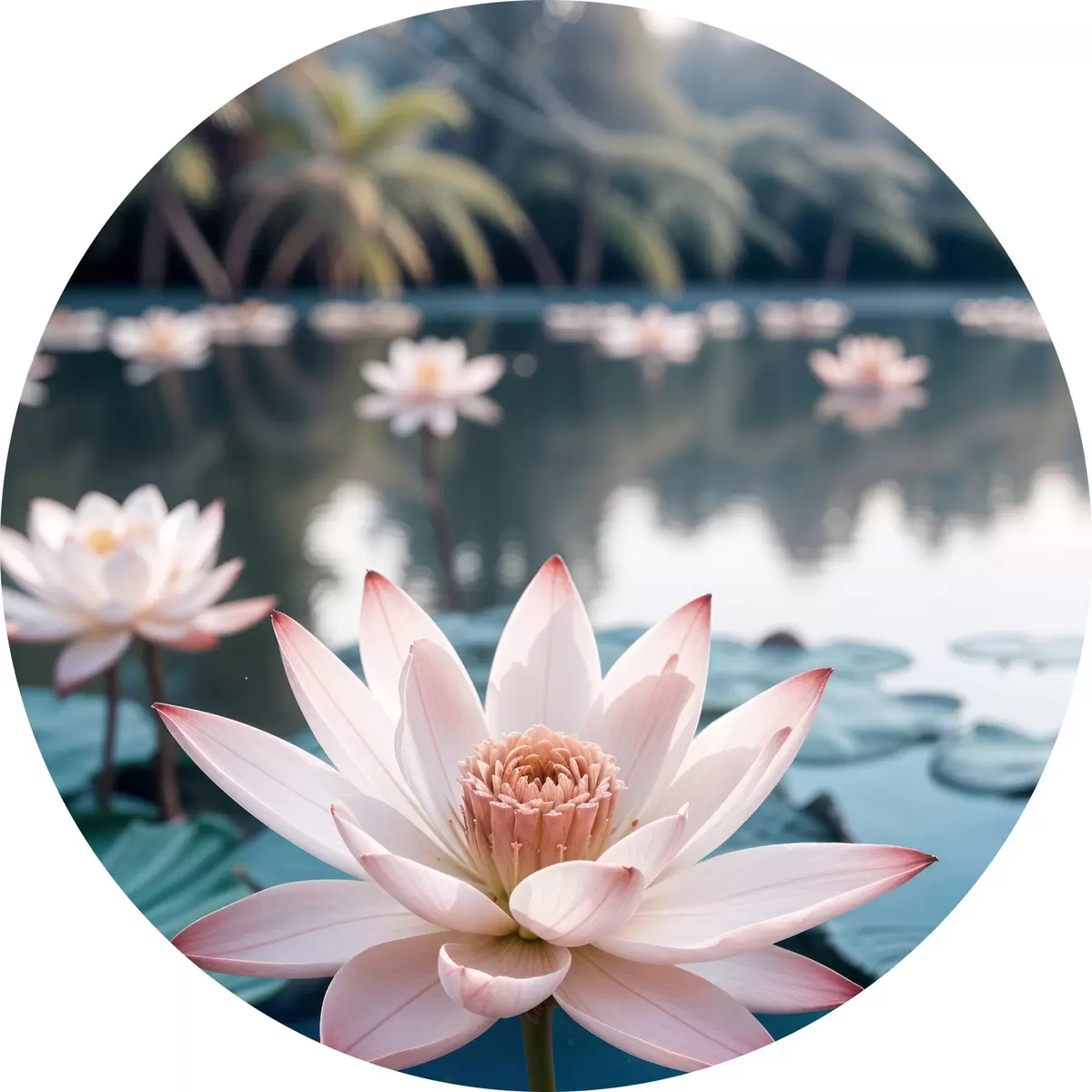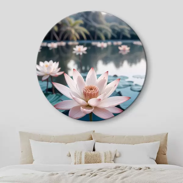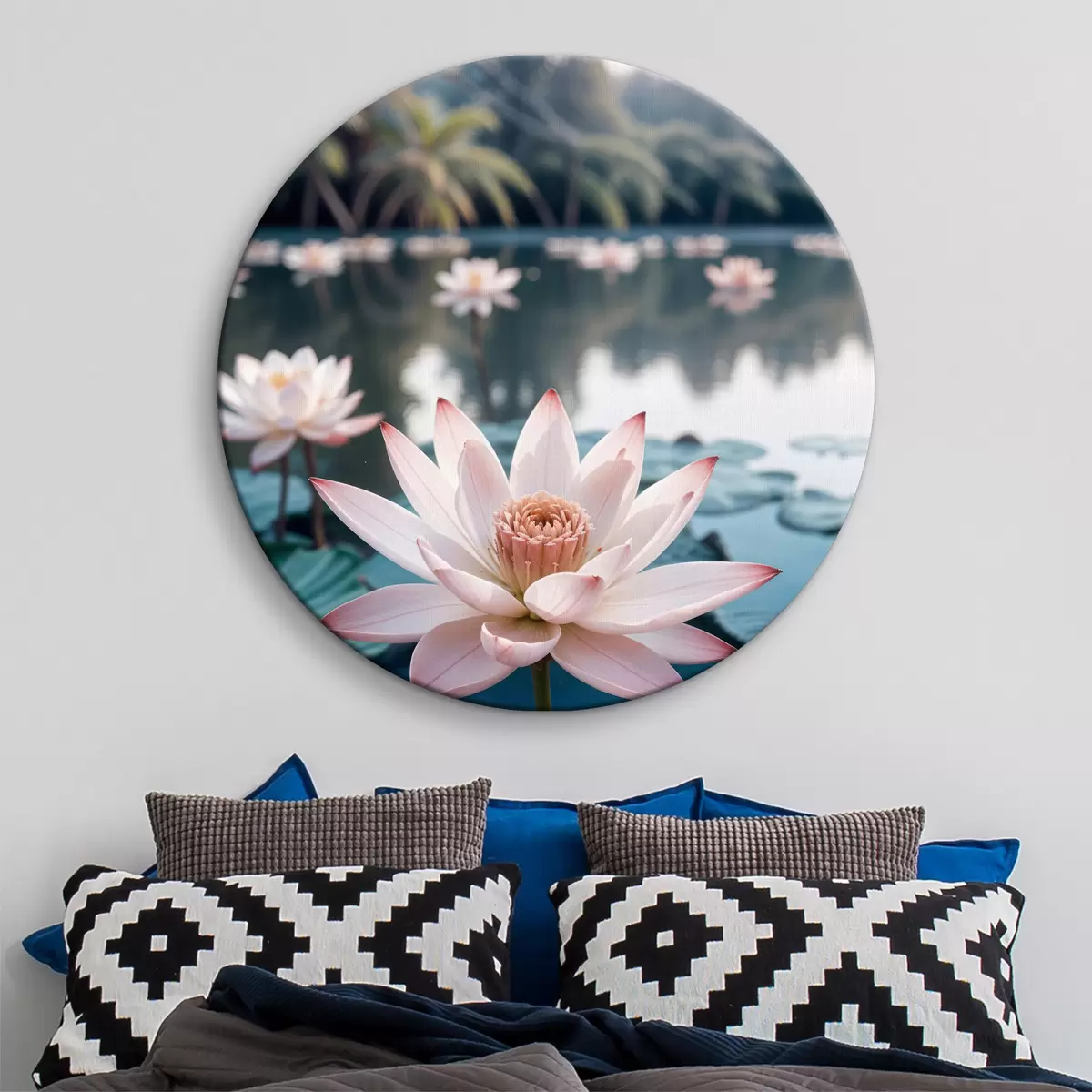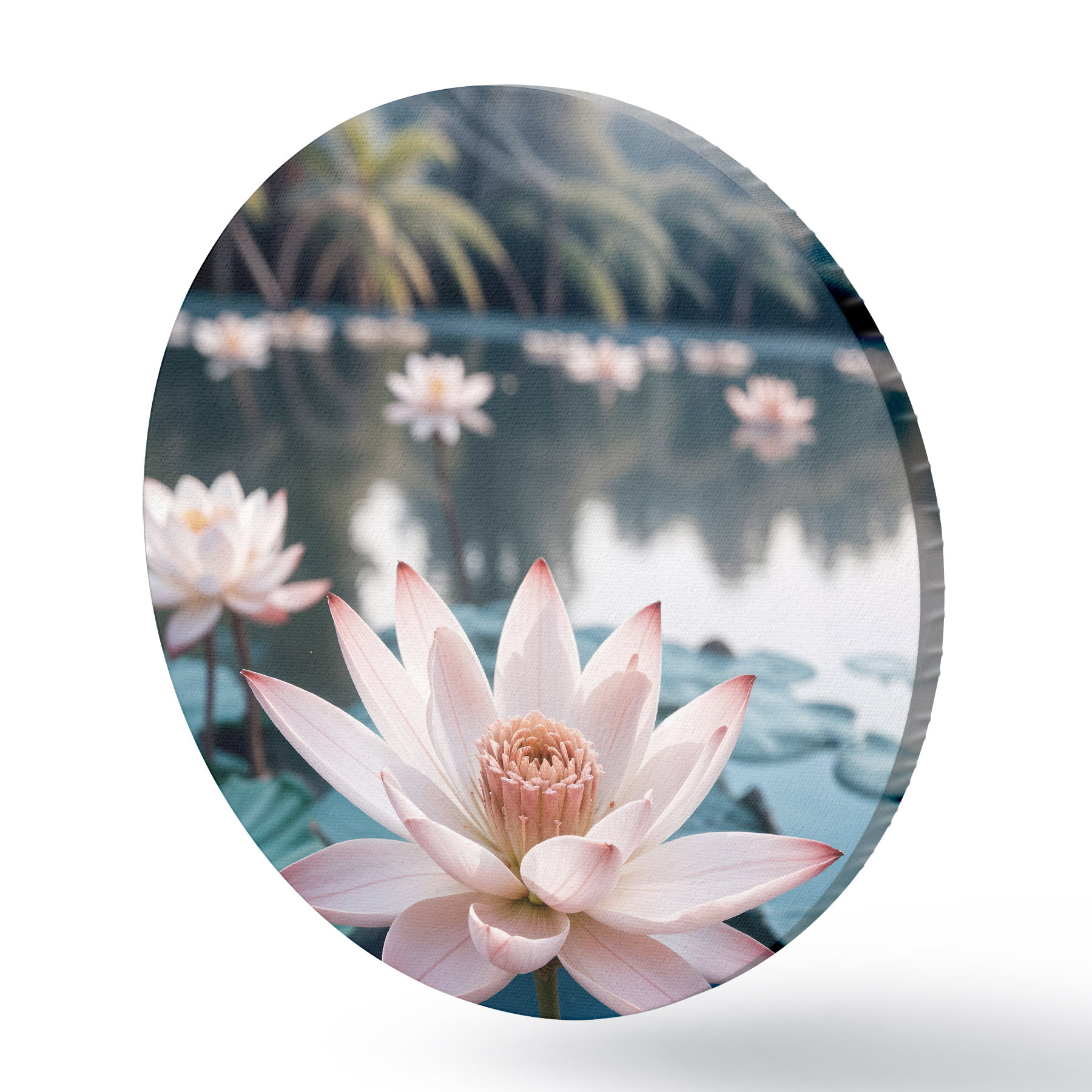 Ronde schilderijen Een vijver met roze lotusbloemen die op het oppervlak drijven, omgeven door weelderig groen en palmbomen r40555