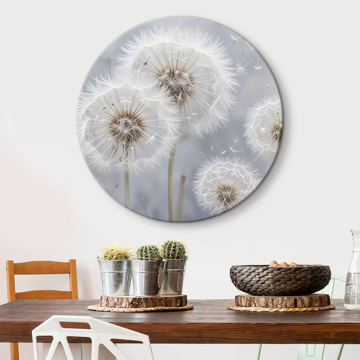 Ronde schilderijen Witte paardenbloem bloemen met pluizige zaden op een wazige grijze achtergrond r40556