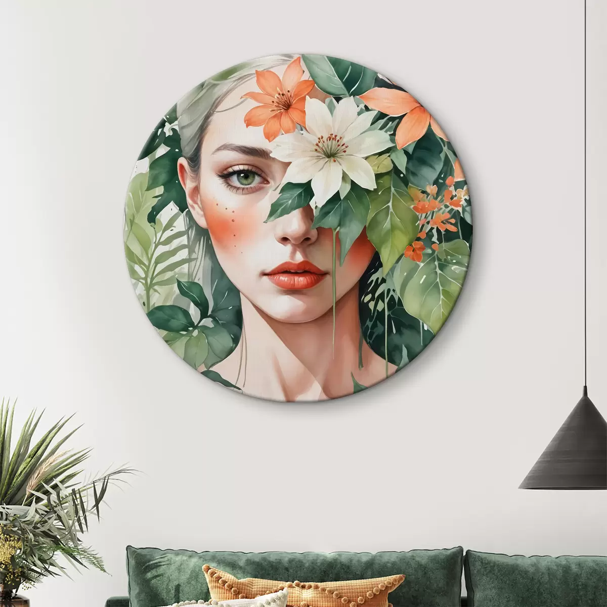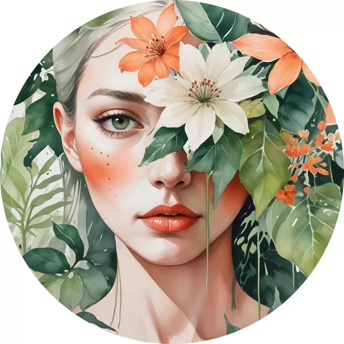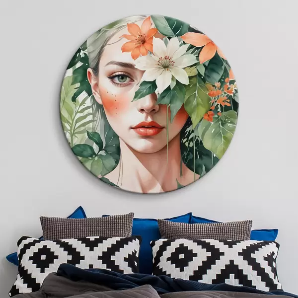 Ronde schilderijen Blondharige vrouw omringd door levendige oranje en witte tropische bloemen, groene bladeren en vegetatie r40557