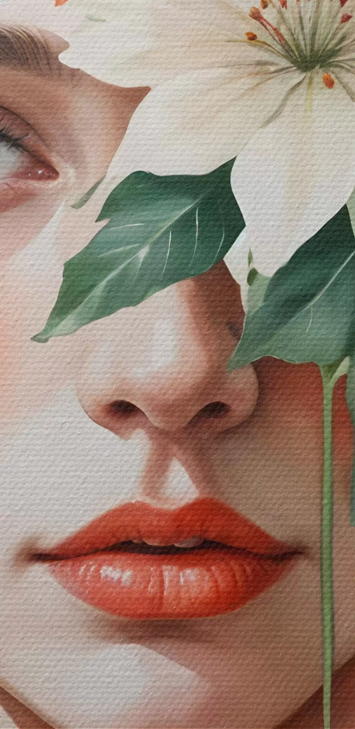 Afbeelding Blondharige vrouw omringd door levendige oranje en witte tropische bloemen, groene bladeren en vegetatie Nr r40557