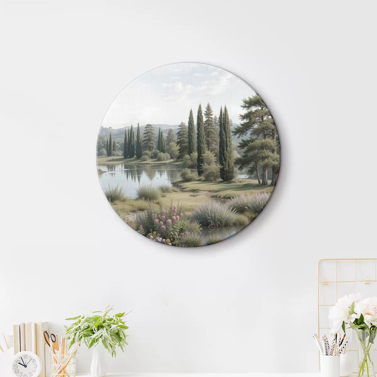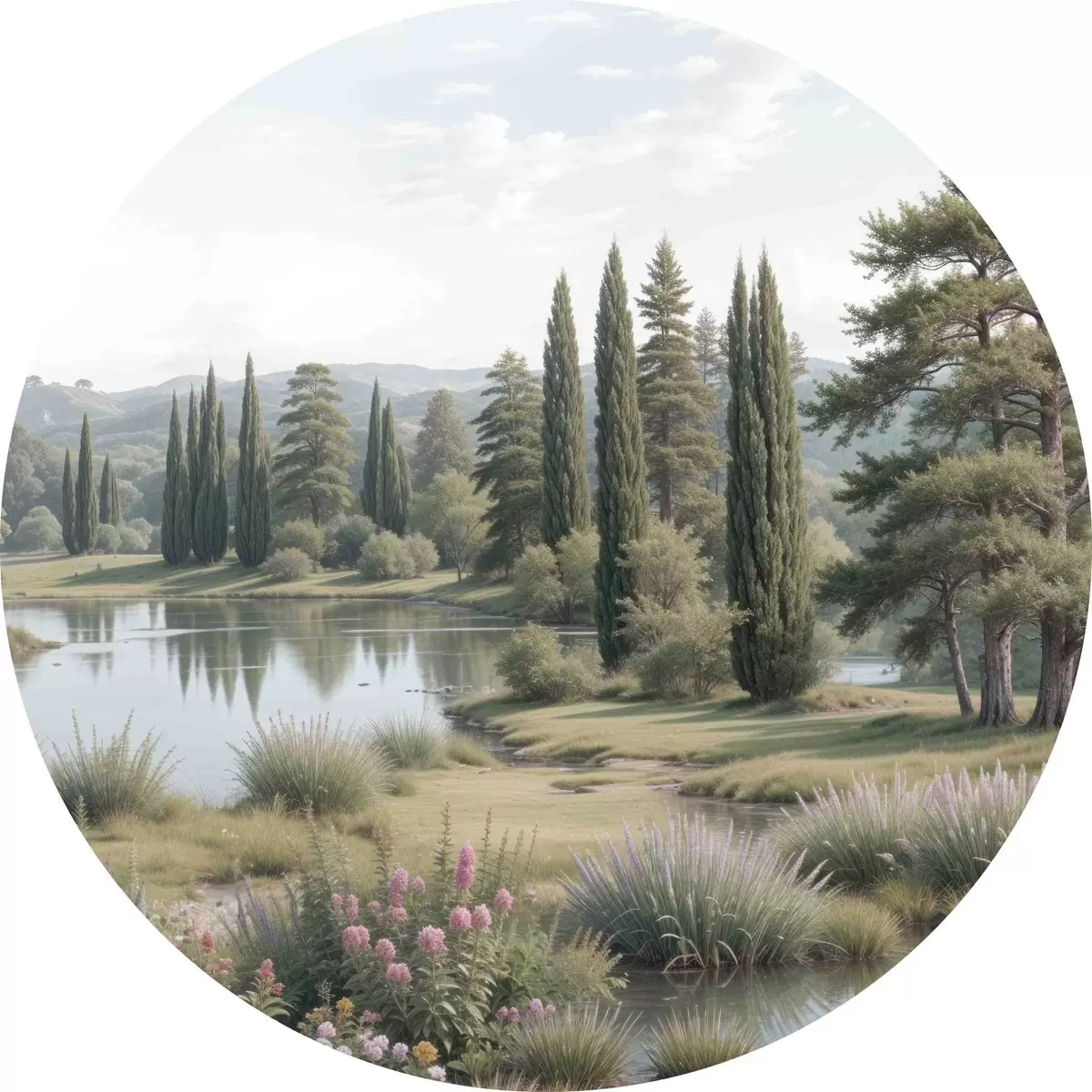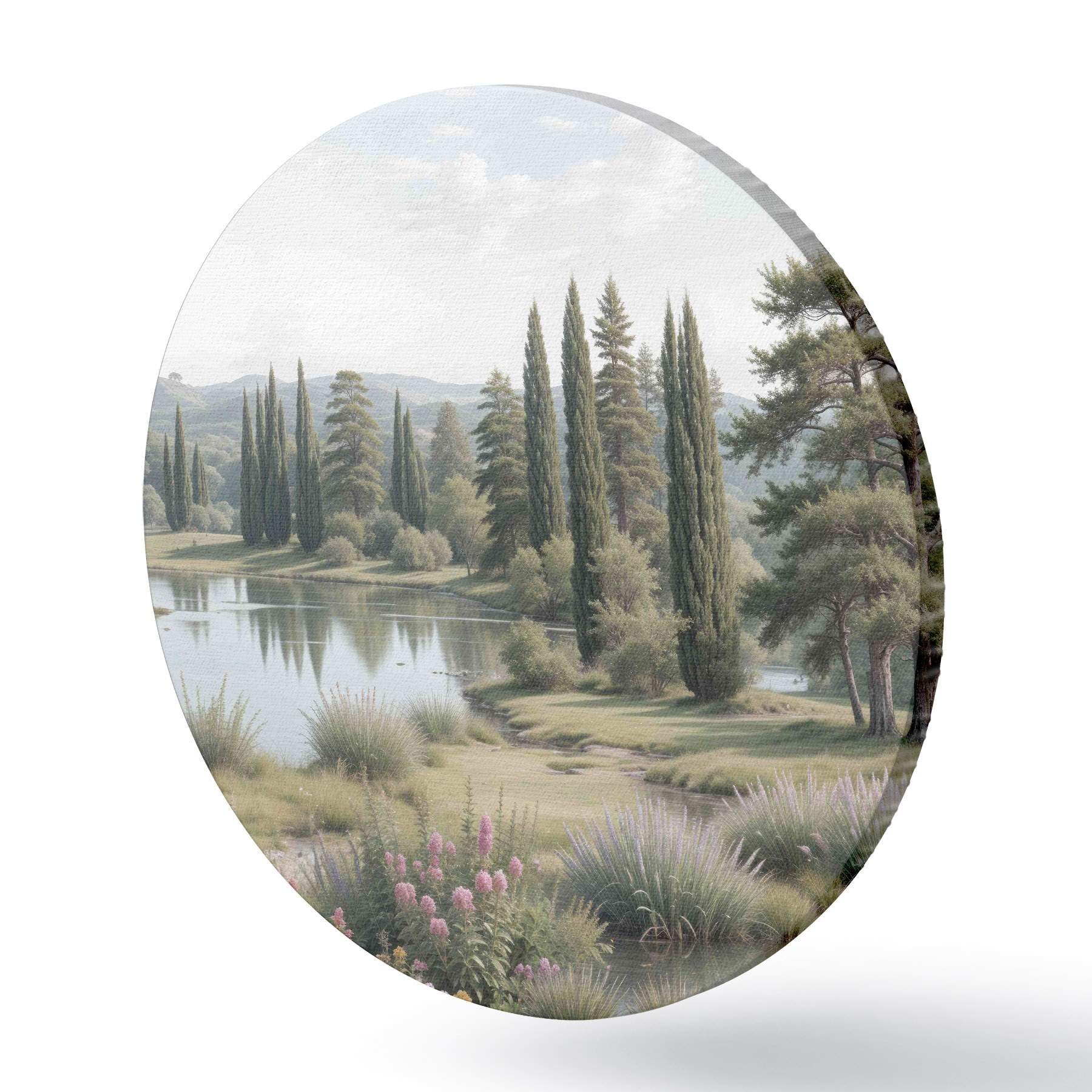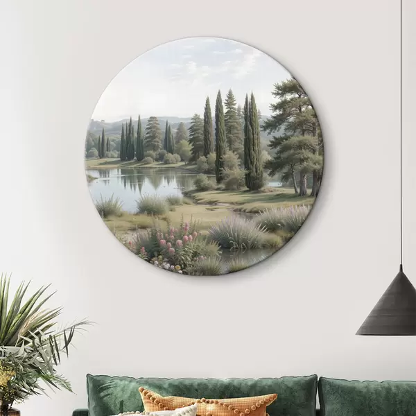 Ronde schilderijen Een vredig landschap met een rustig meer omringd door pijnbomen, cipressen en andere weelderige vegetatie r40579