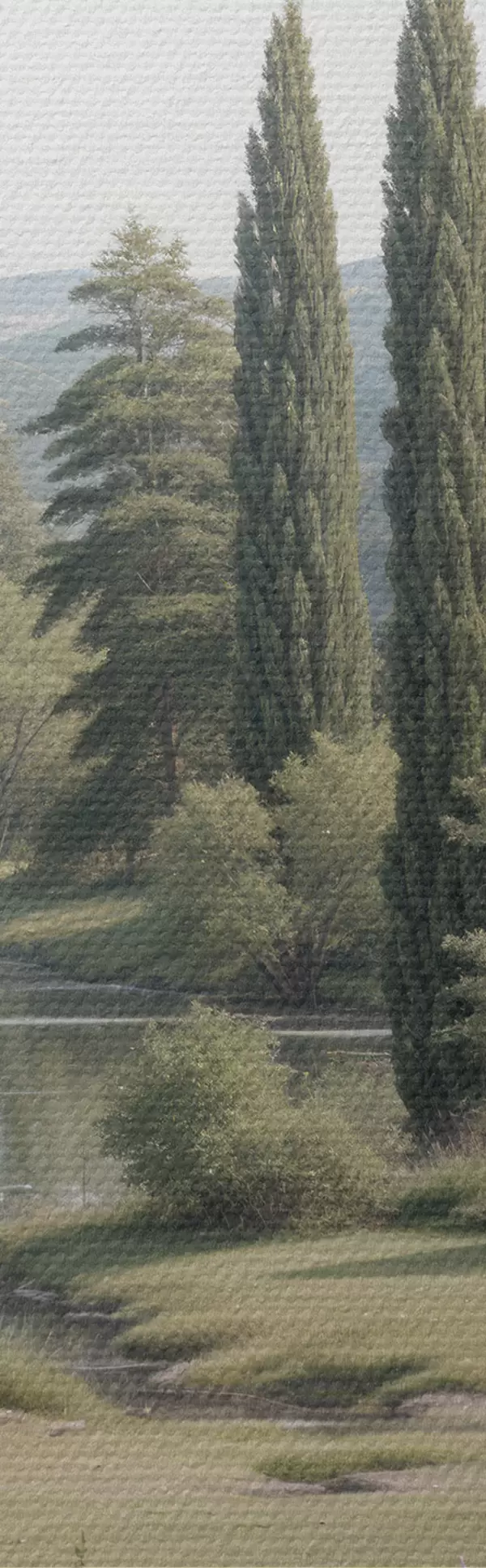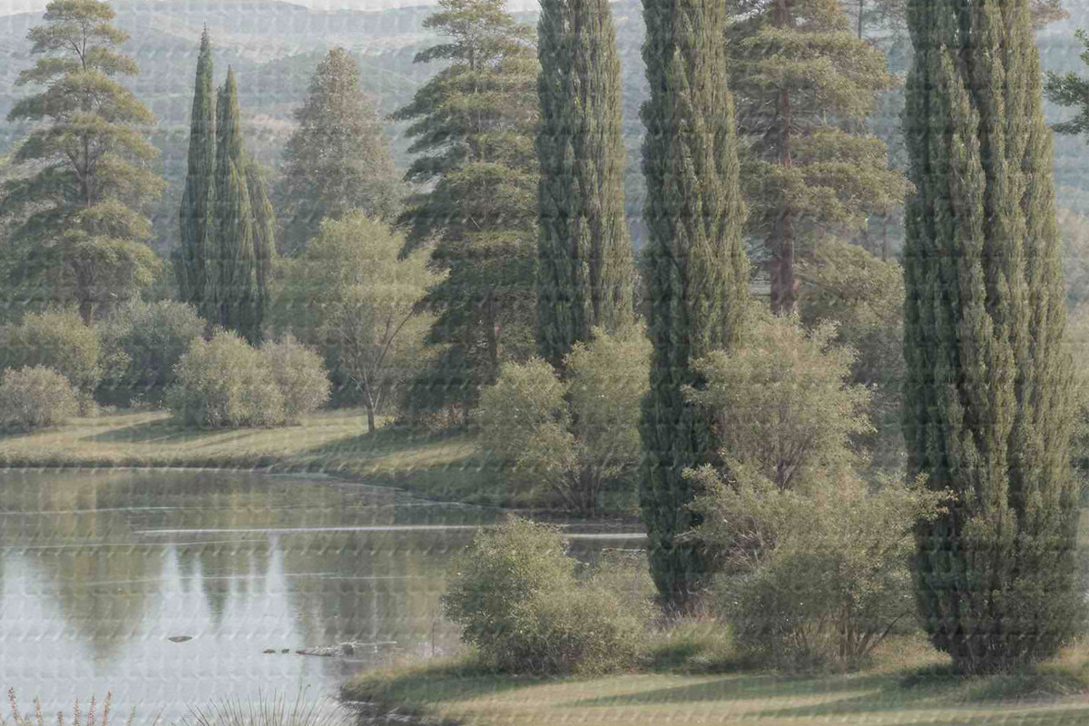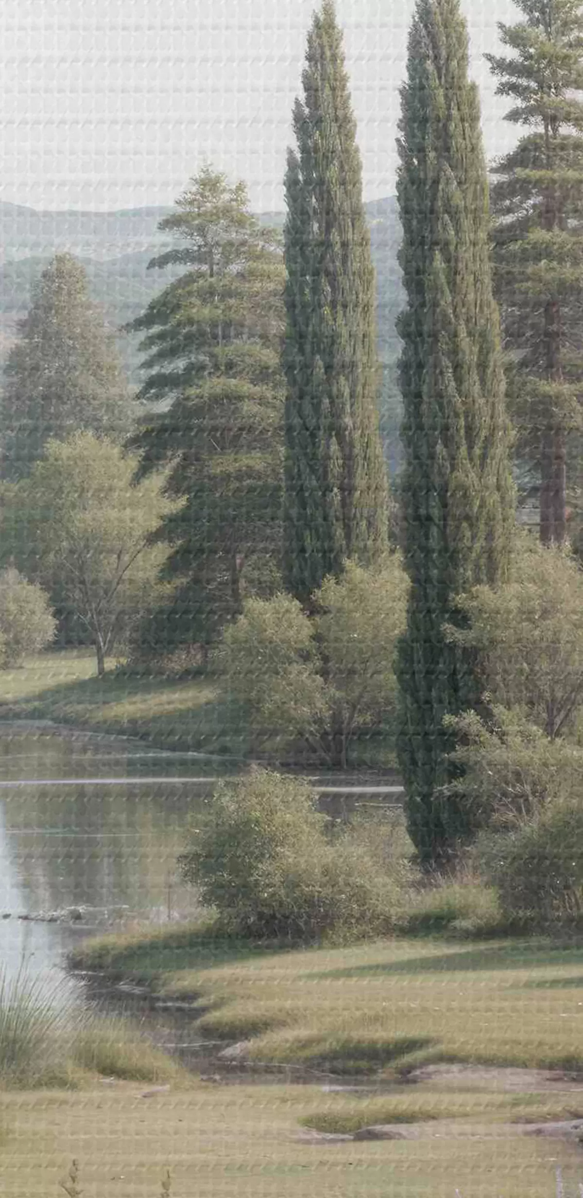 Afbeelding Een vredig landschap met een rustig meer omringd door pijnbomen, cipressen en andere weelderige vegetatie Nr r40579