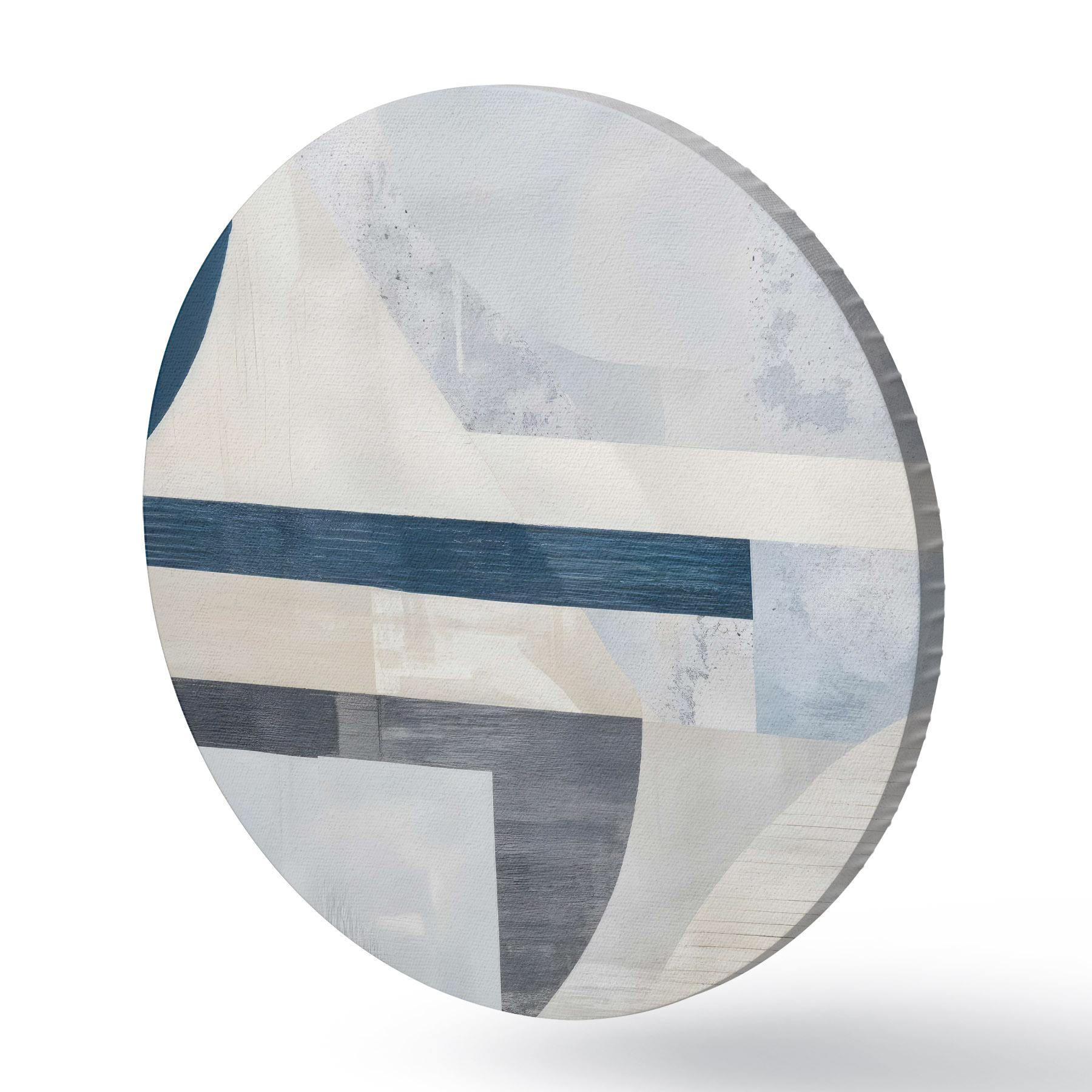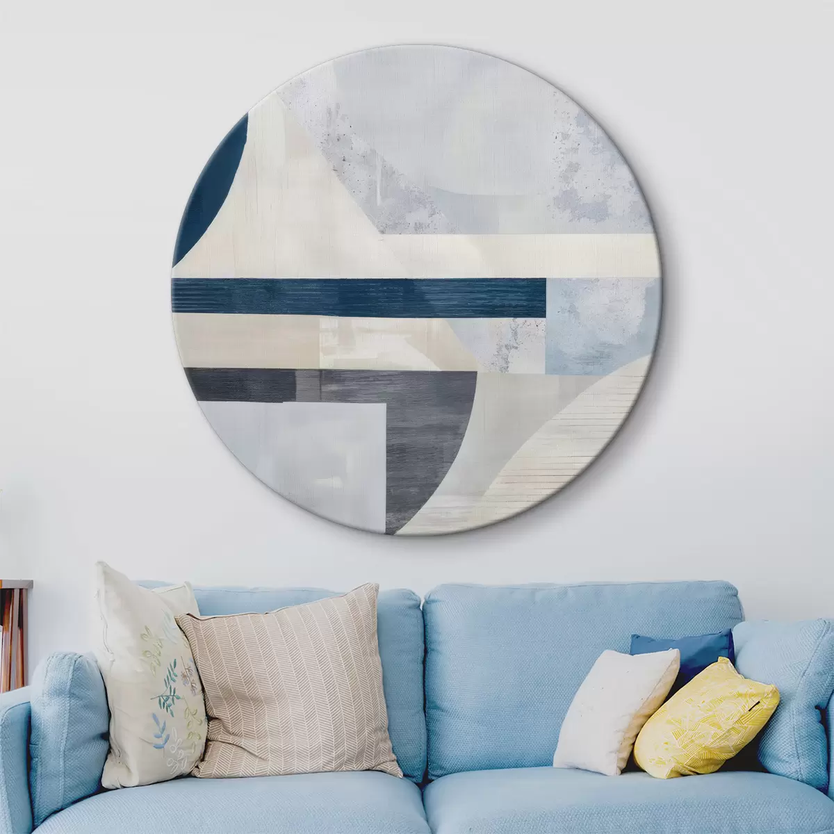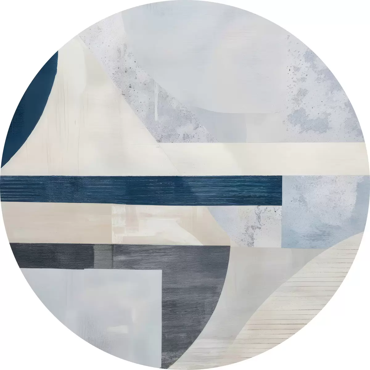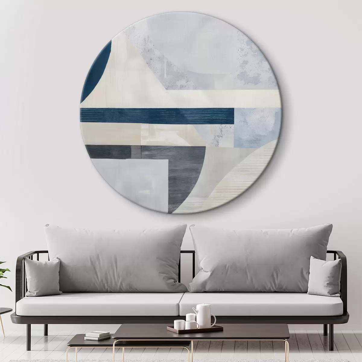 Ronde schilderijen Minimalistische abstractie met geometrische vormen en texturen in blauw-, grijs- en wittinten r40596