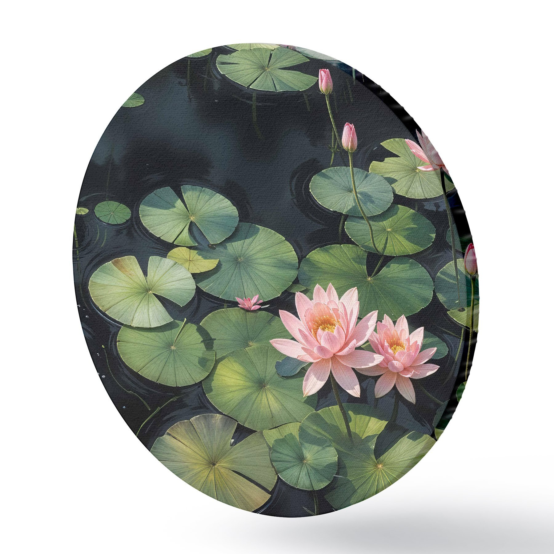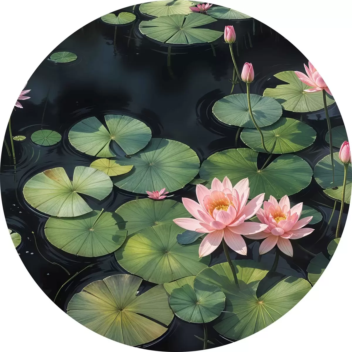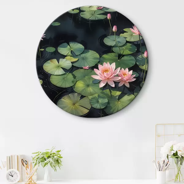 Ronde schilderijen Een vijver met roze waterlelies en groene lelieblaadjes drijvend op het oppervlak, omgeven door een donkere achtergrond r40598