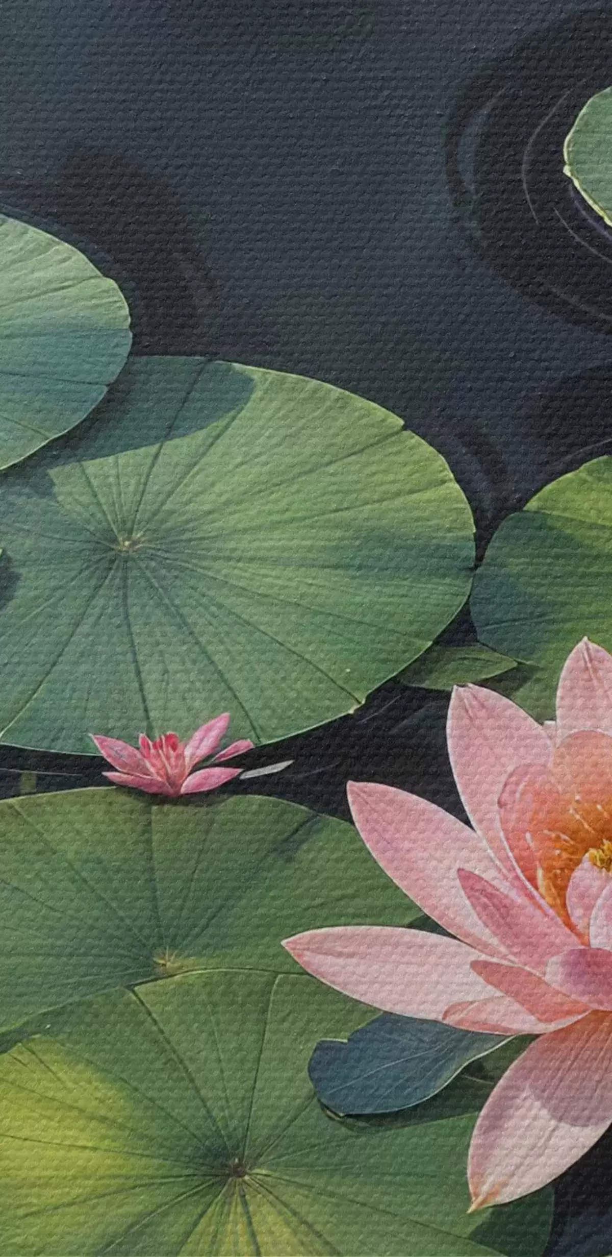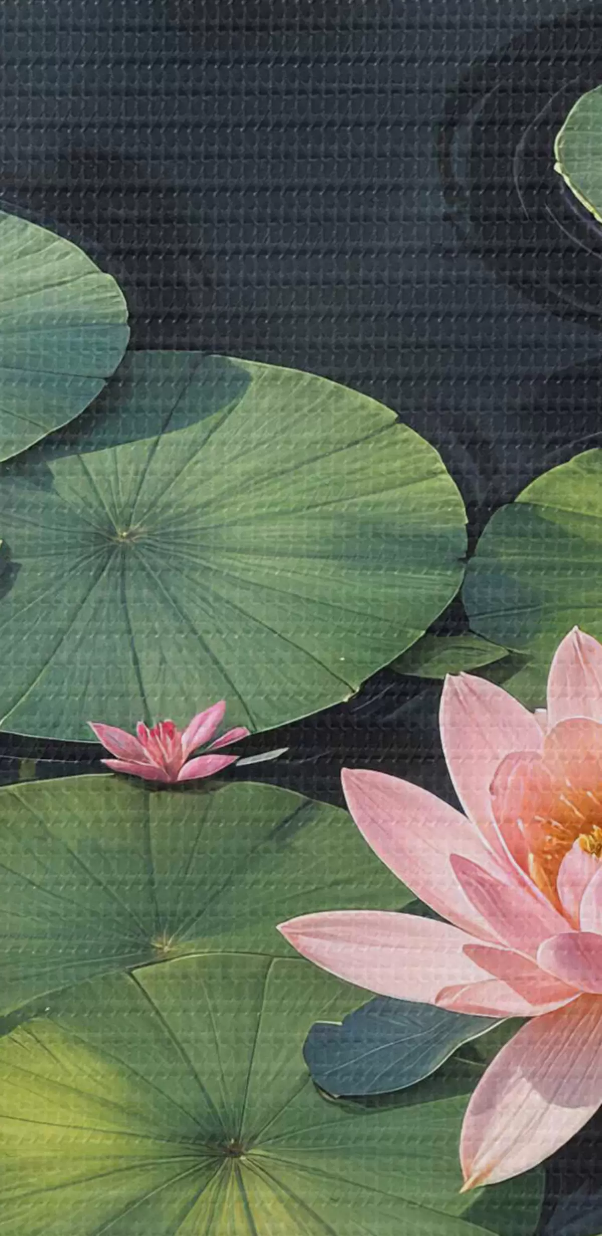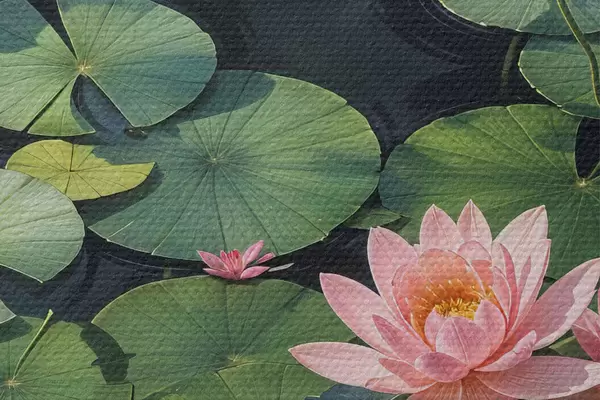 Afbeelding Een vijver met roze waterlelies en groene lelieblaadjes drijvend op het oppervlak, omgeven door een donkere achtergrond Nr r40598