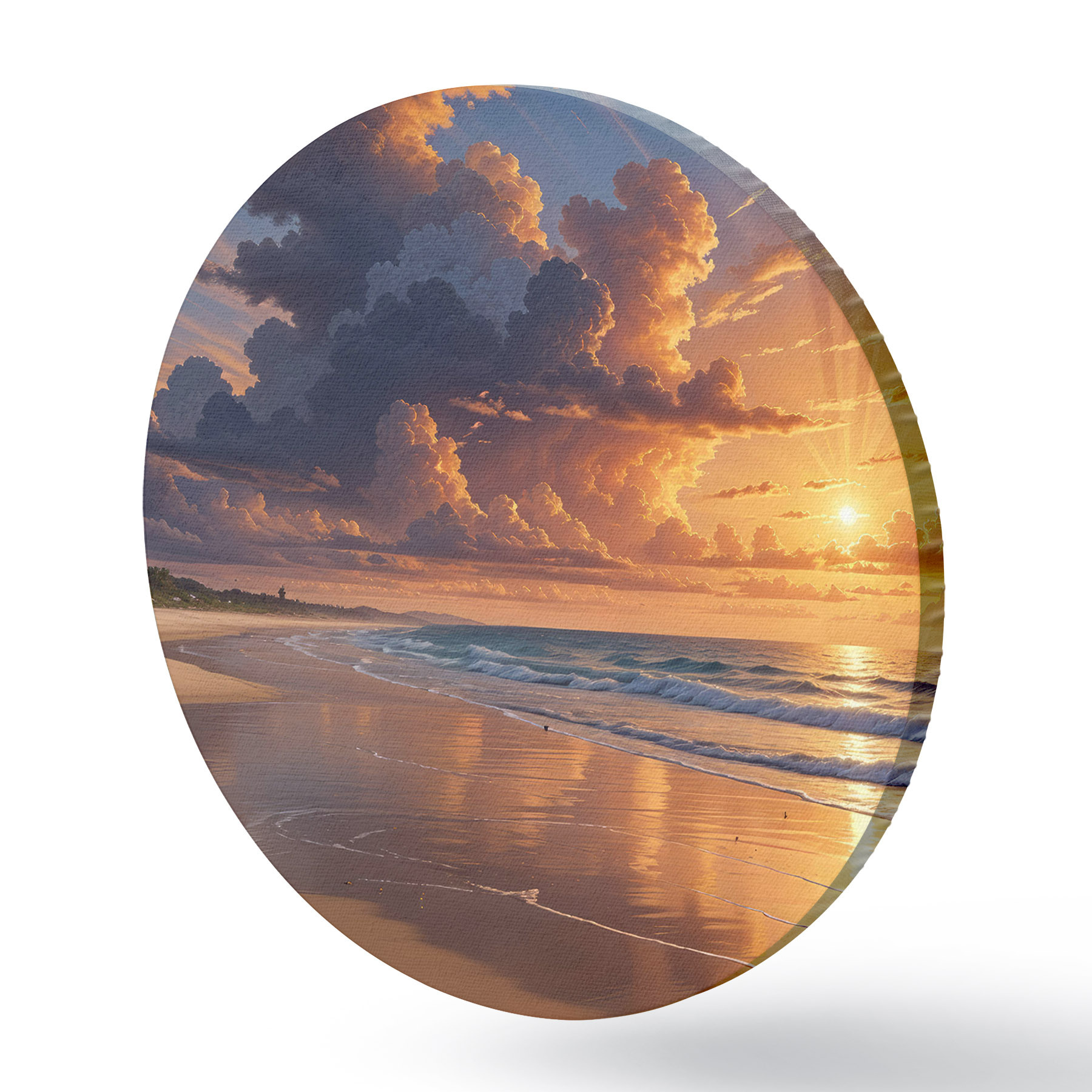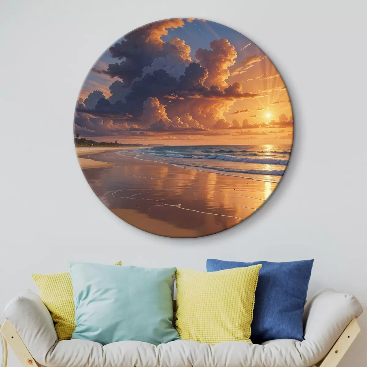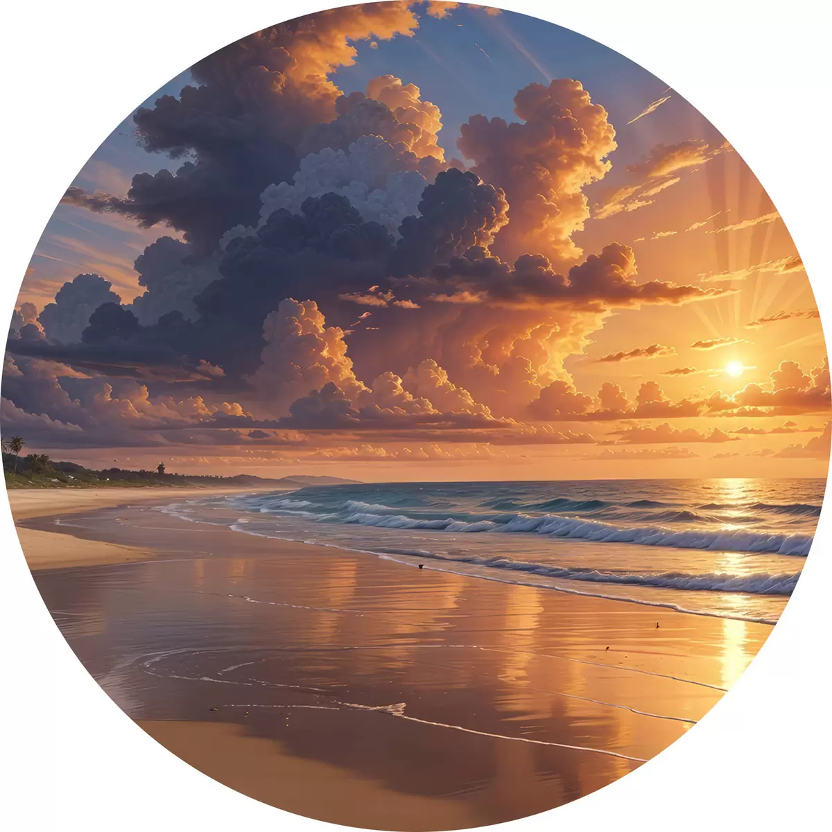 Ronde schilderijen Dramatische zonsondergang boven een tropisch strand, met levendige oranje en roze wolken die weerspiegelen in het kalme water r40599