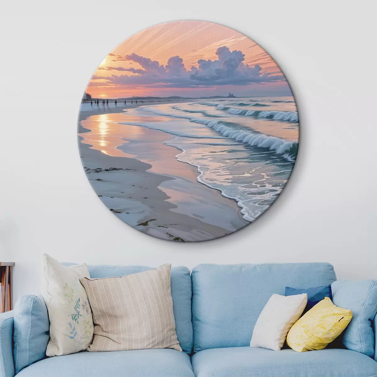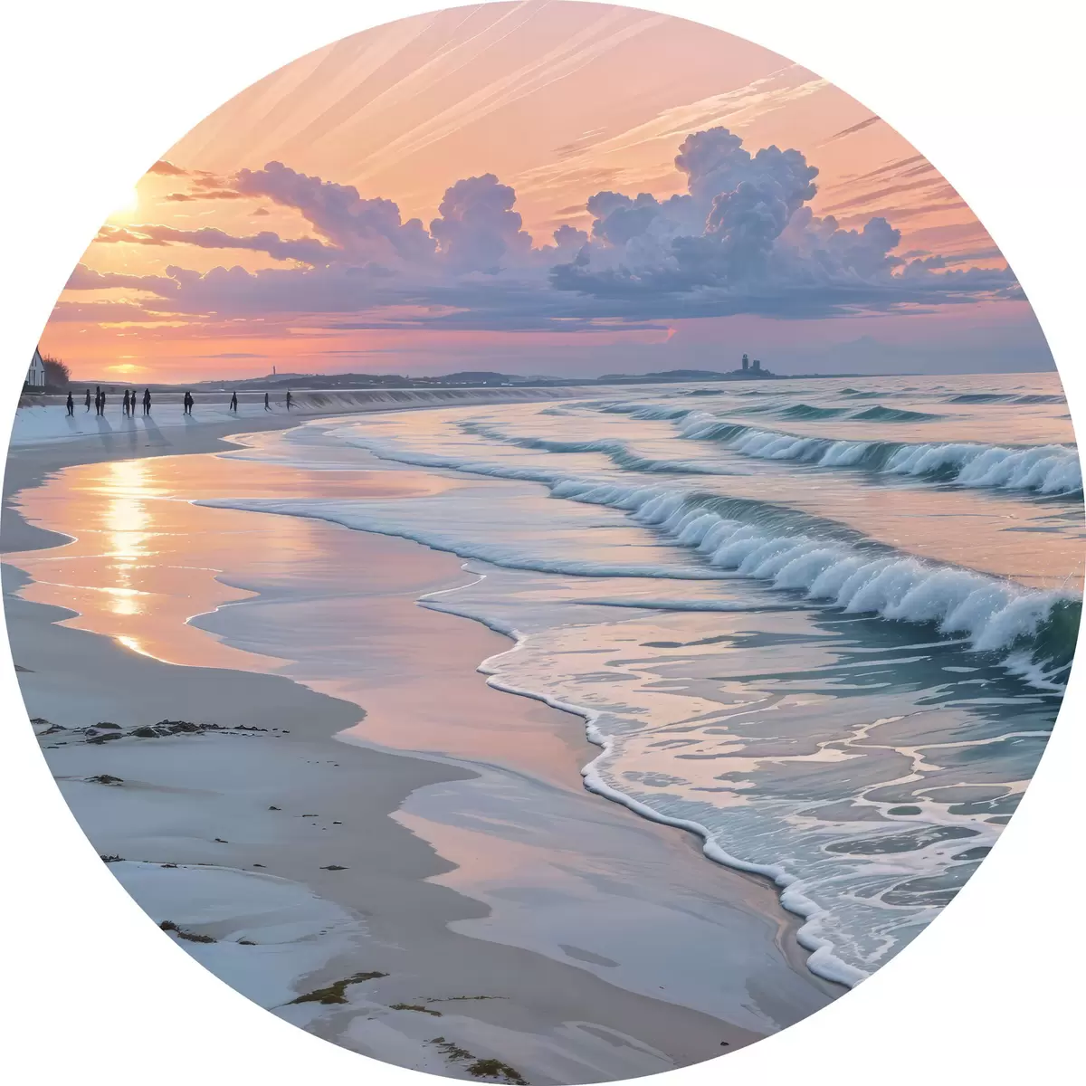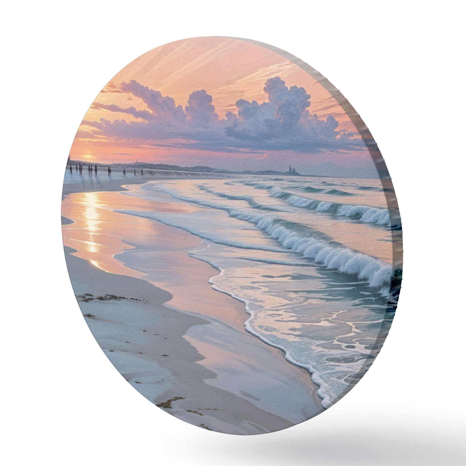 Ronde schilderijen Rustige scène op het strand bij zonsondergang, met kabbelende golven op de zandkust r40606