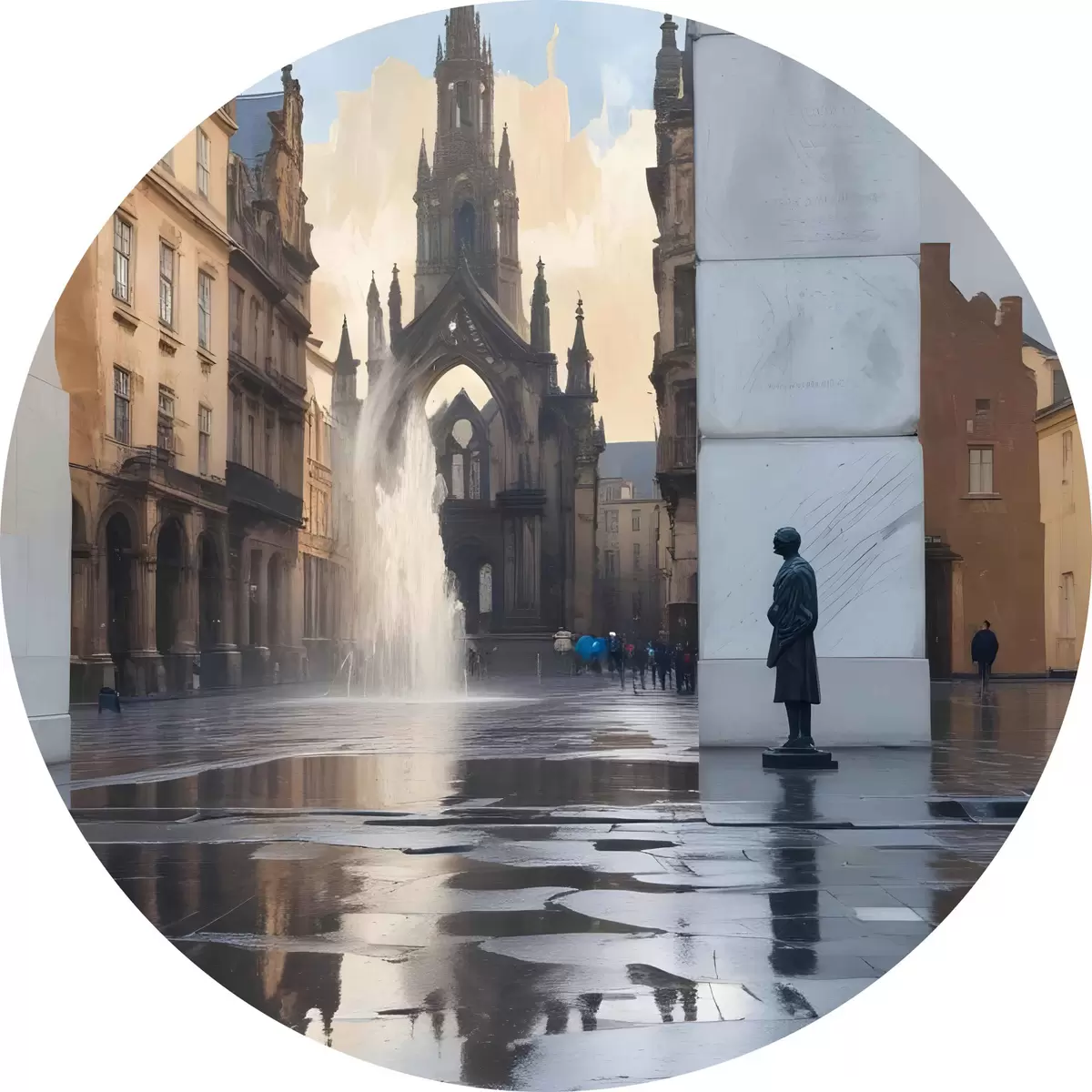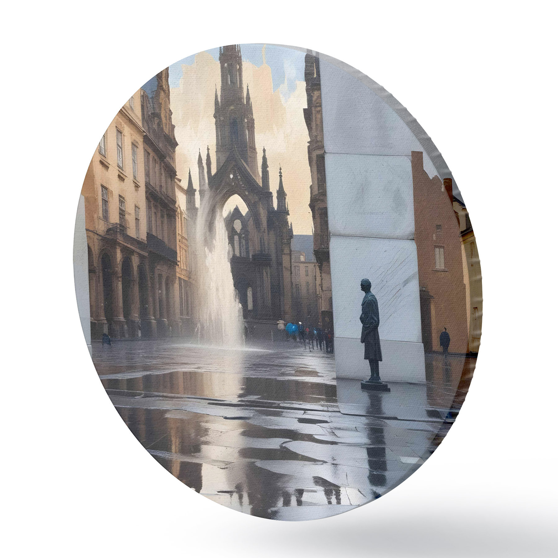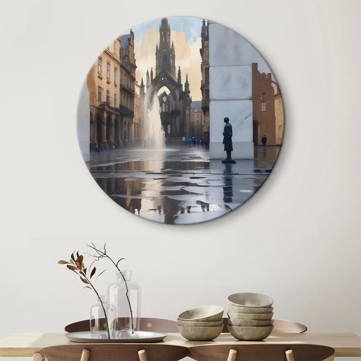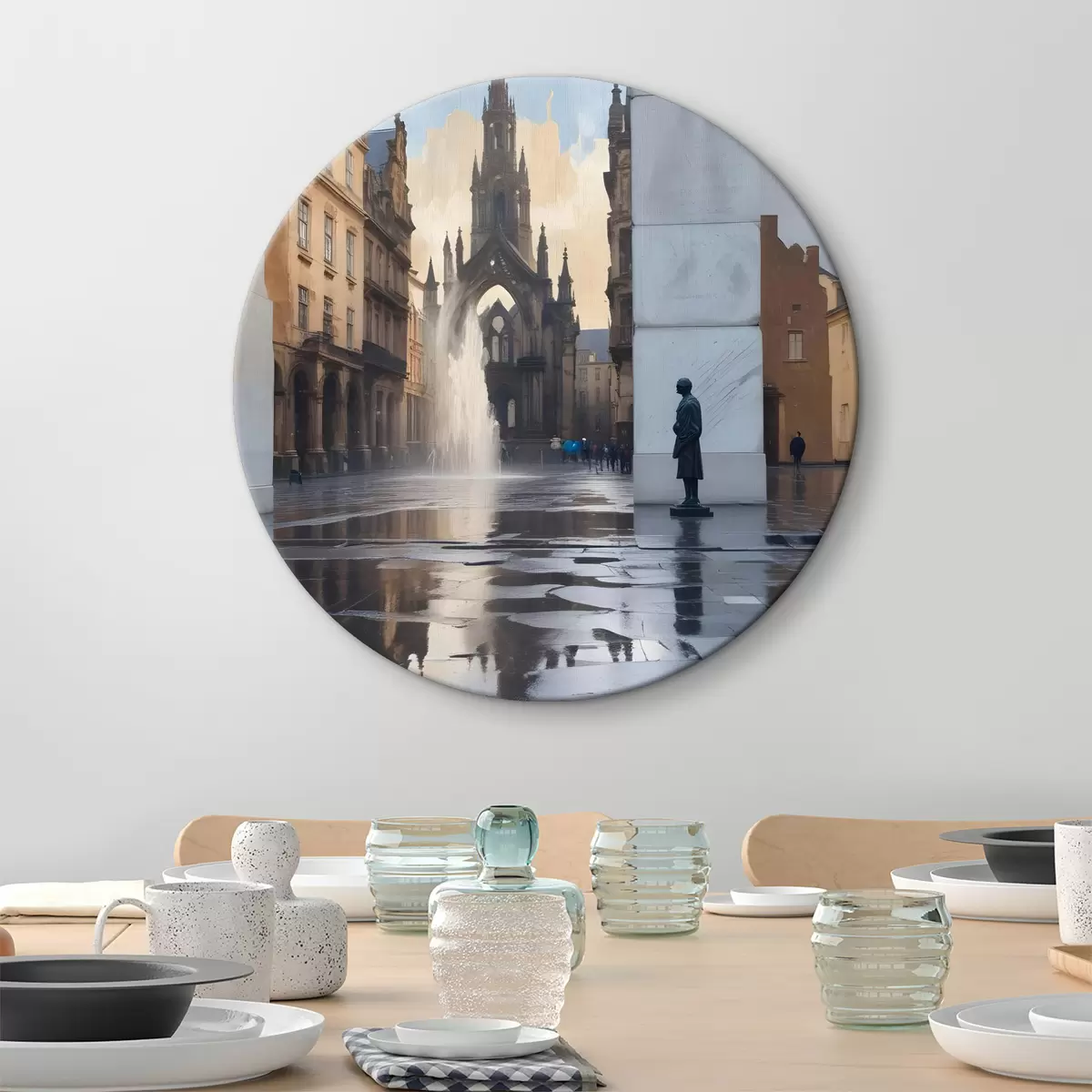 Ronde schilderijen Een middeleeuwse kathedraal met gotische architectuur staat op de achtergrond, de torenspitsen reiken naar de hemel r40611