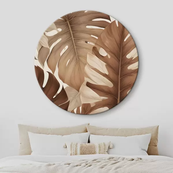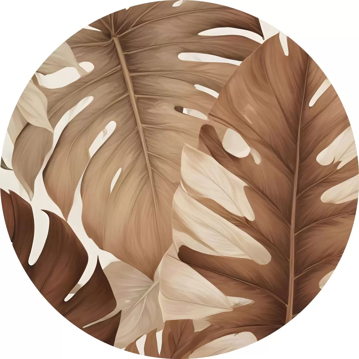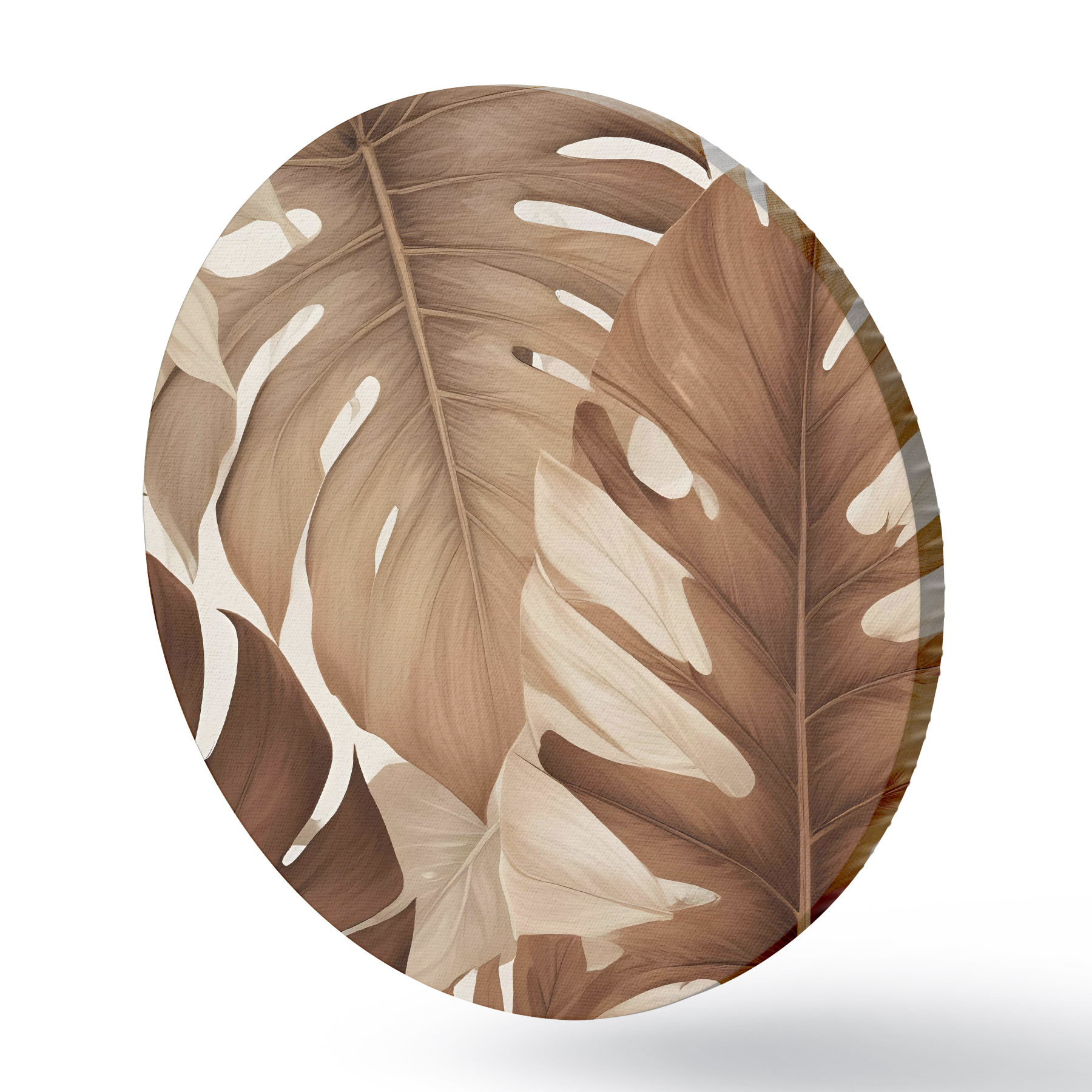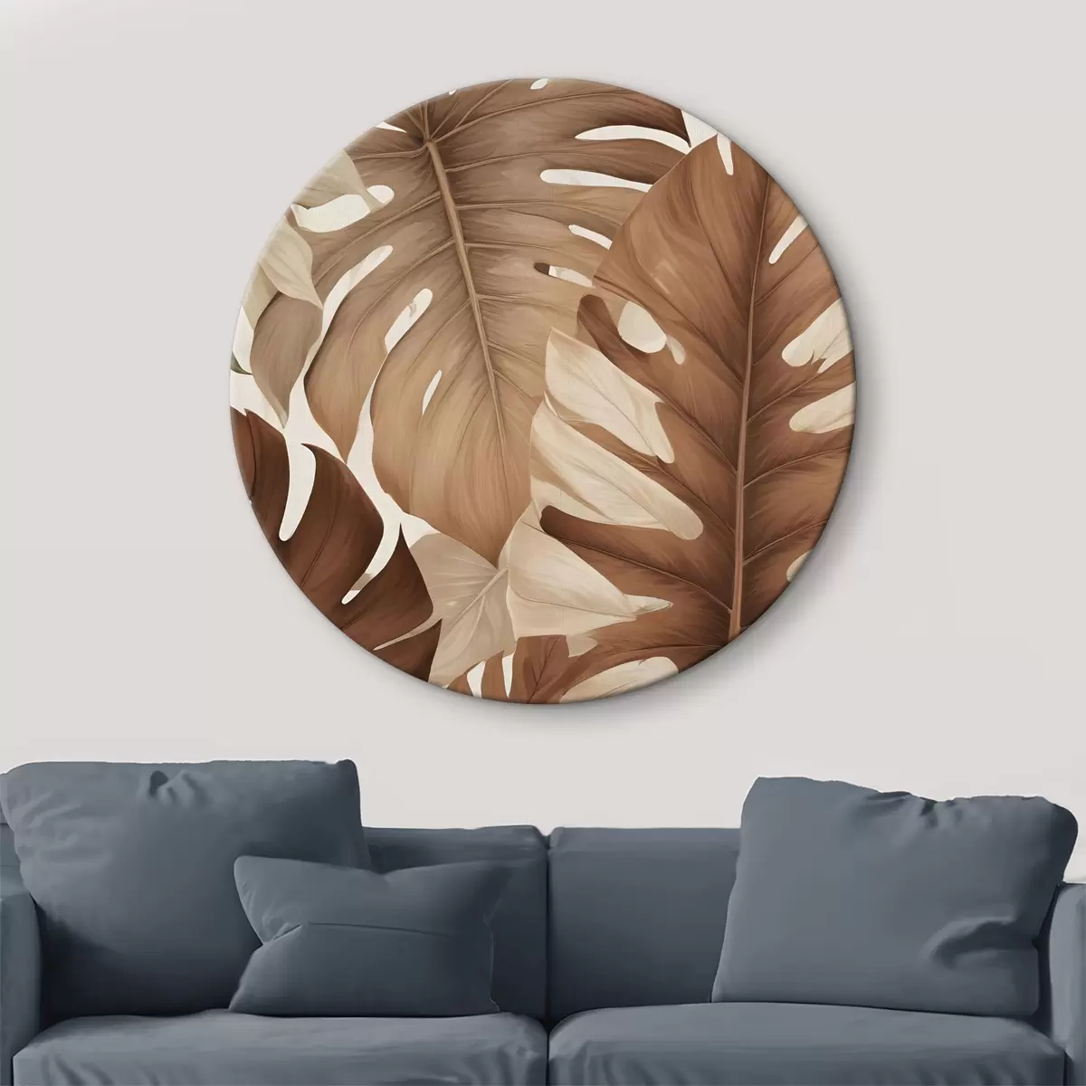 Ronde schilderijen Een print van tropische bladeren met een natuurlijke, organische textuur in bruin- en beigetinten r40613