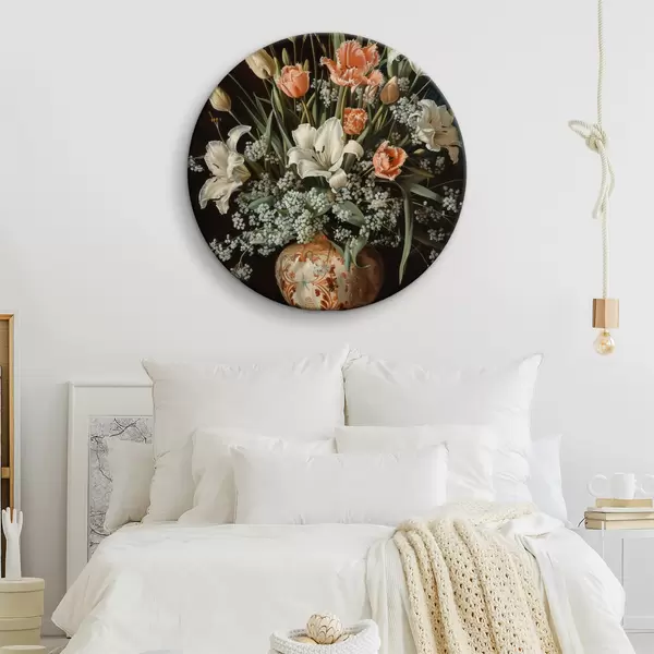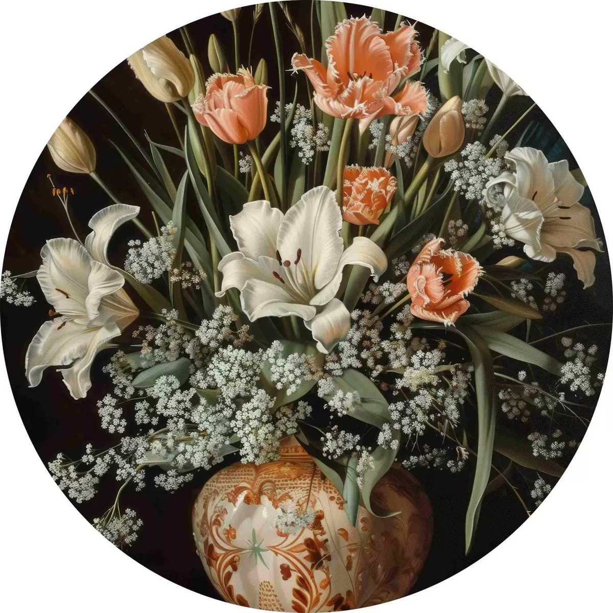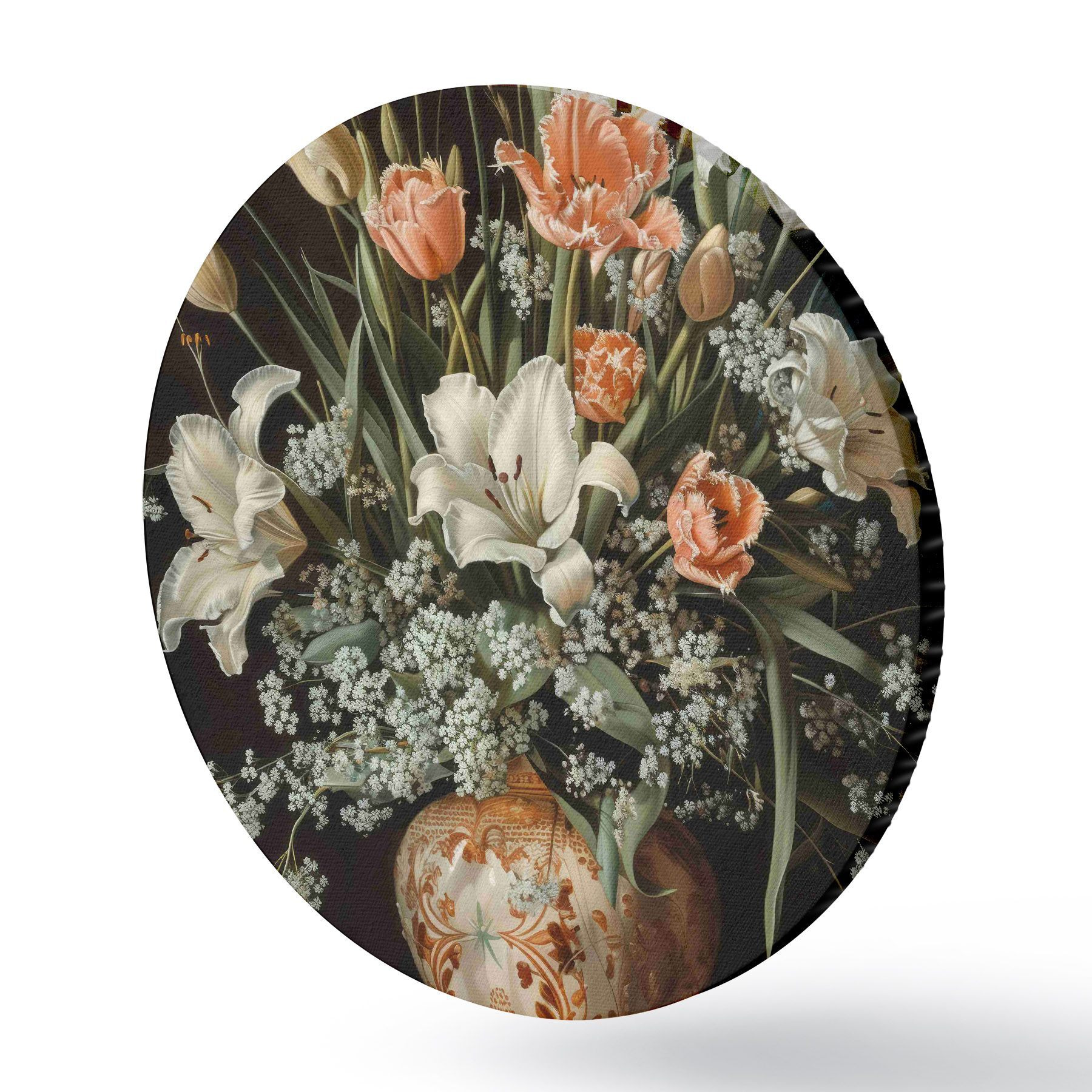 Ronde schilderijen Extravagant barok stilleven voorstellende een vaas gevuld met tulpen, anjers en hyacinten, imitatie van een olieverfschilderij r40658