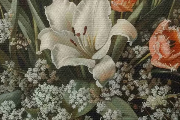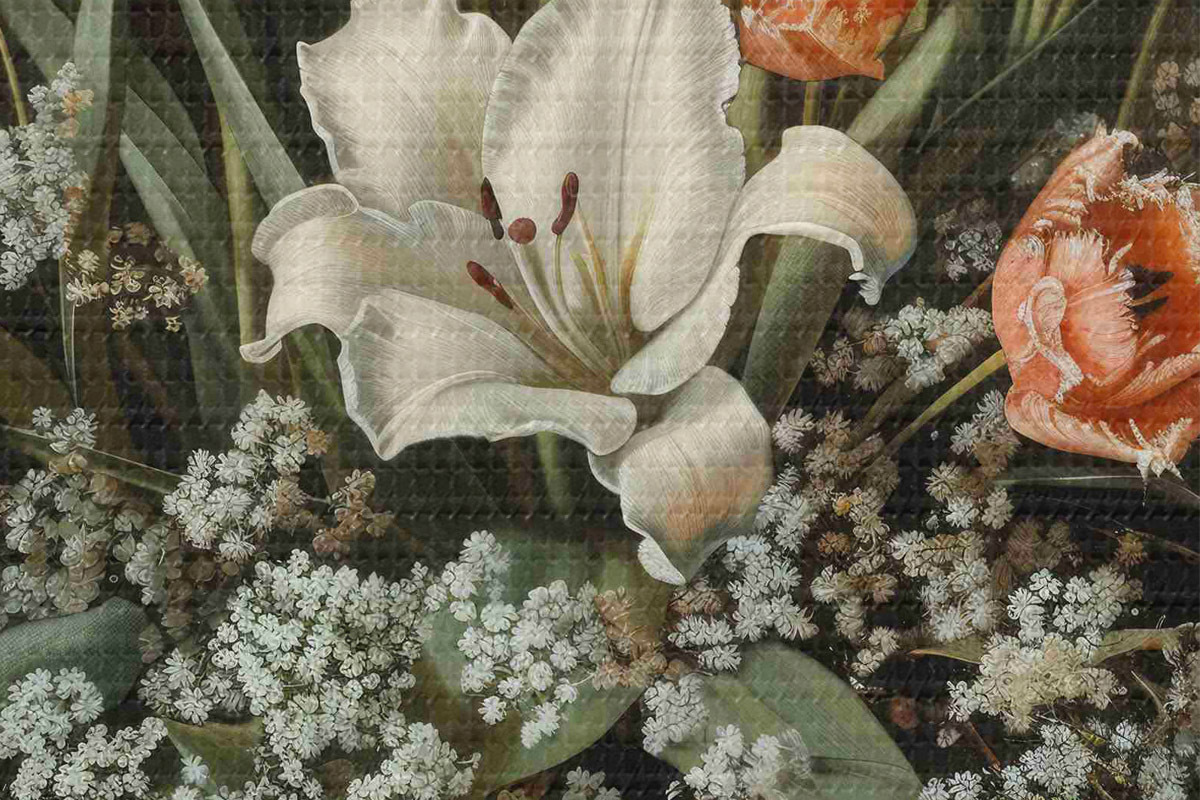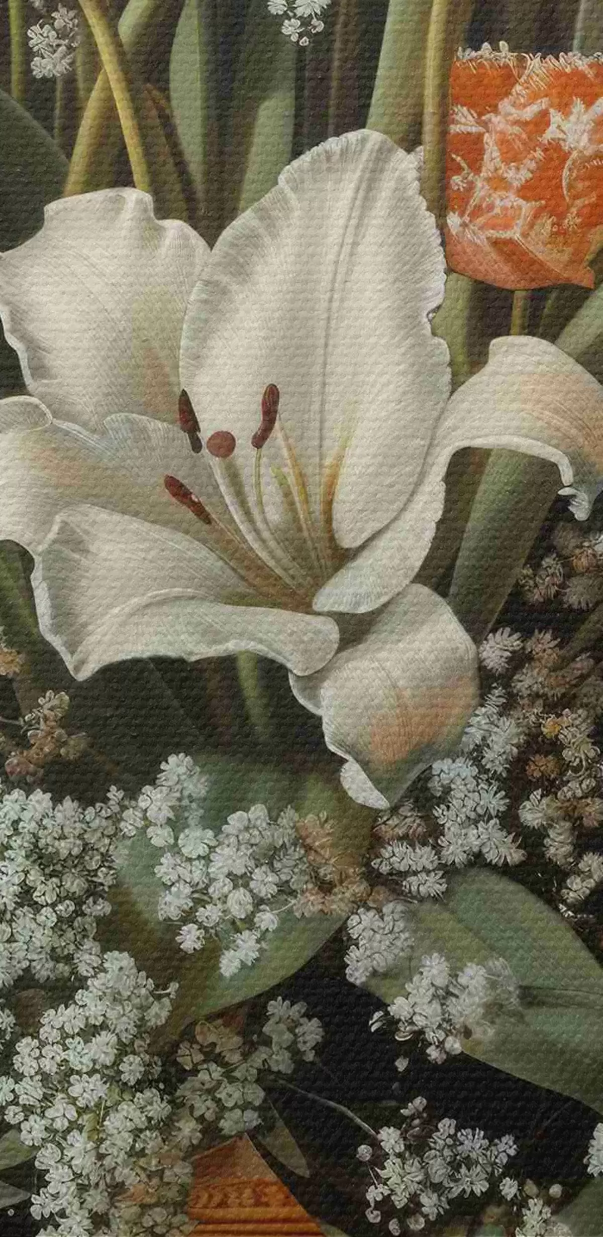 Afbeelding Extravagant barok stilleven voorstellende een vaas gevuld met tulpen, anjers en hyacinten, imitatie van een olieverfschilderij Nr r40658
