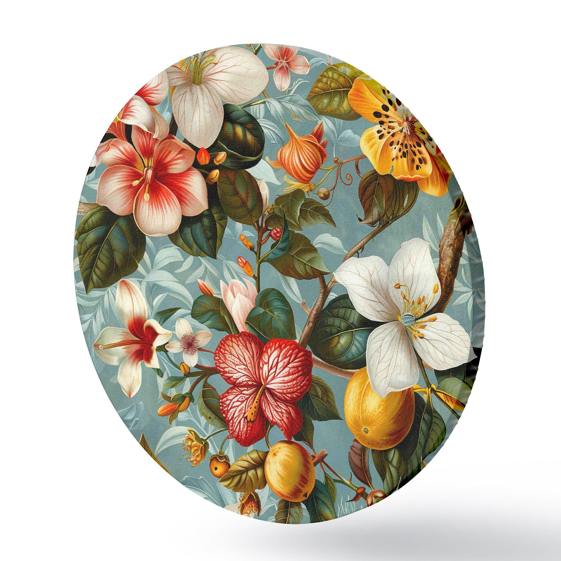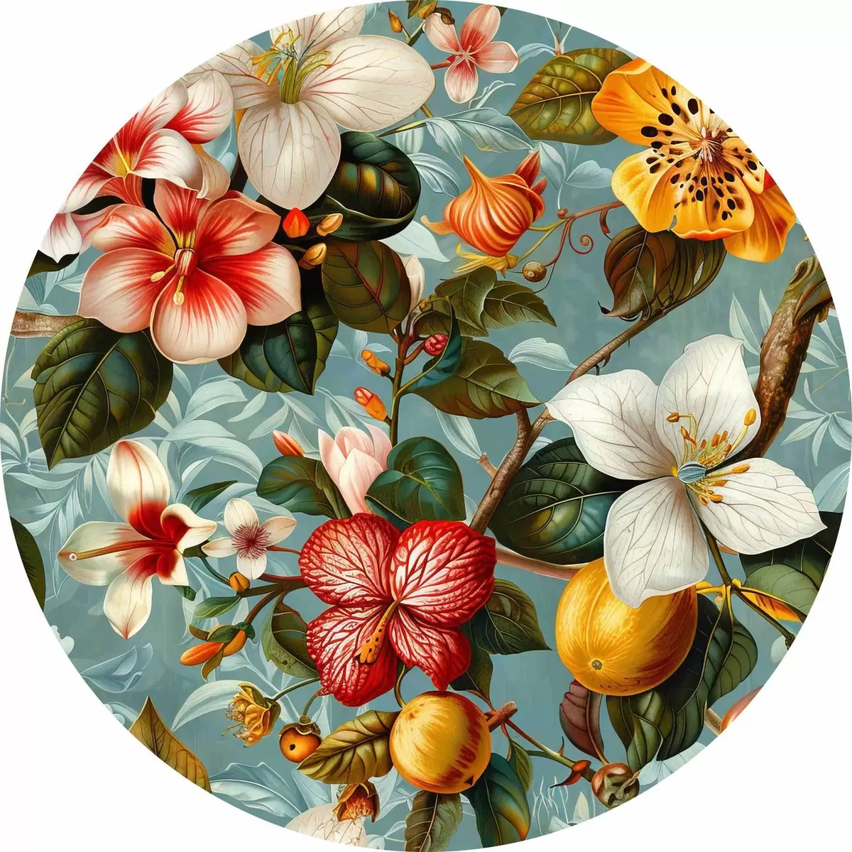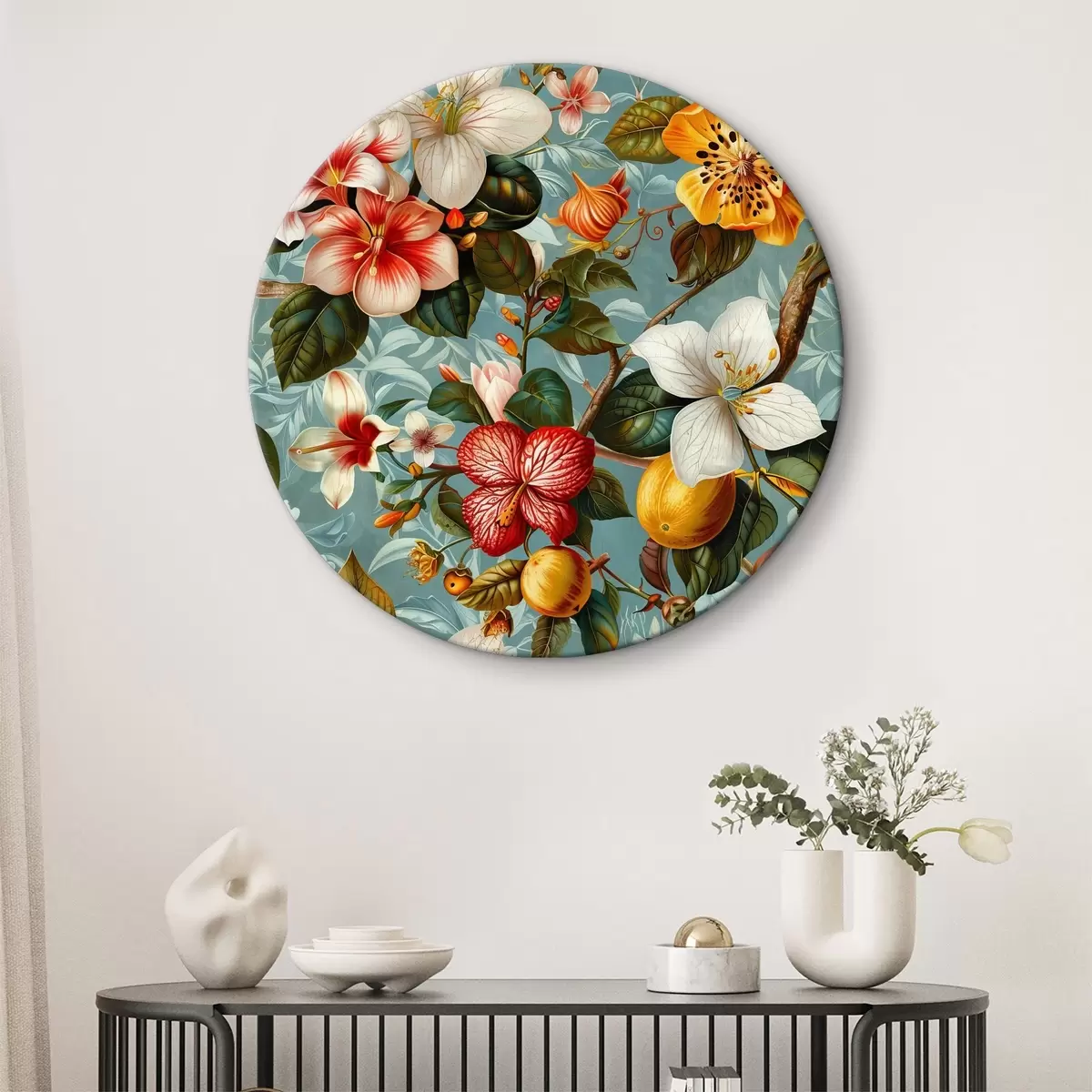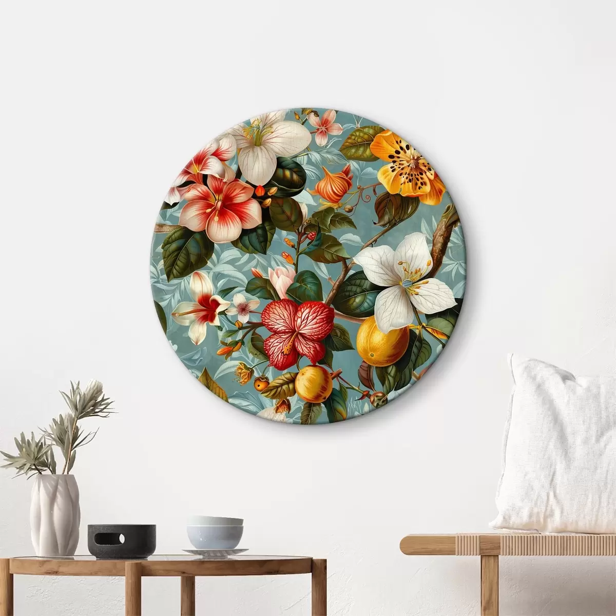 Ronde schilderijen Compositie met divers groen en tropische bloemen op een blauwe achtergrond r40668