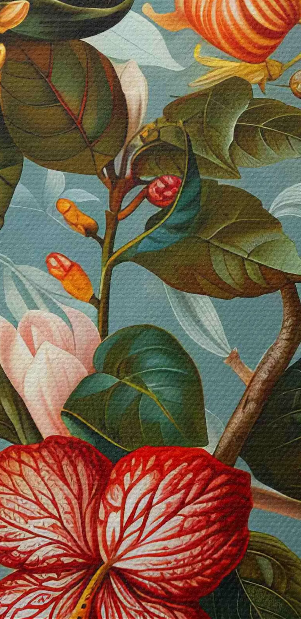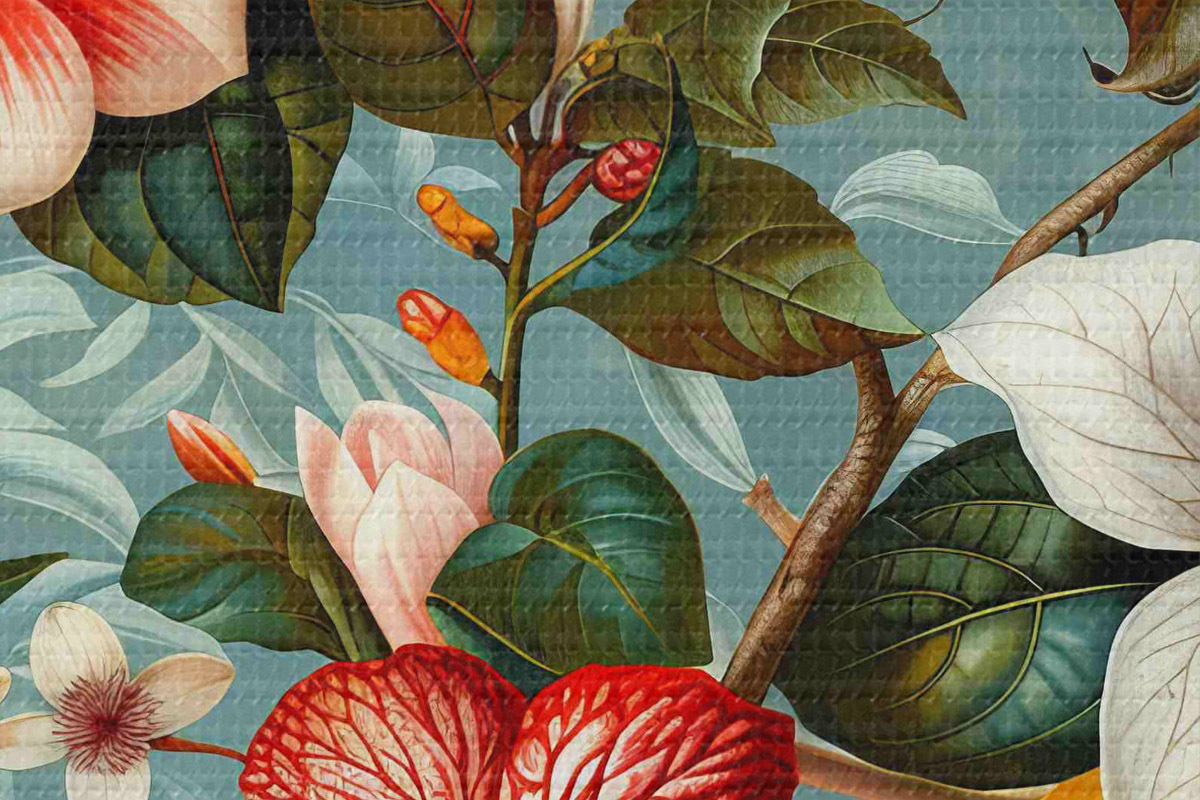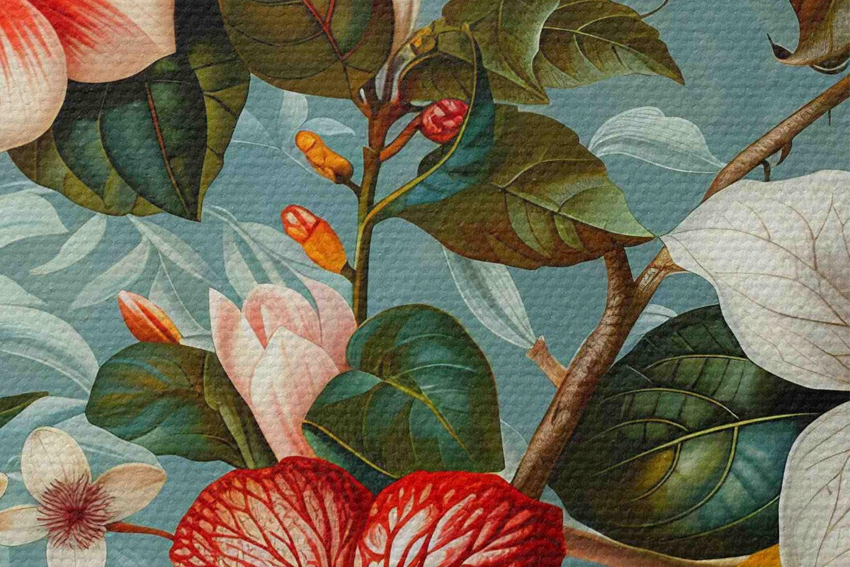 Afbeelding Compositie met divers groen en tropische bloemen op een blauwe achtergrond Nr r40668