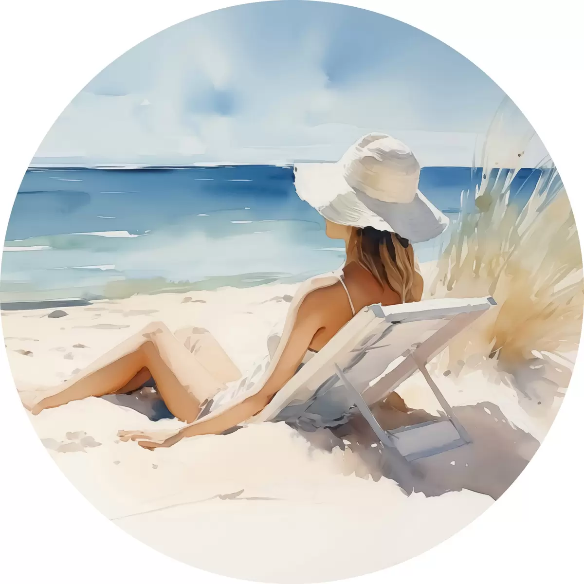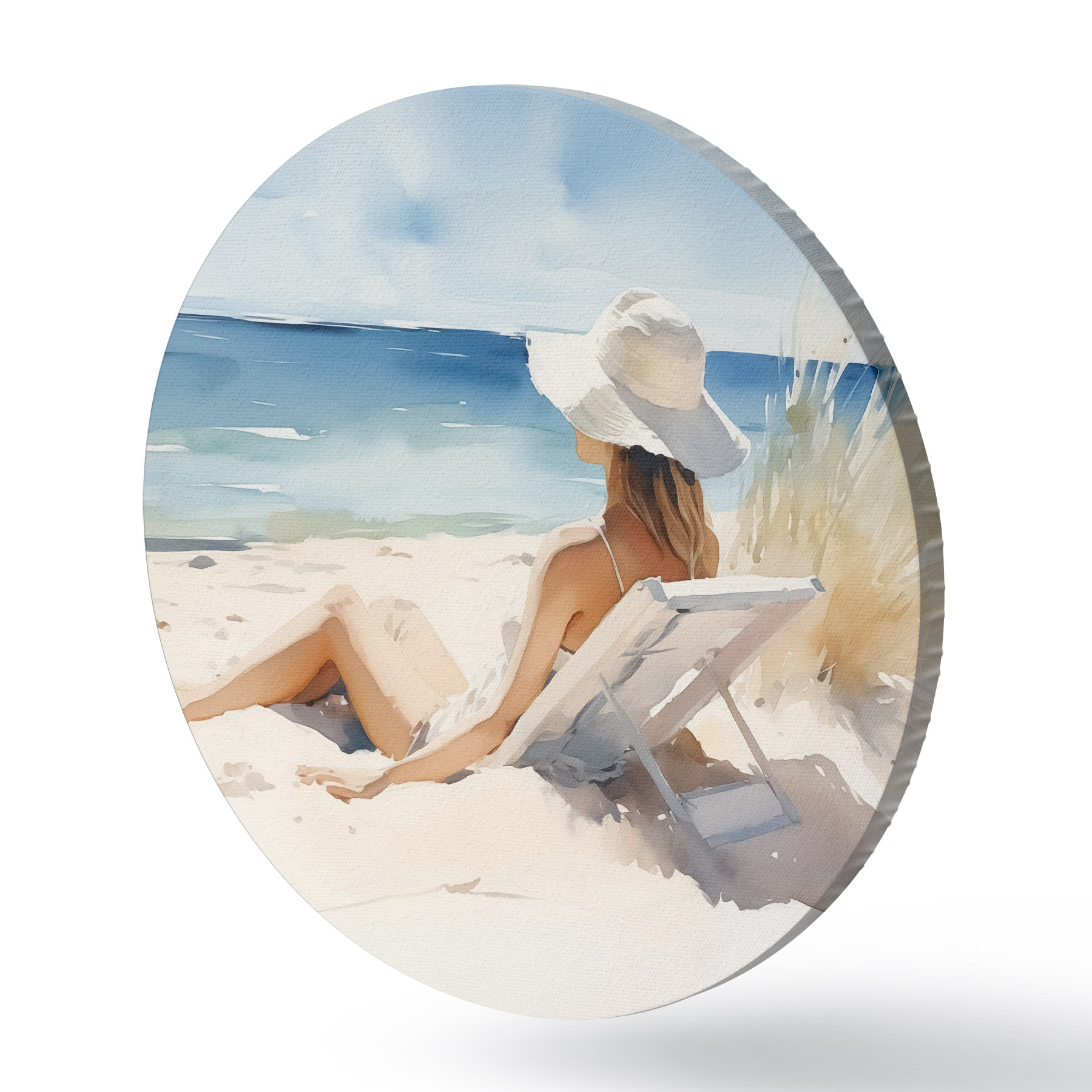 Ronde schilderijen Meisje ontspannend op het strand bij de zee aquarel r40679