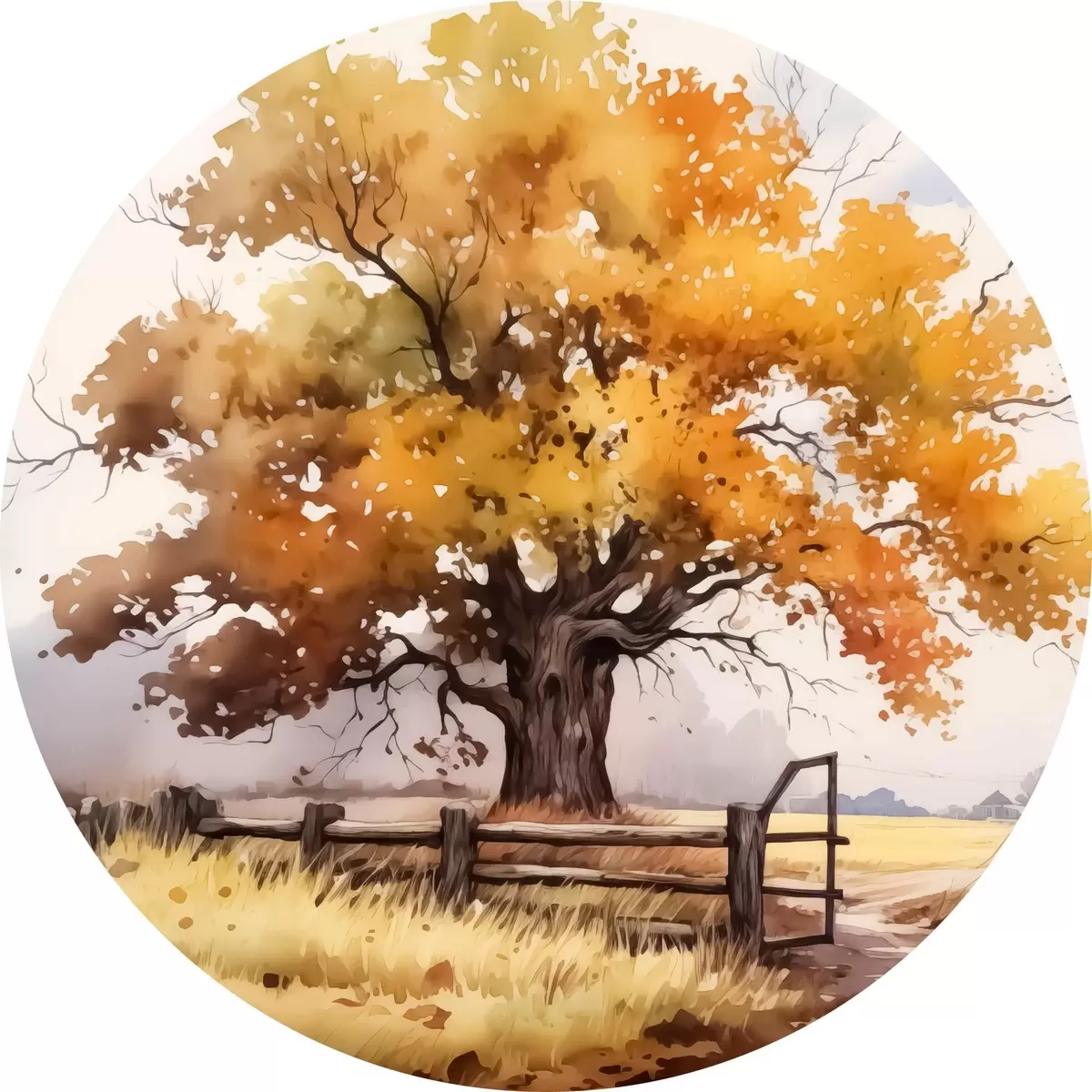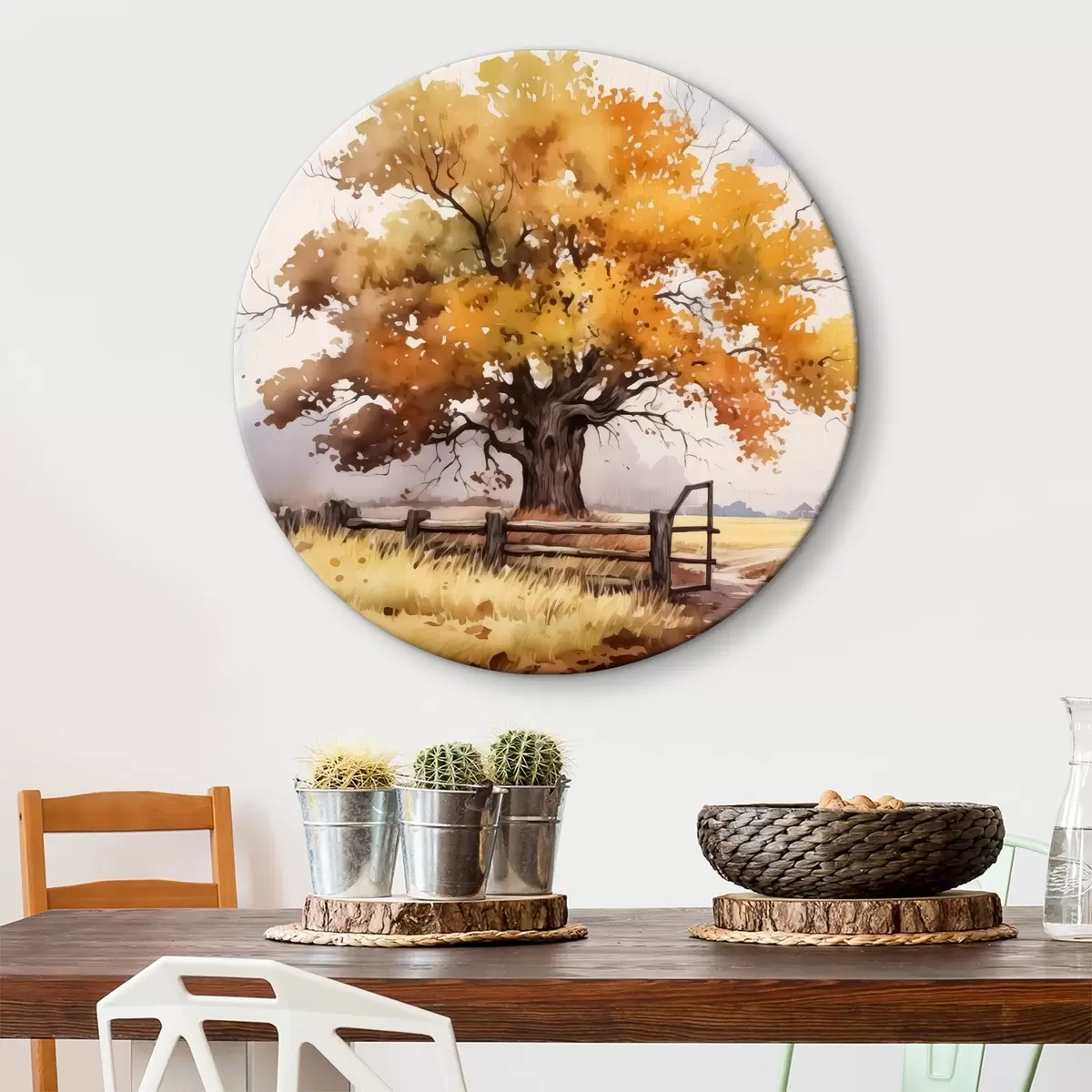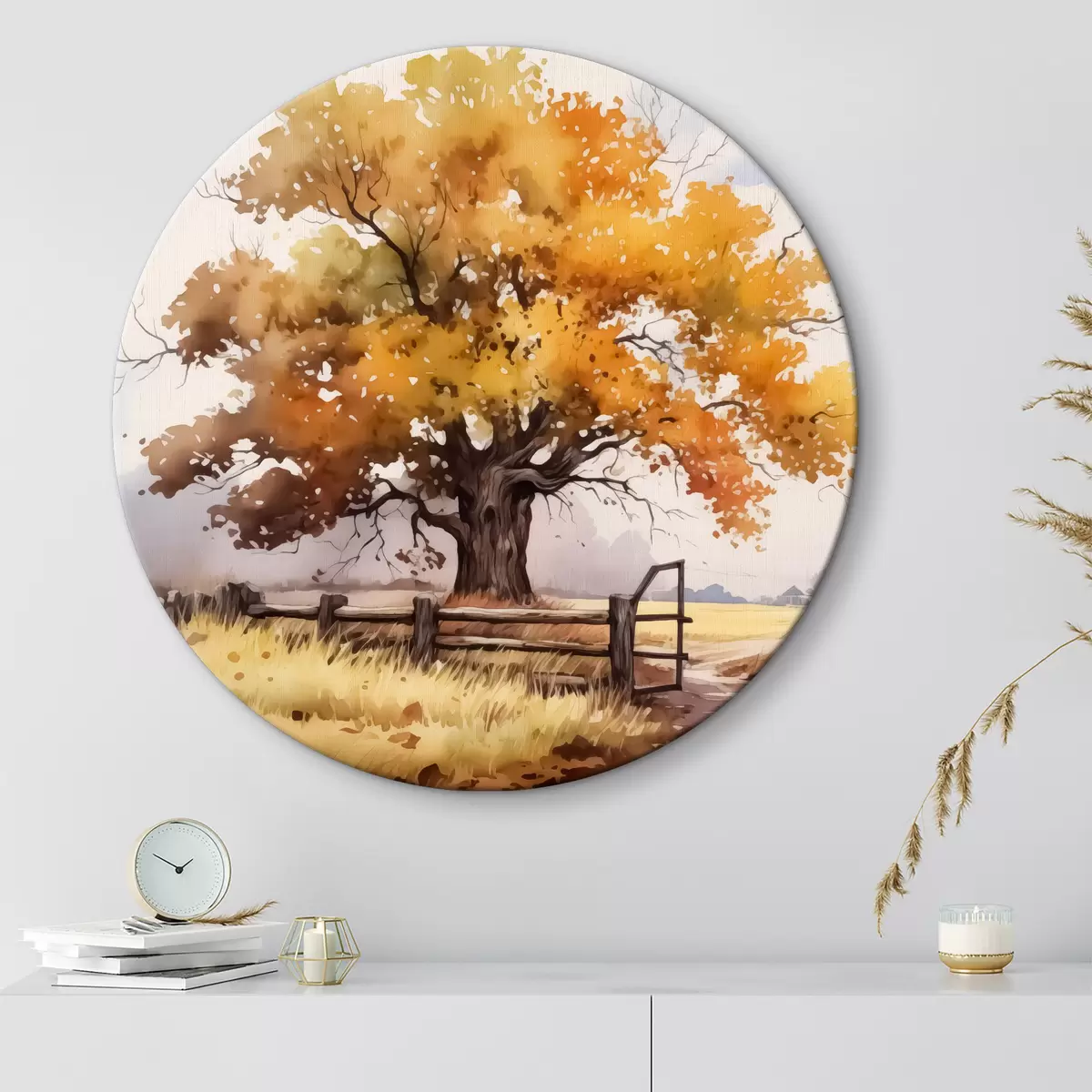 Ronde schilderijen Boom in het veld bij het hek met vergeelde bladeren, herfstlandschap r40680