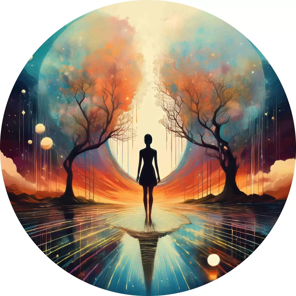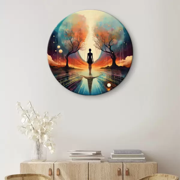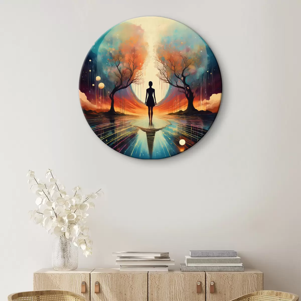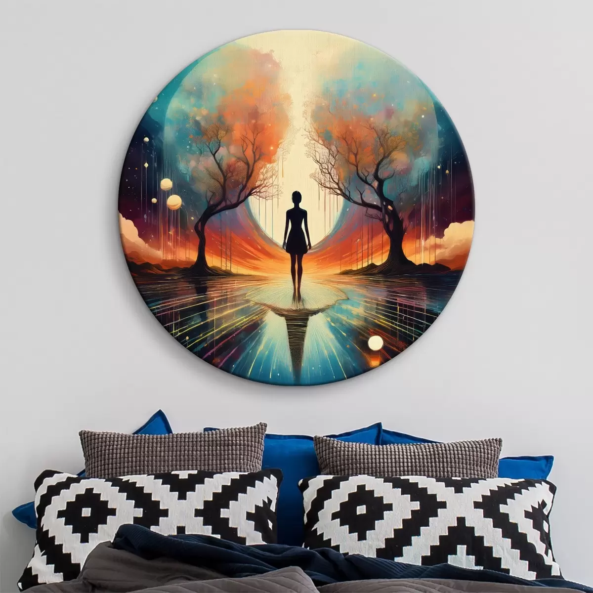 Ronde schilderijen silhouet tussen bomen, zelfbewustzijn, zelfreflectie r40713