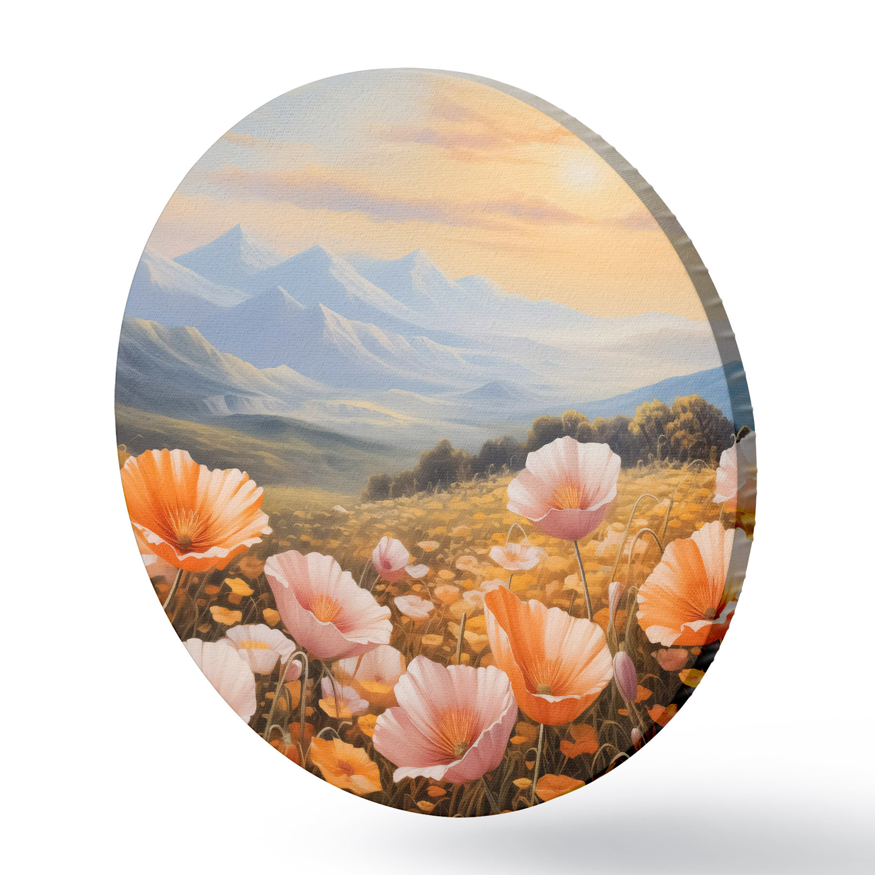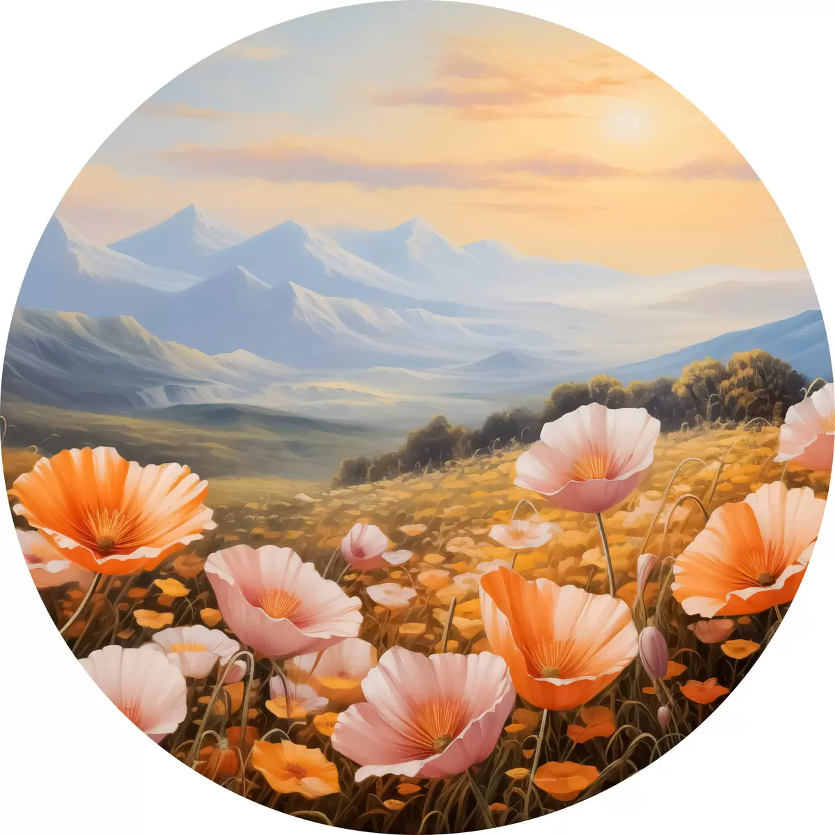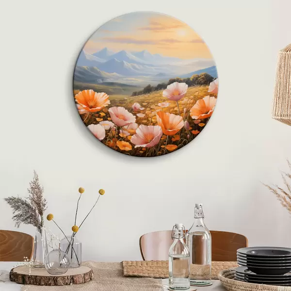 Ronde schilderijen Een veld klaprozen bij zonsopgang met bergen op de achtergrond r40730