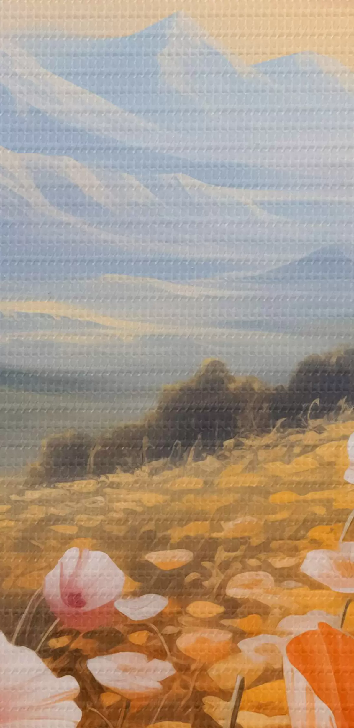 Afbeelding Een veld klaprozen bij zonsopgang met bergen op de achtergrond Nr r40730