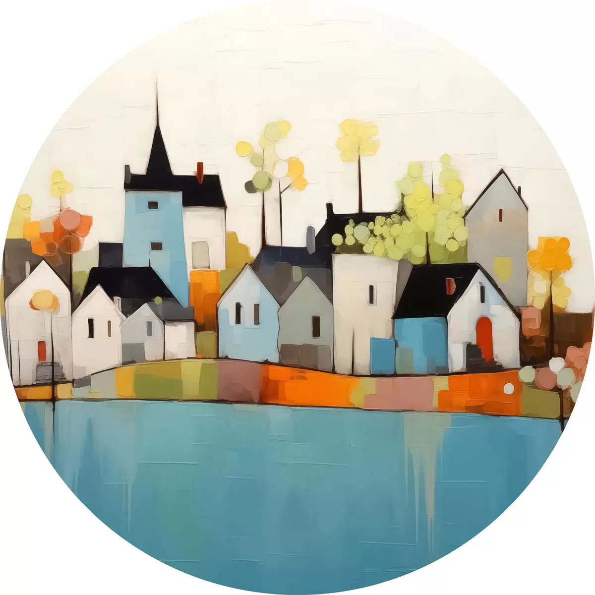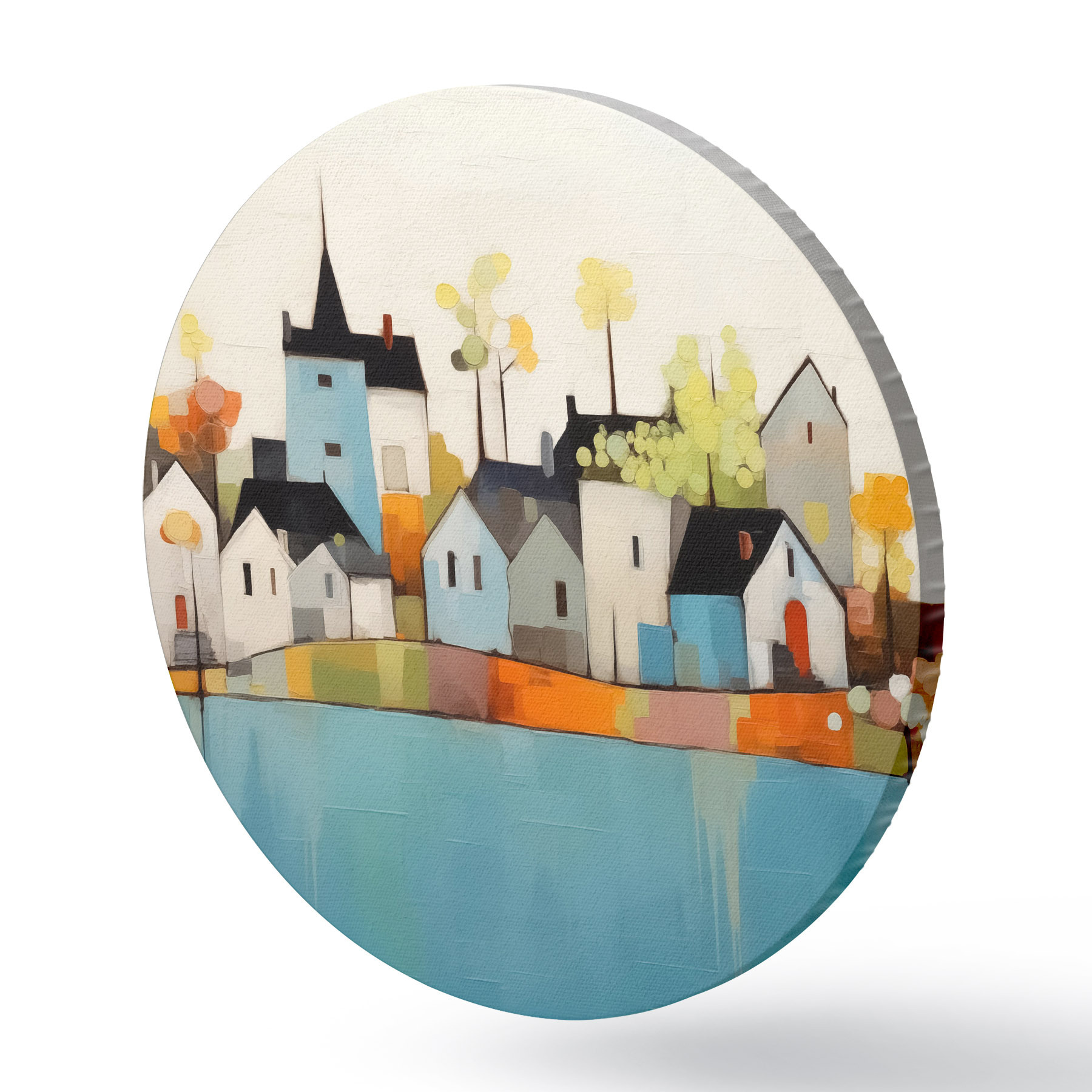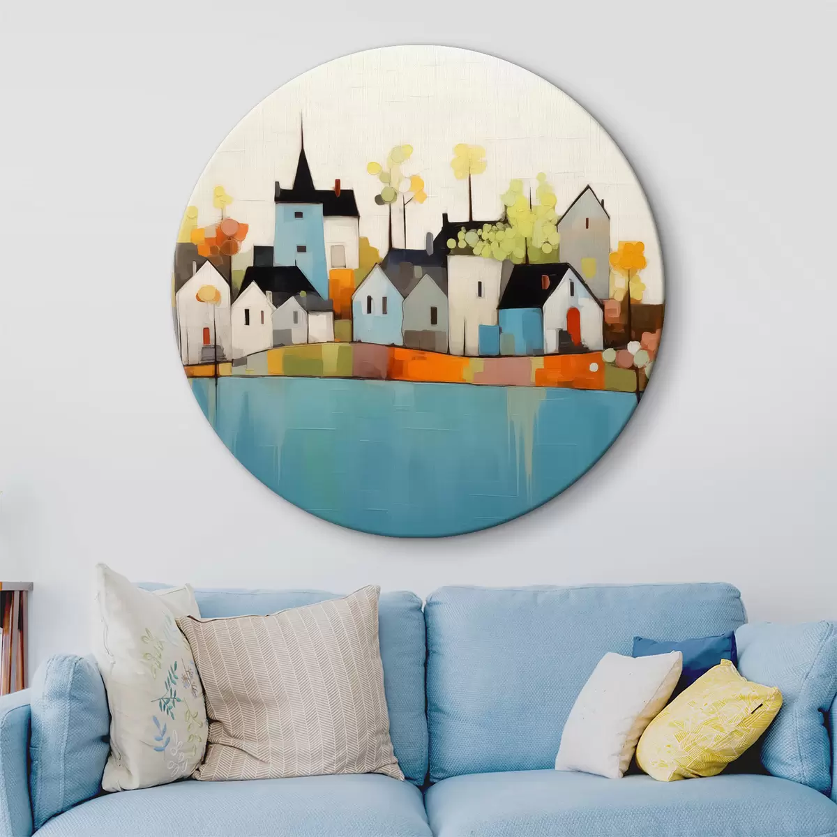 Ronde schilderijen Abstracte stad en huizen, blauwe, gele, rode kleuren r40751