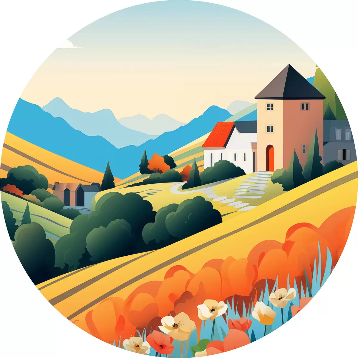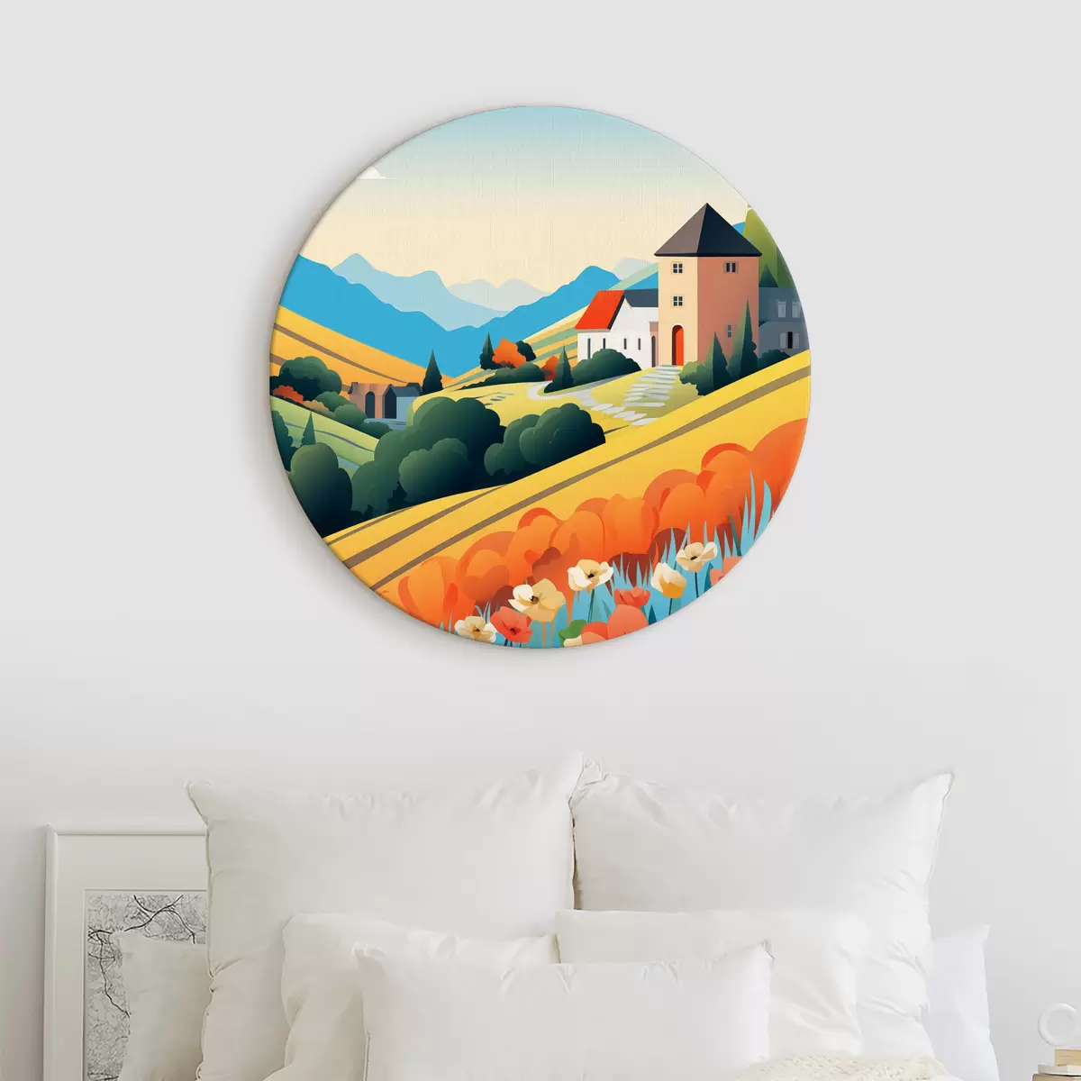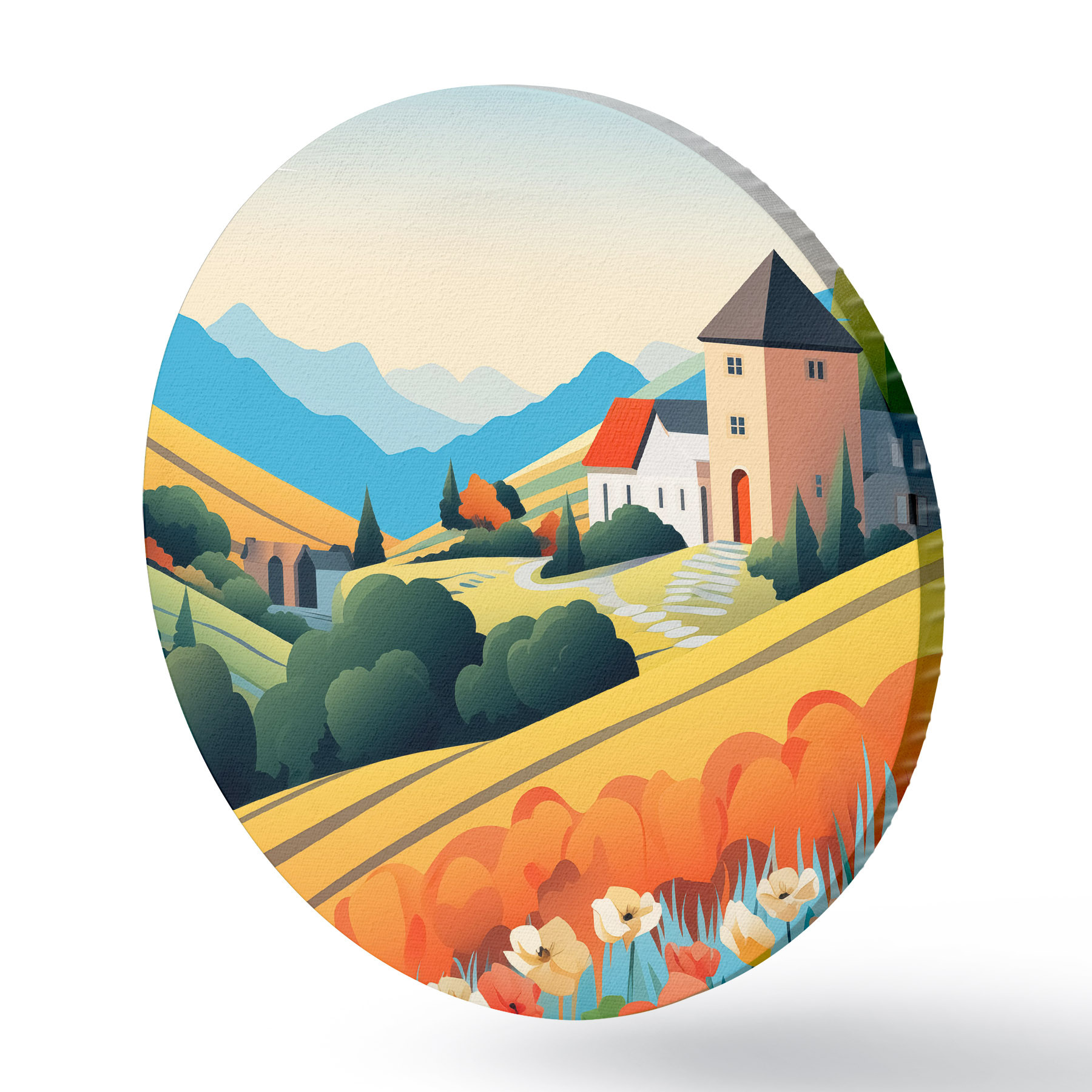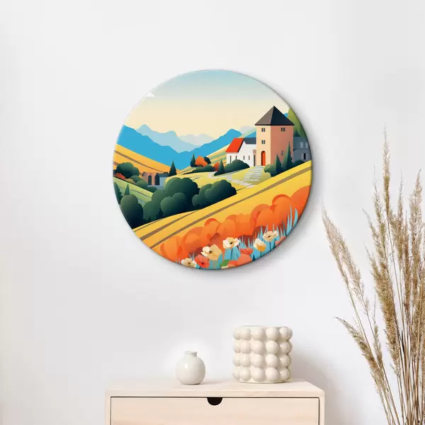 Ronde schilderijen Helder landelijk landschap met veld, klaprozen en huizen r40756