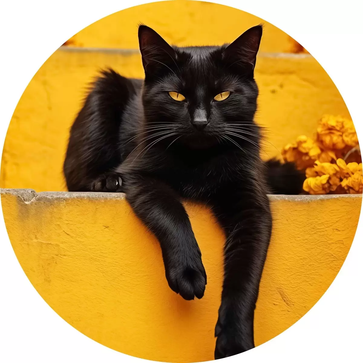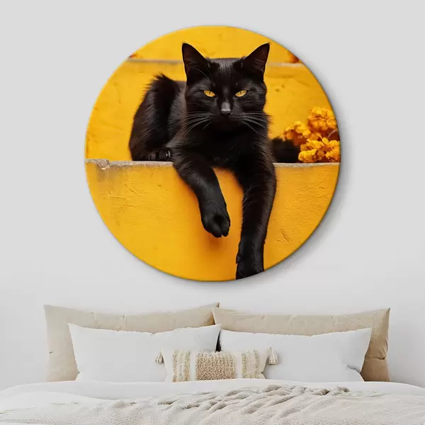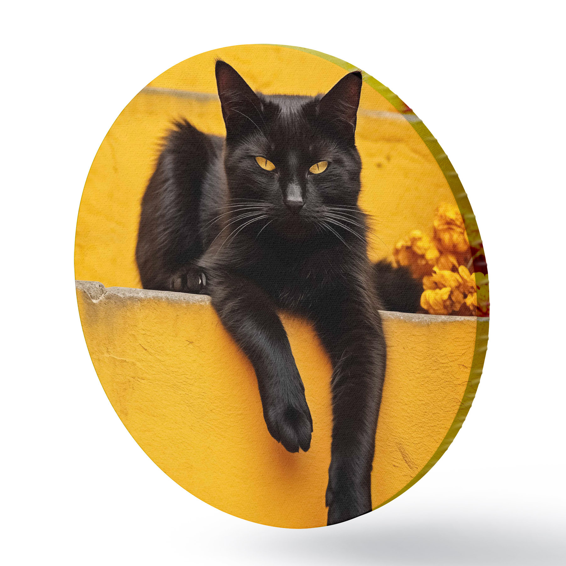 Ronde schilderijen Een zwarte kat ligt op de gele trap r40798