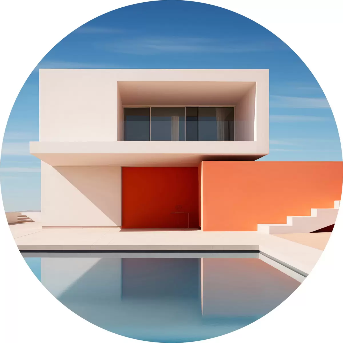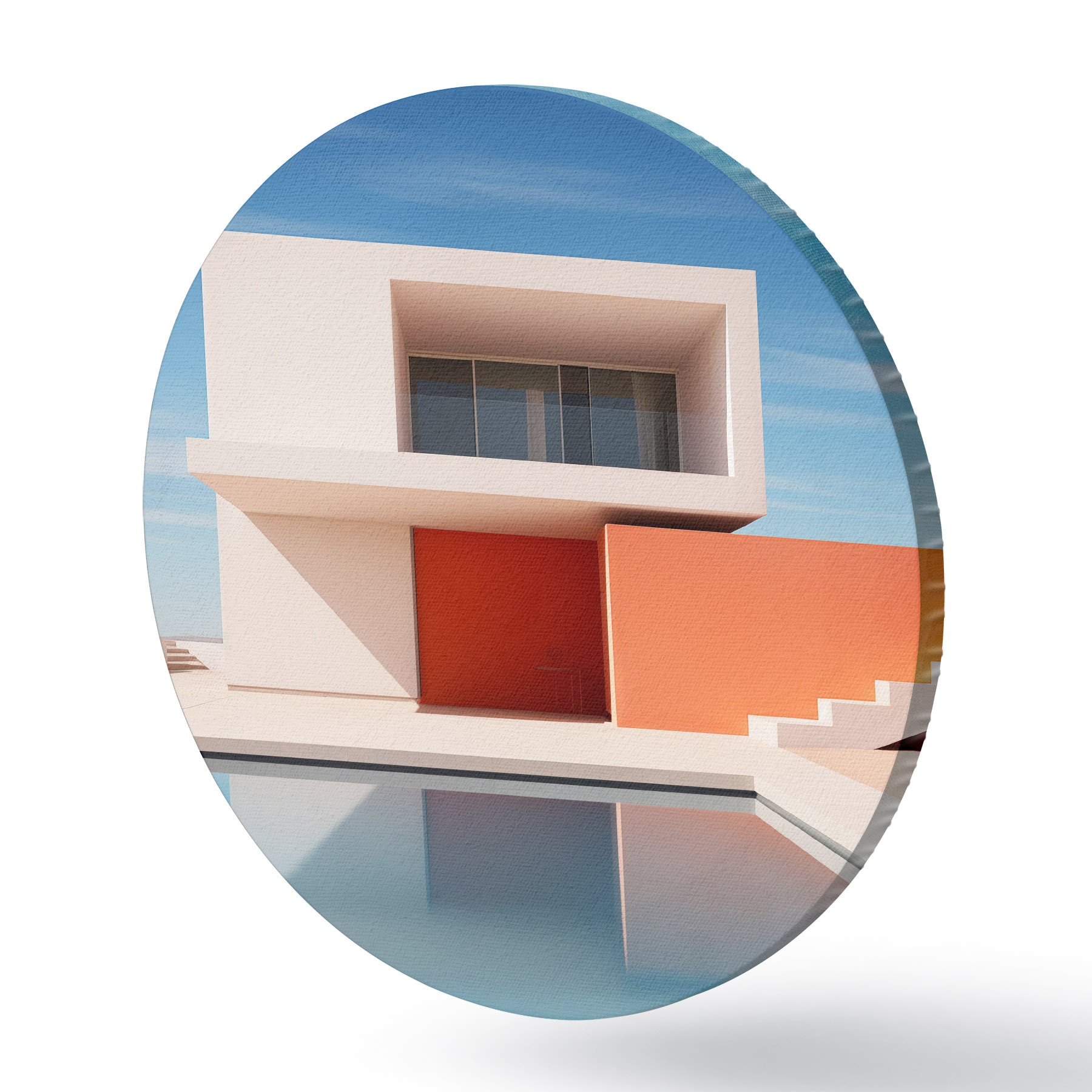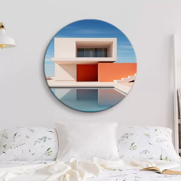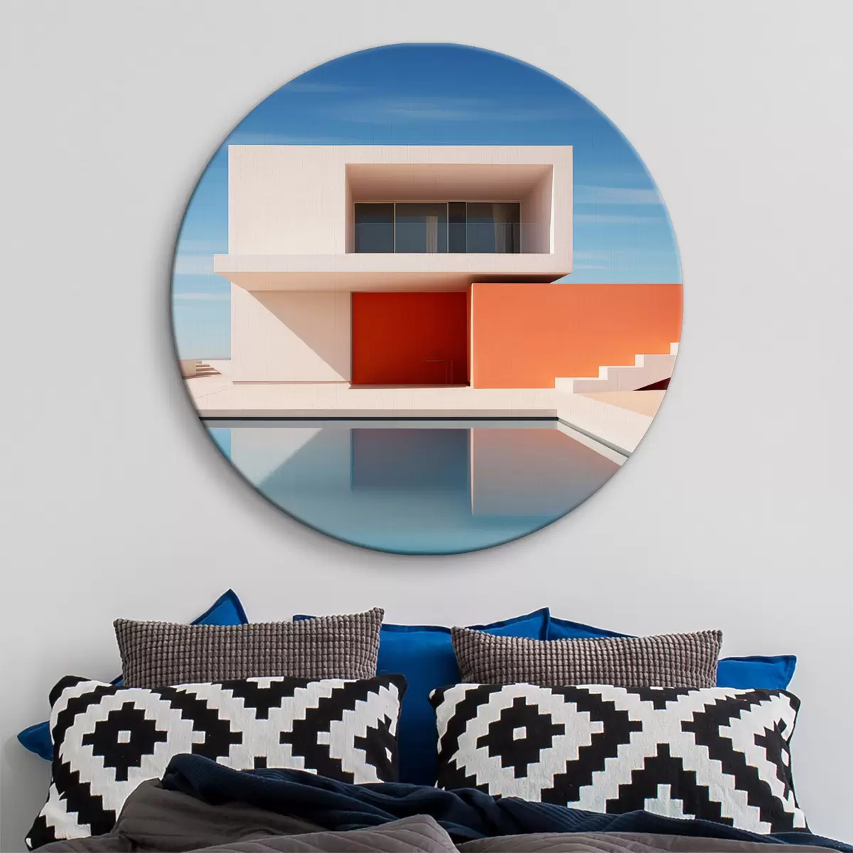 Ronde schilderijen Minimalistisch architectonisch landschap, huis en zwembad r40811