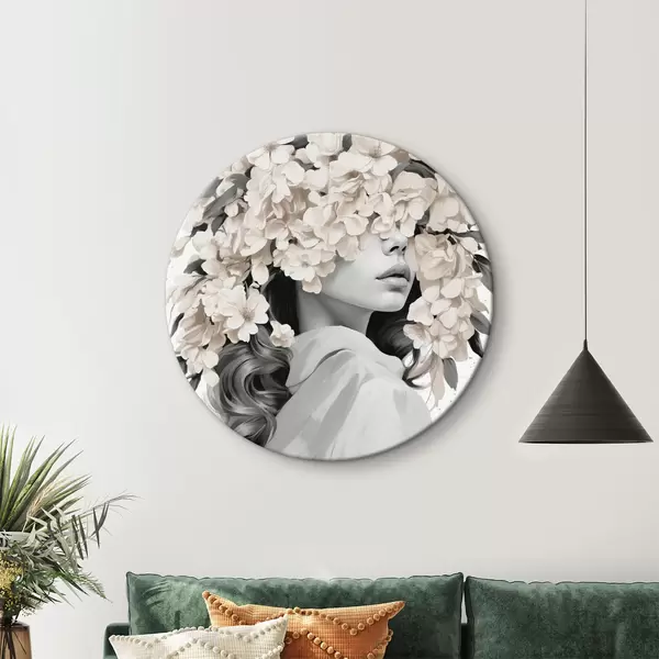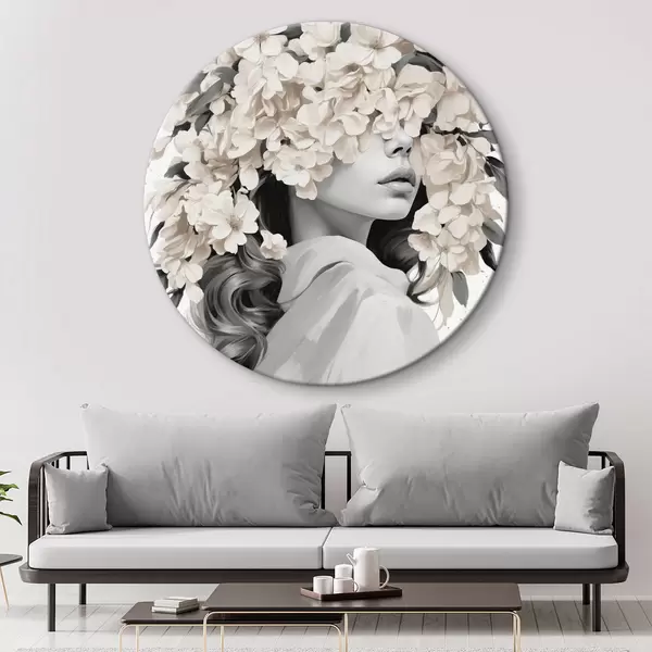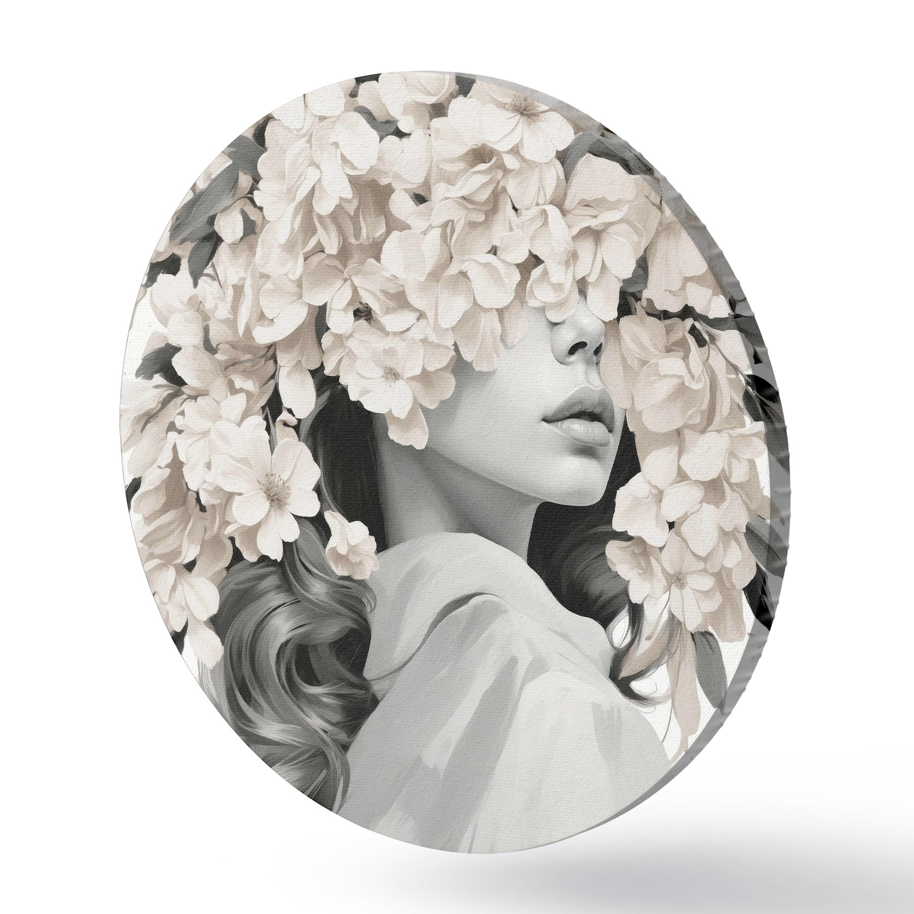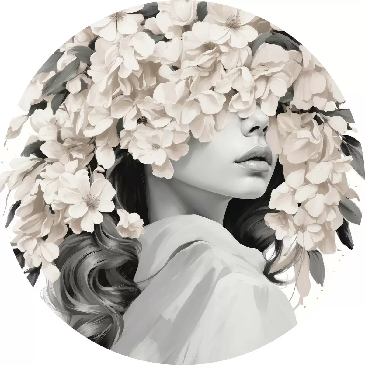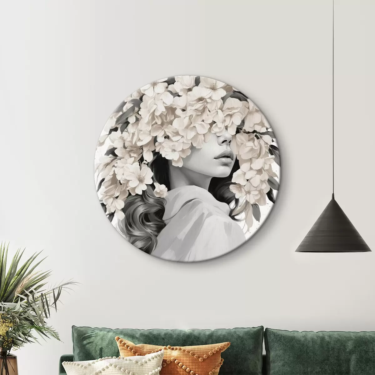 Ronde schilderijen Meisje met bloemen op haar gezicht in zwarte en witte kleuren r40849