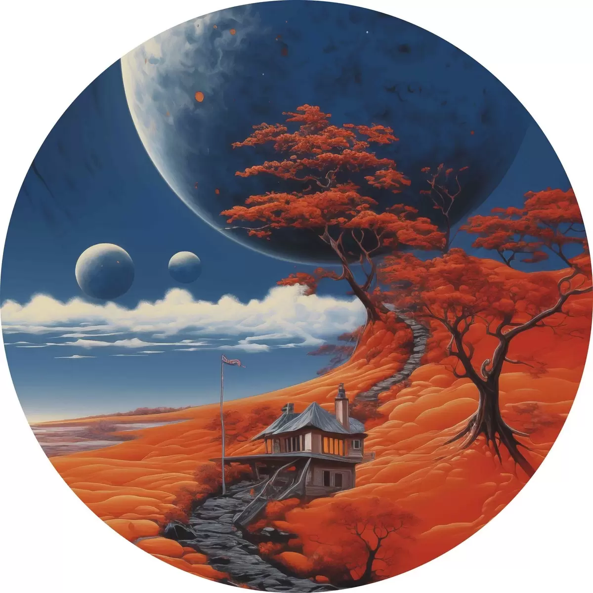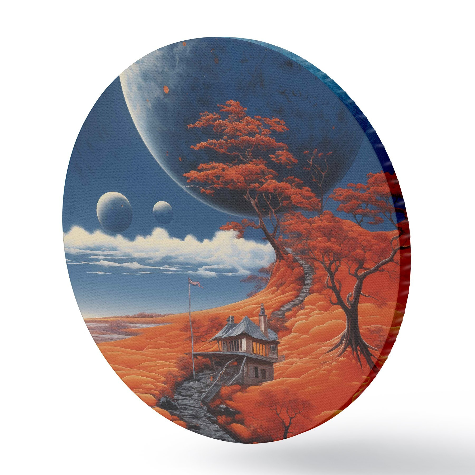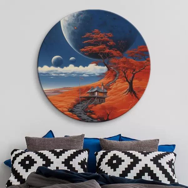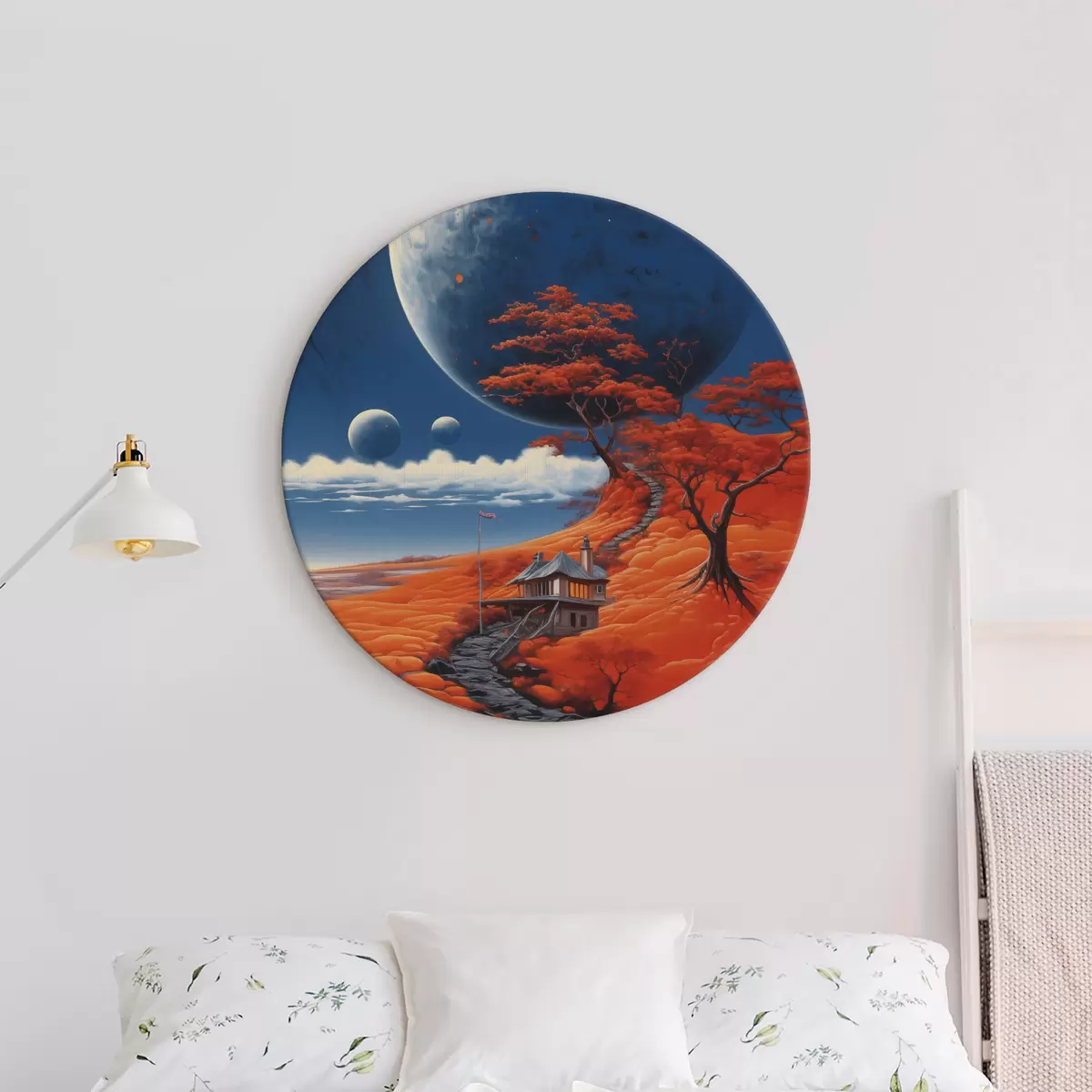 Ronde schilderijen Ruimte illustratie, planeten, blauwe lucht, huis op de heuvel, bomen r40946