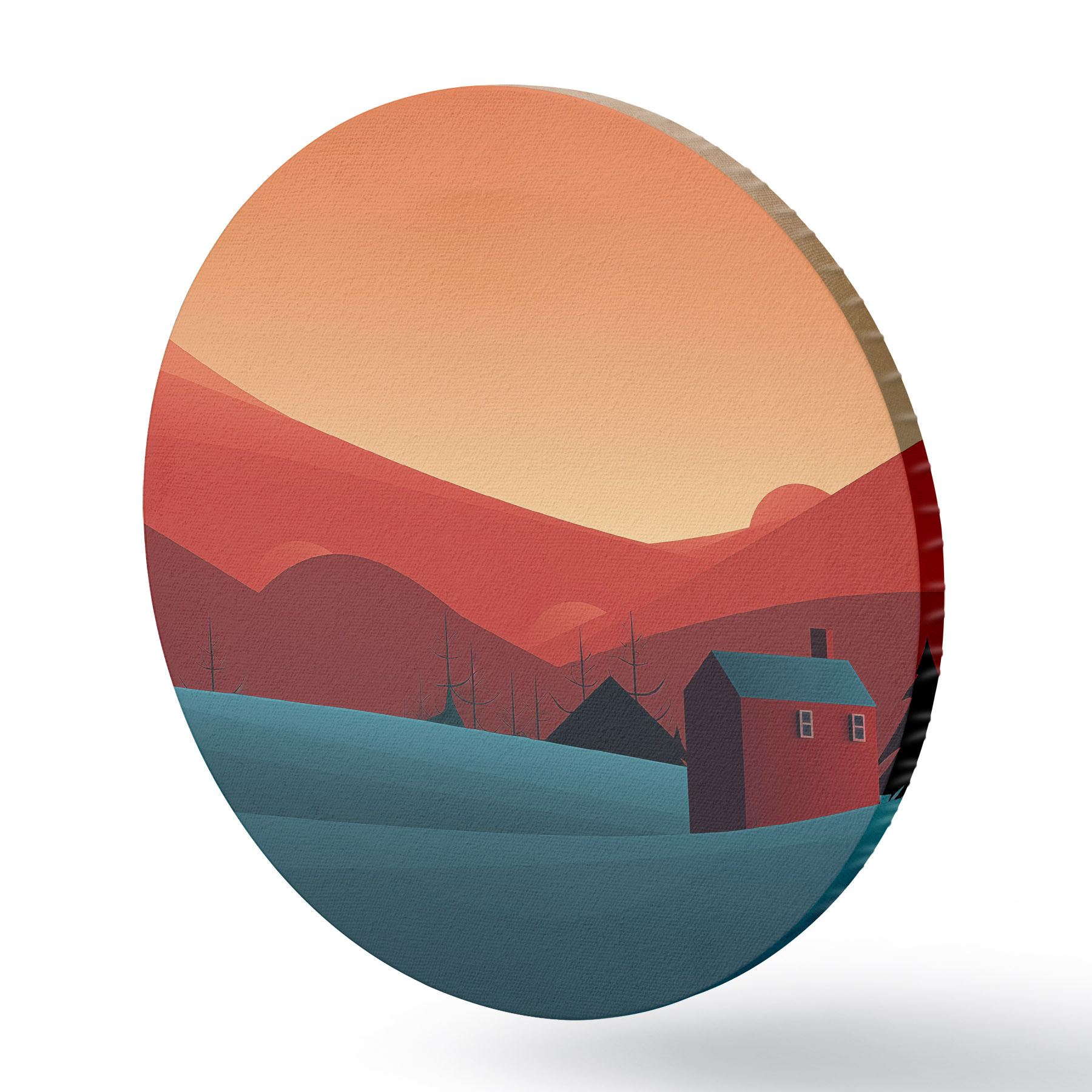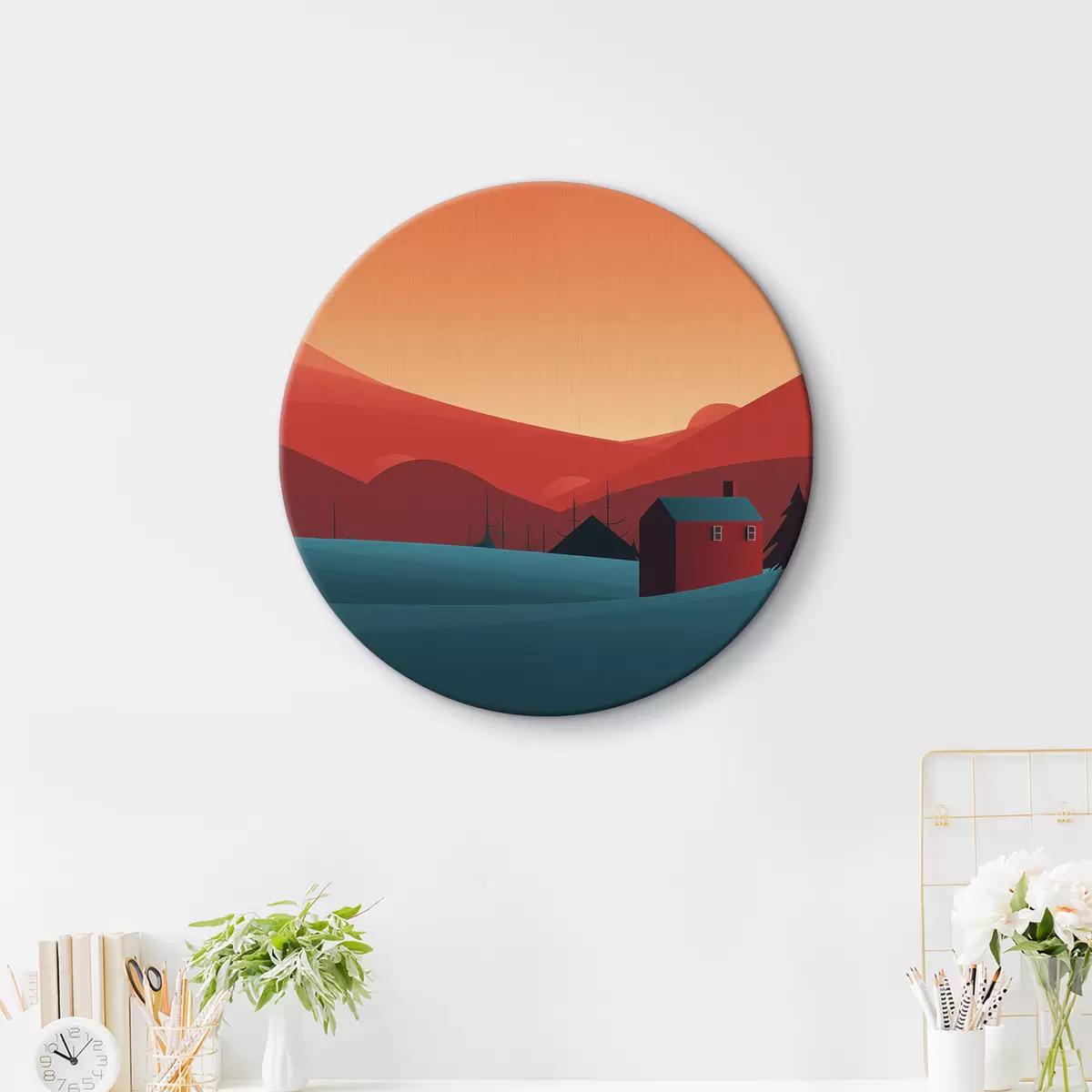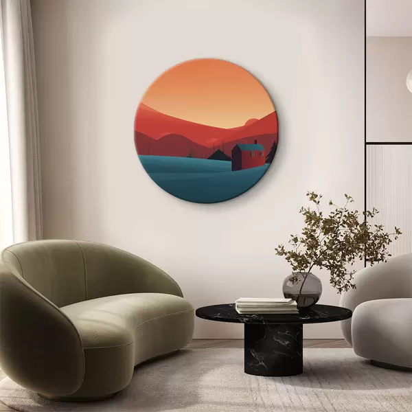 Ronde schilderijen Minimalistisch landschap met huis en bos r40952