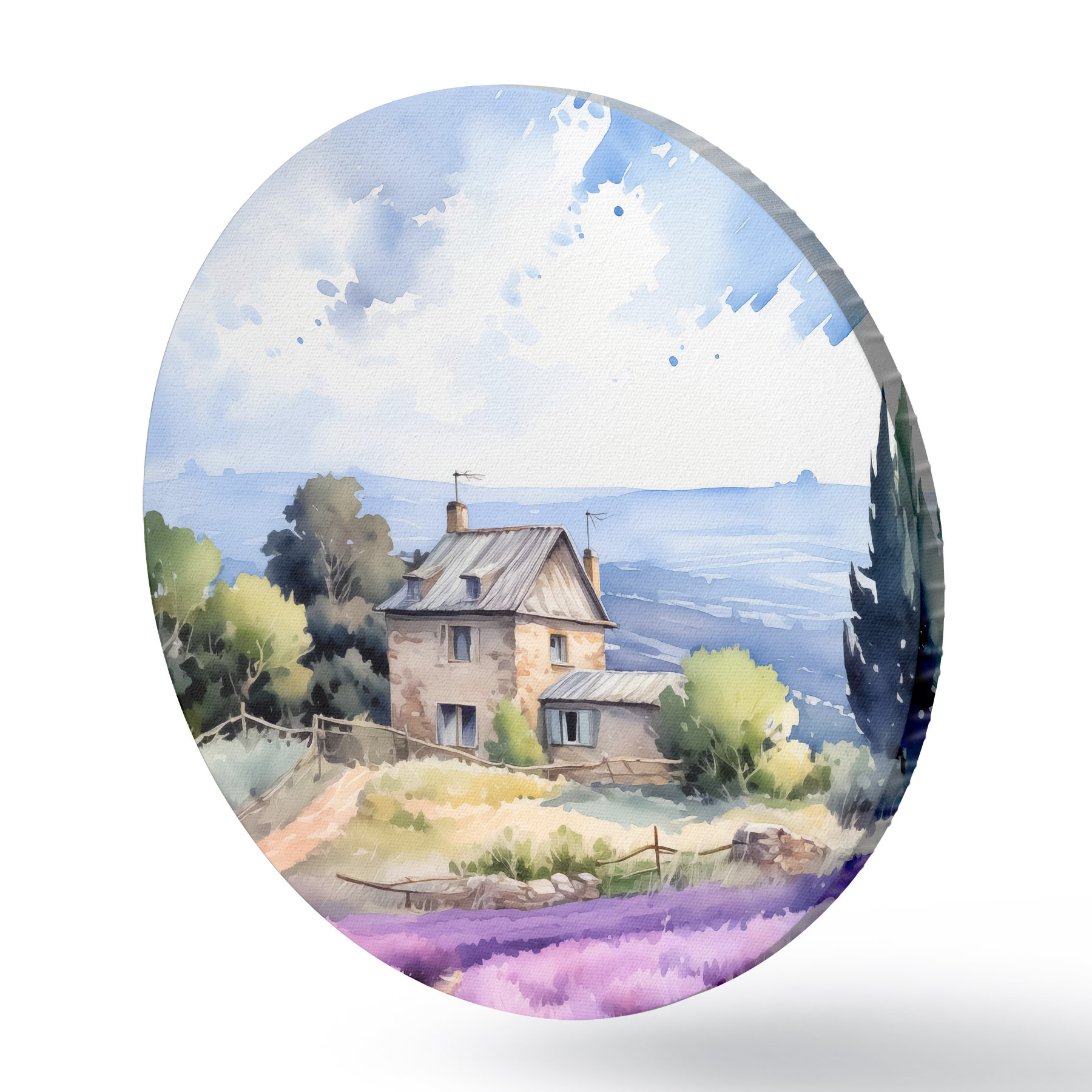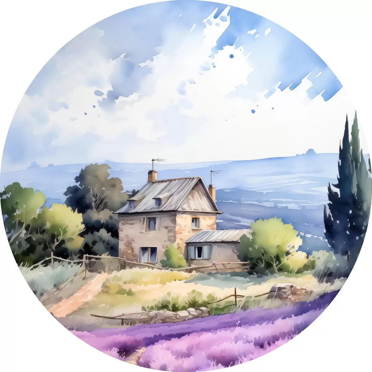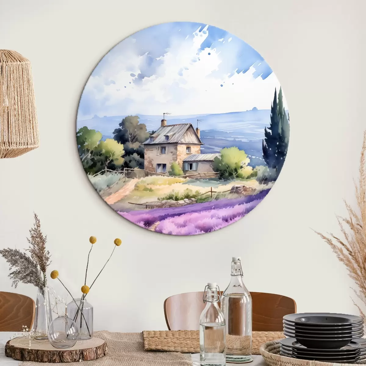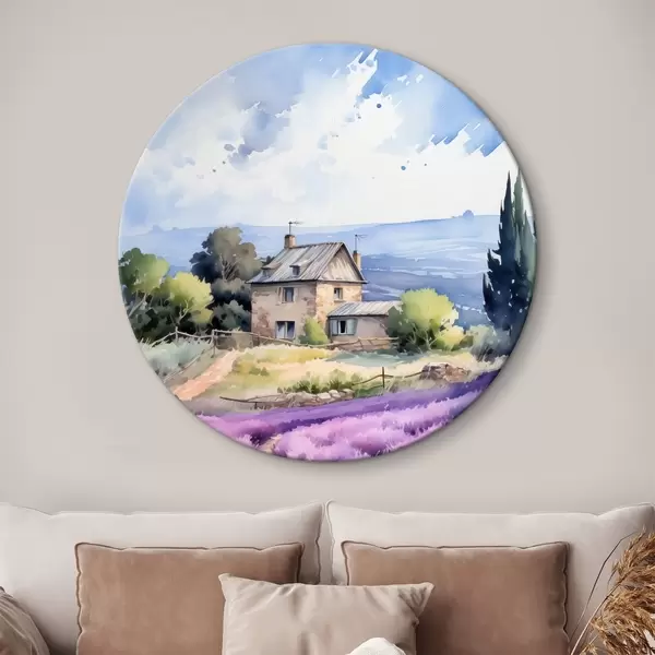 Ronde schilderijen Landhuis met bergen op de achtergrond bij een lavendelveld r41012