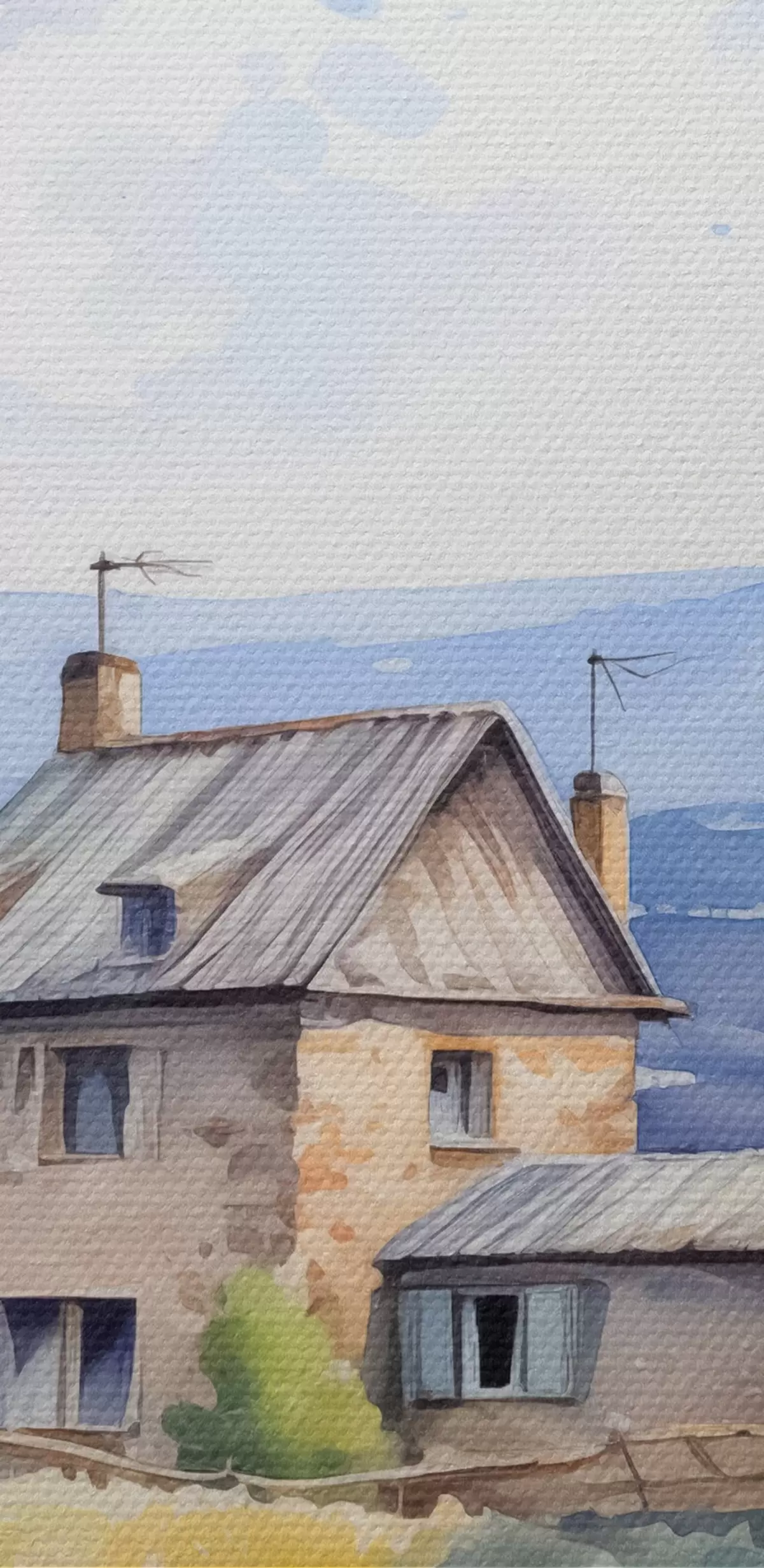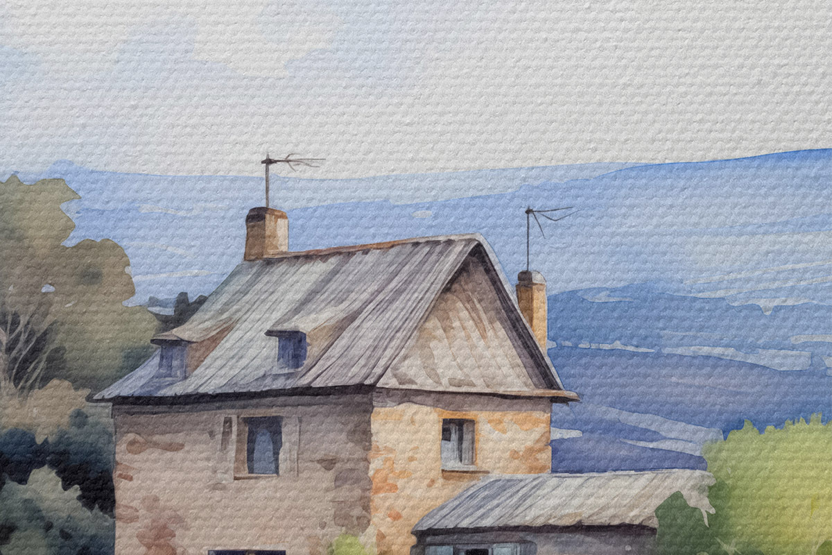 Afbeelding Landhuis met bergen op de achtergrond bij een lavendelveld Nr r41012