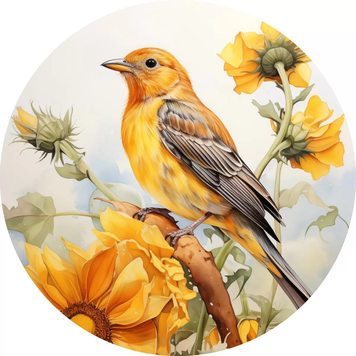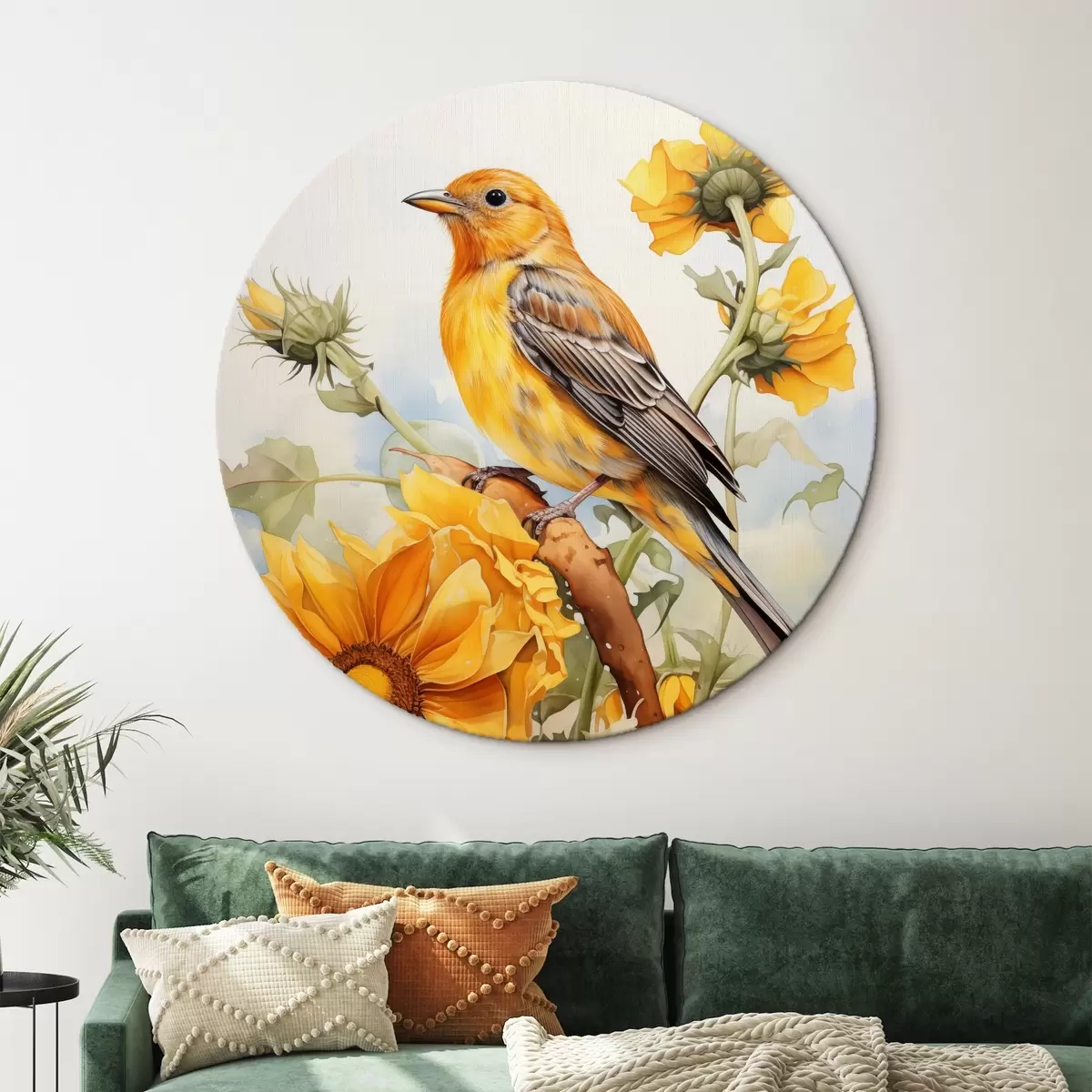 Ronde schilderijen Gele vogel zittend op een zonnebloem aquarel r41015