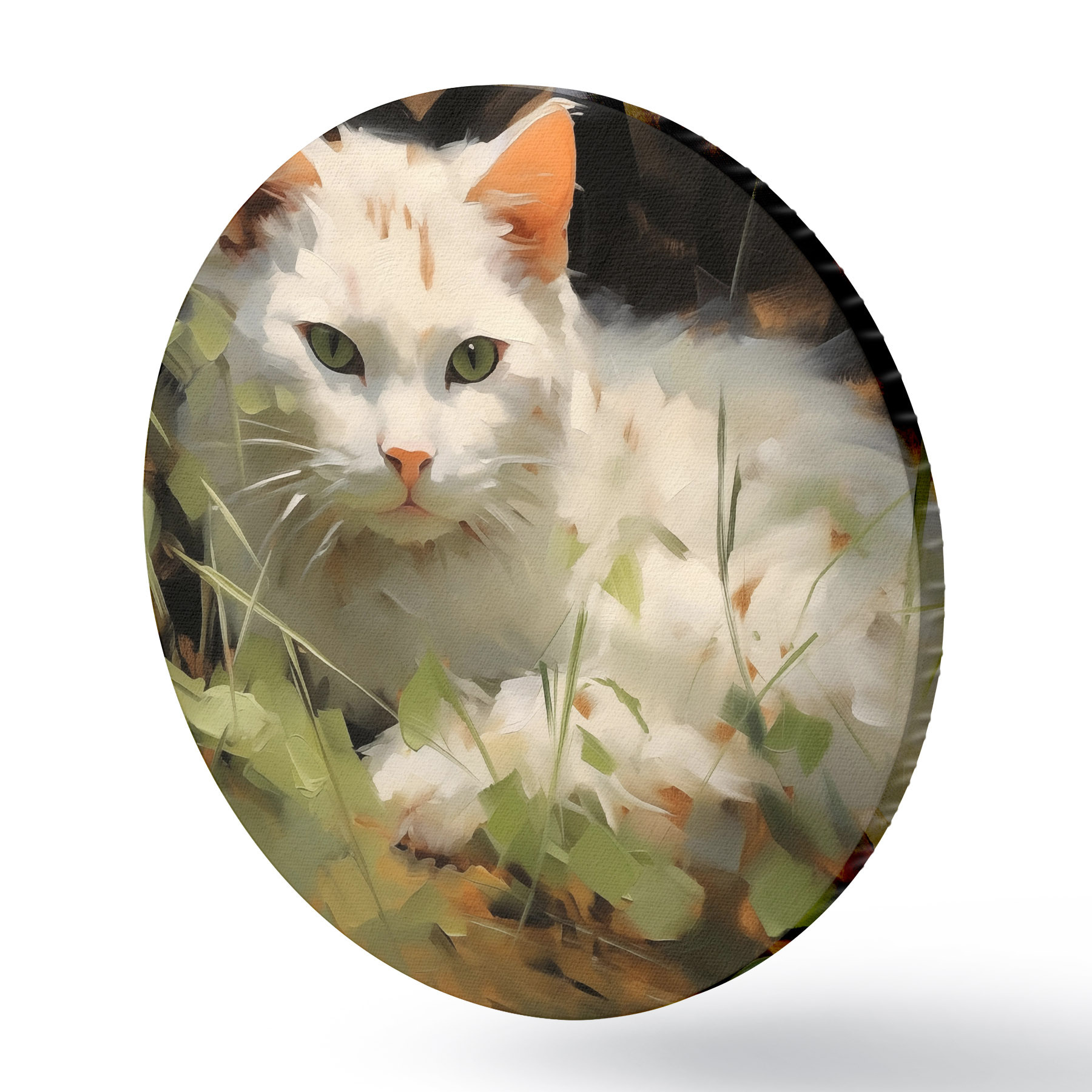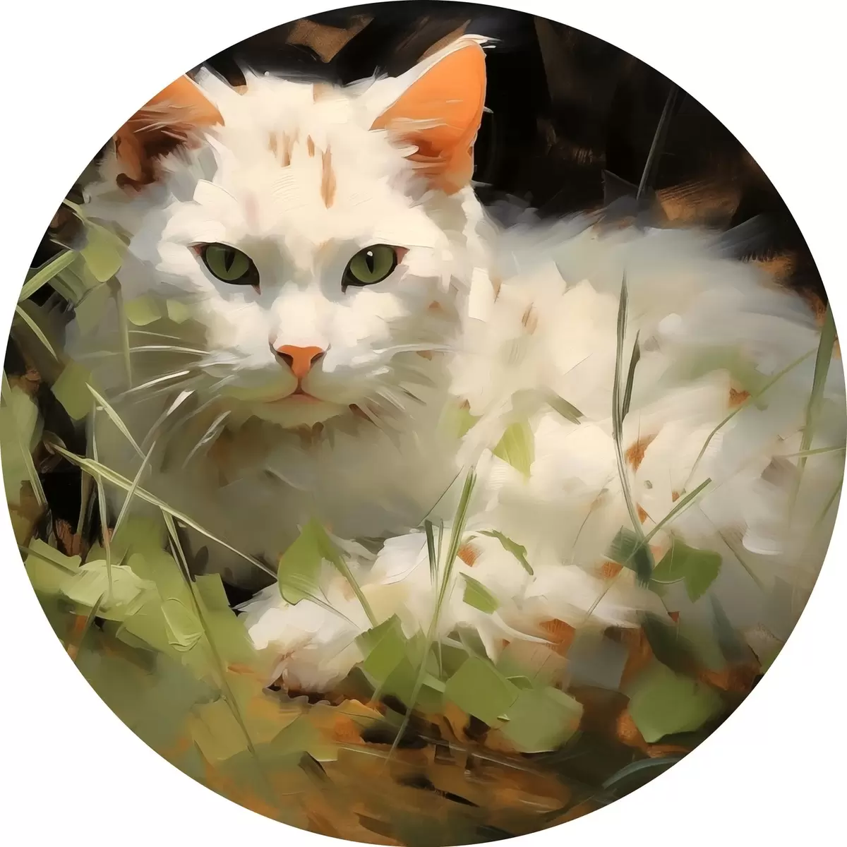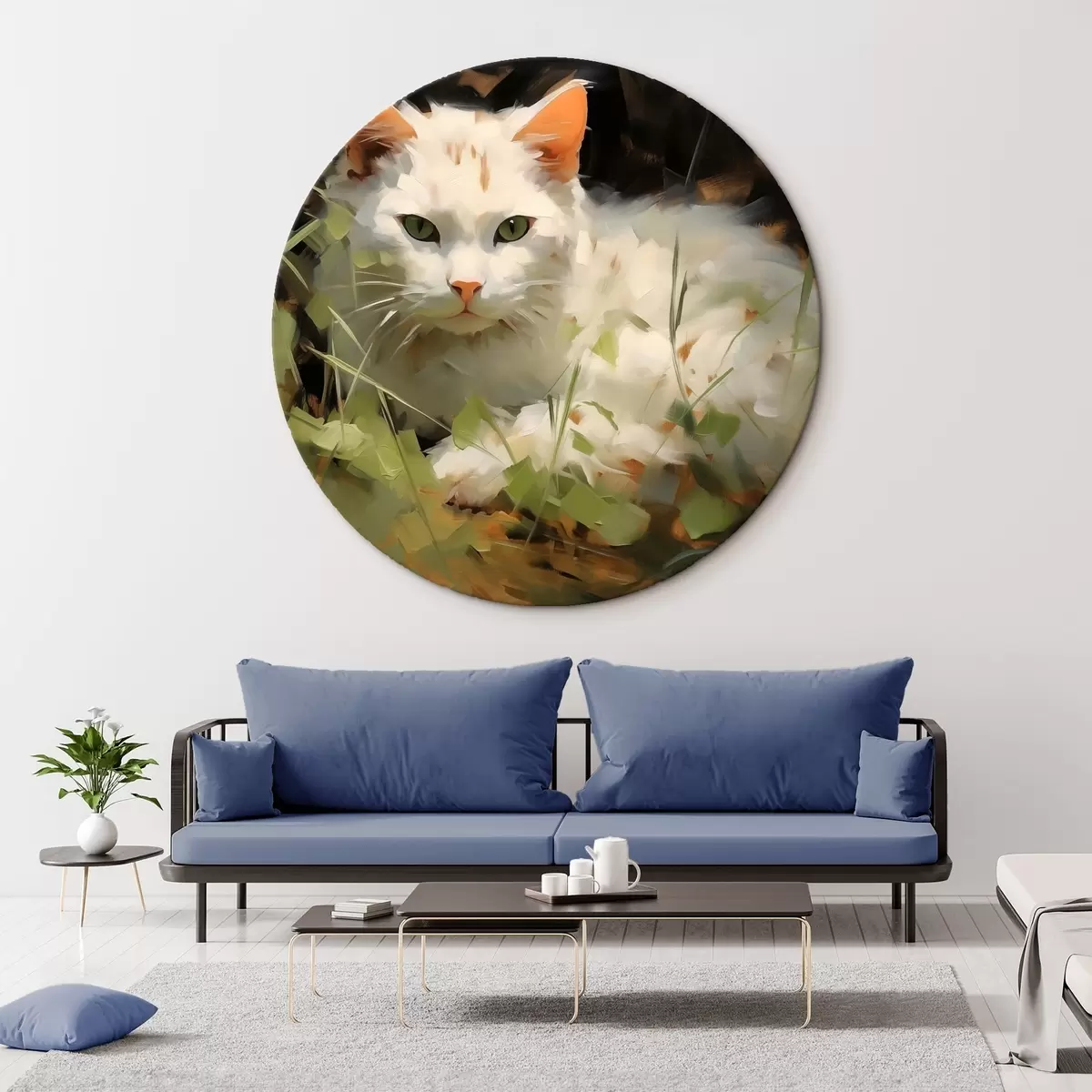 Ronde schilderijen Witte kat liggend in het gras, imitatie van penseelstreken r41017
