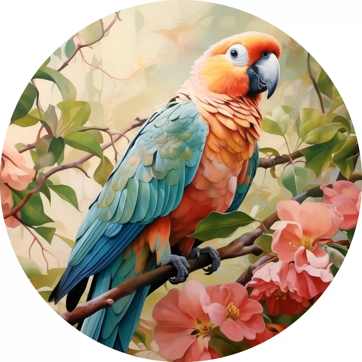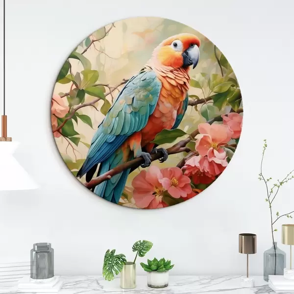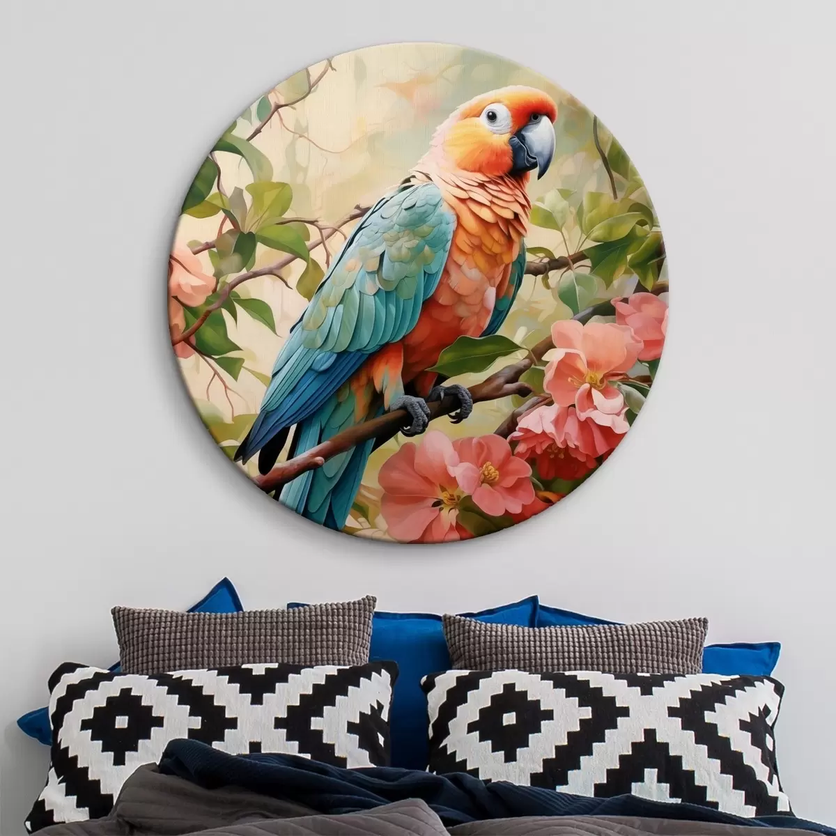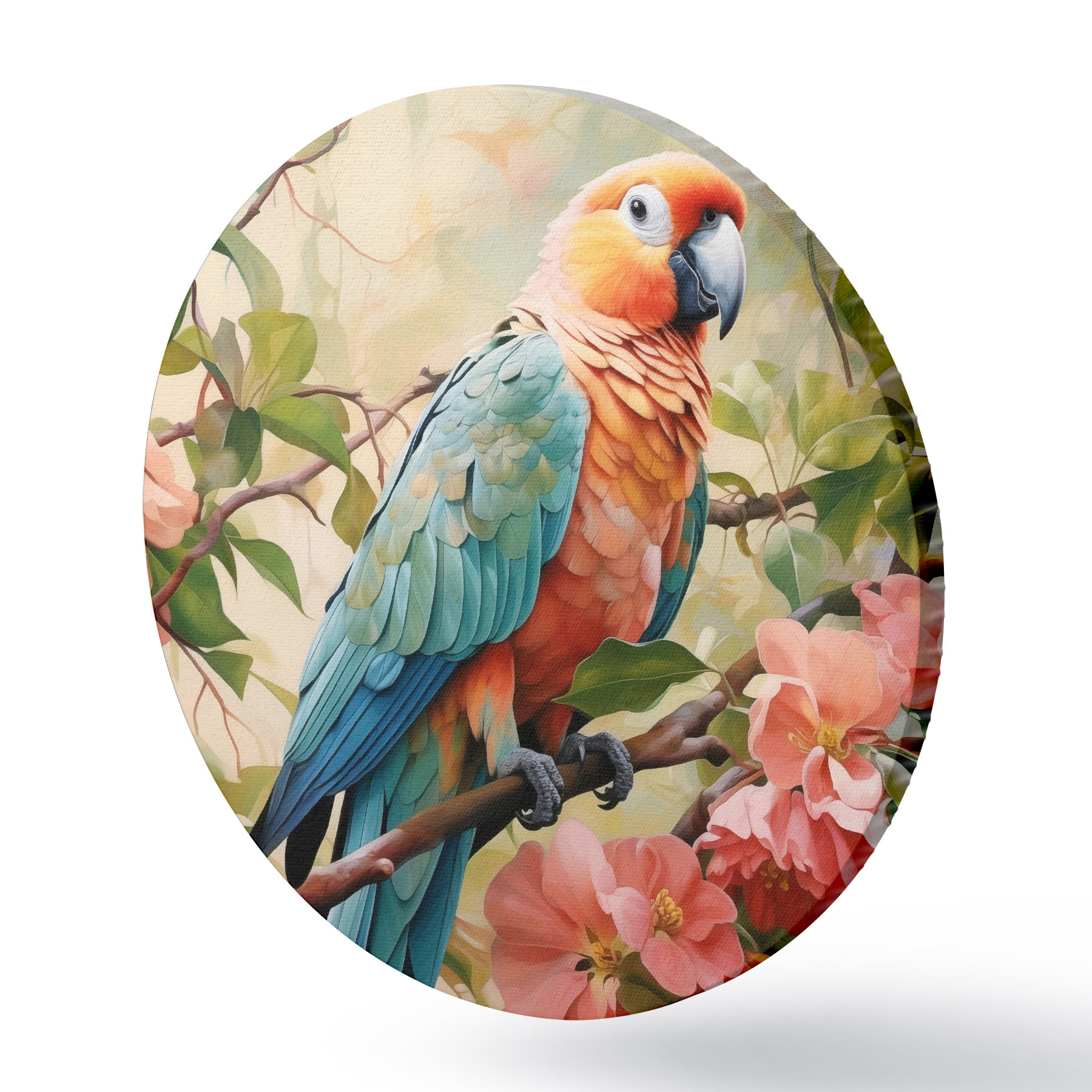 Ronde schilderijen Linnet papegaai zittend op een tak met roze bloemen r41018