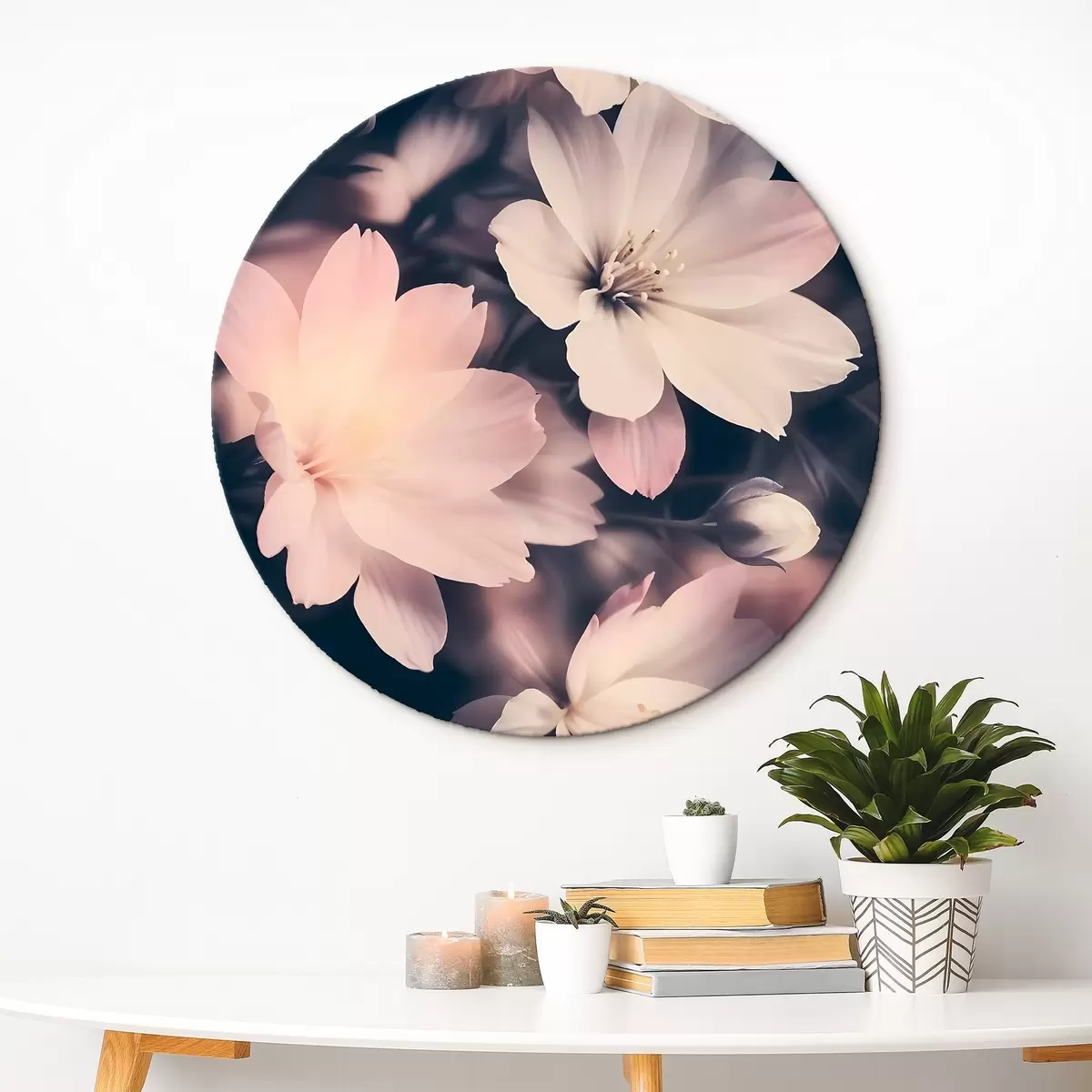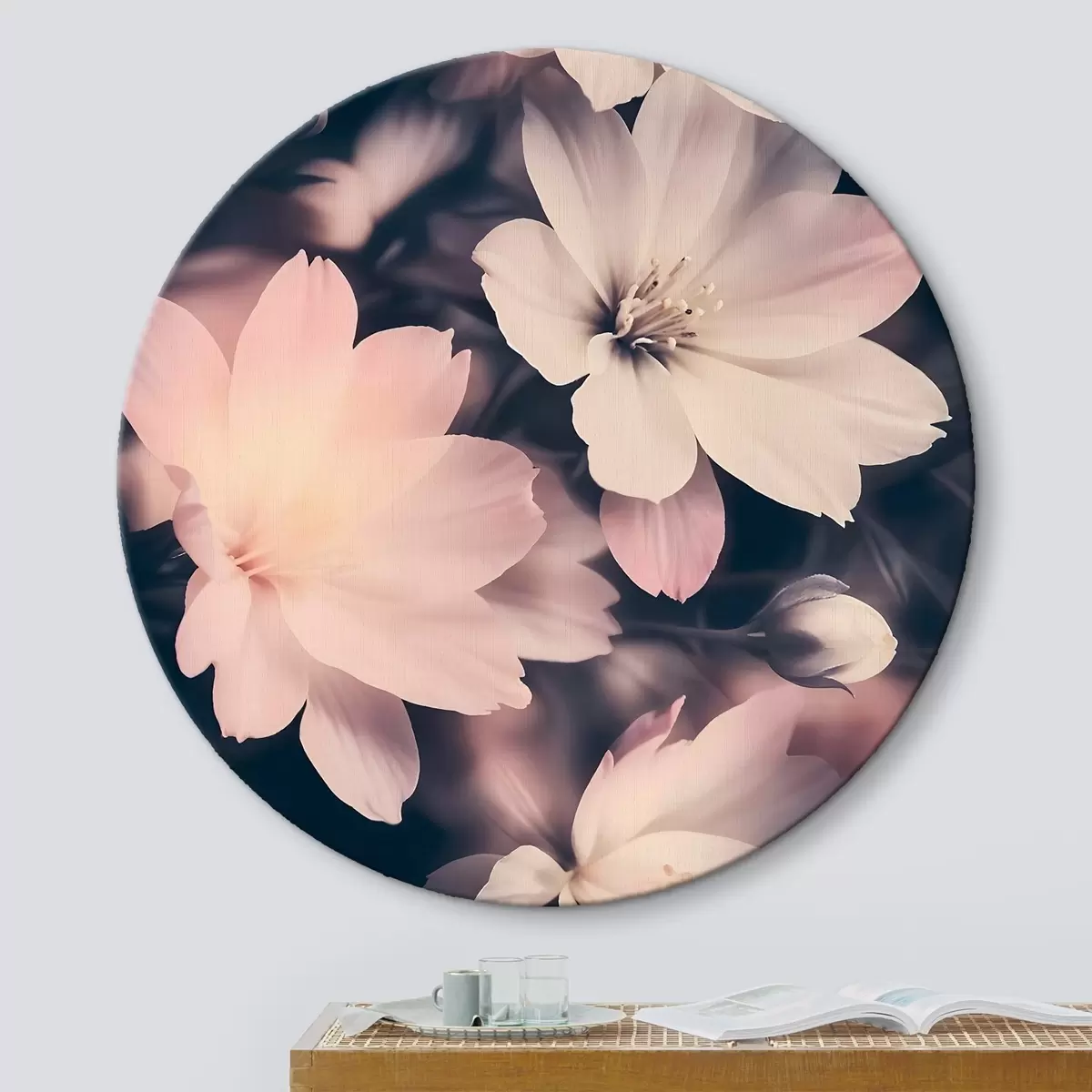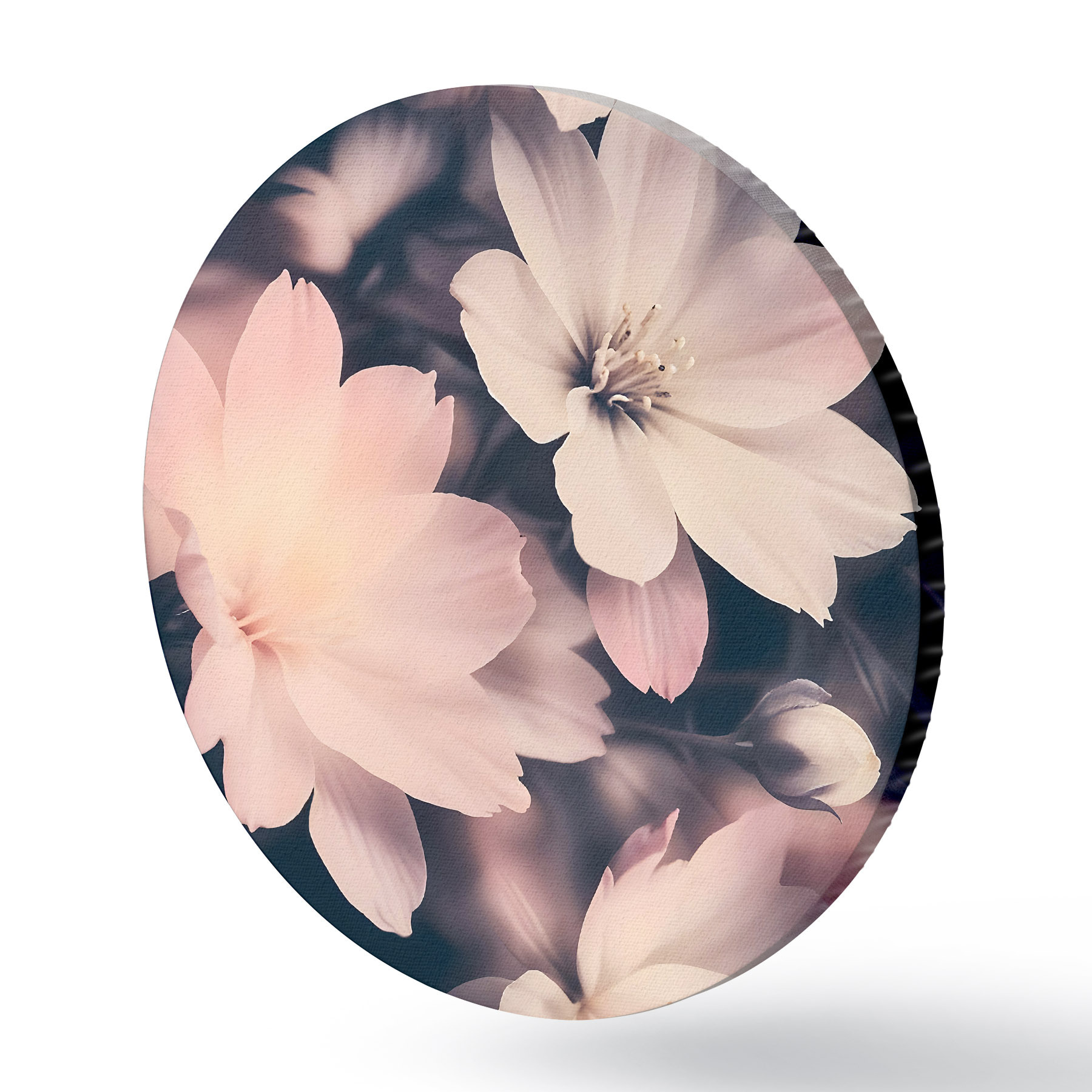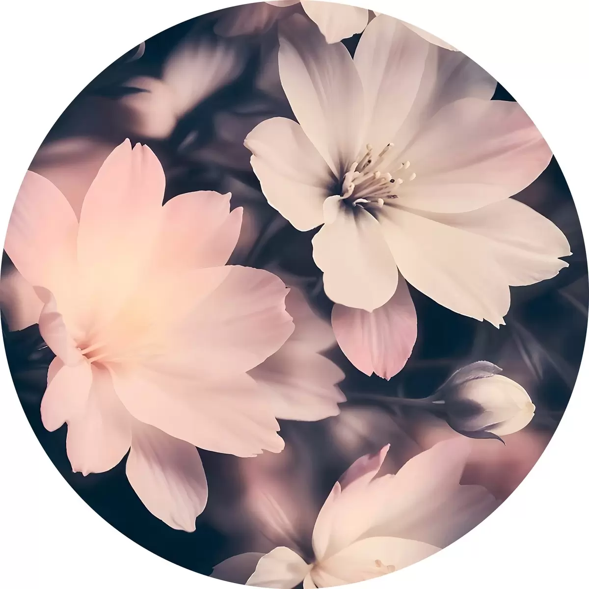 Ronde schilderijen Zachtroze en witte bloemen in vintage stijl met wazige achtergrond r41084