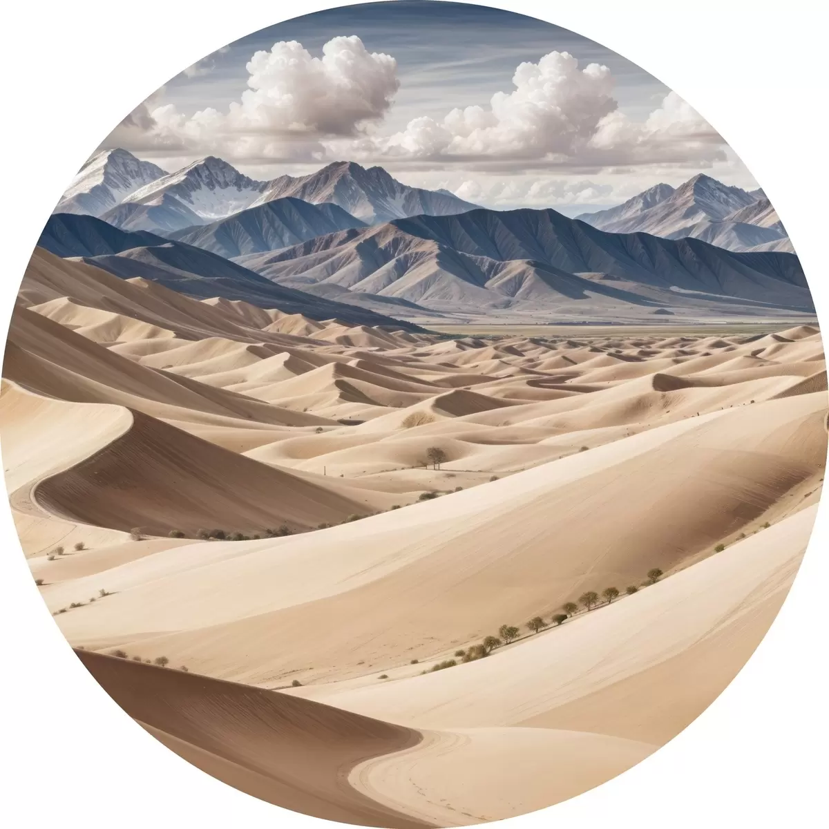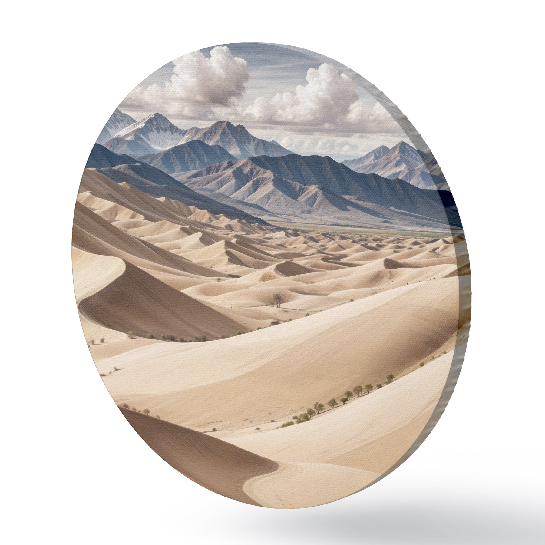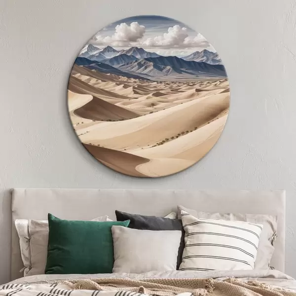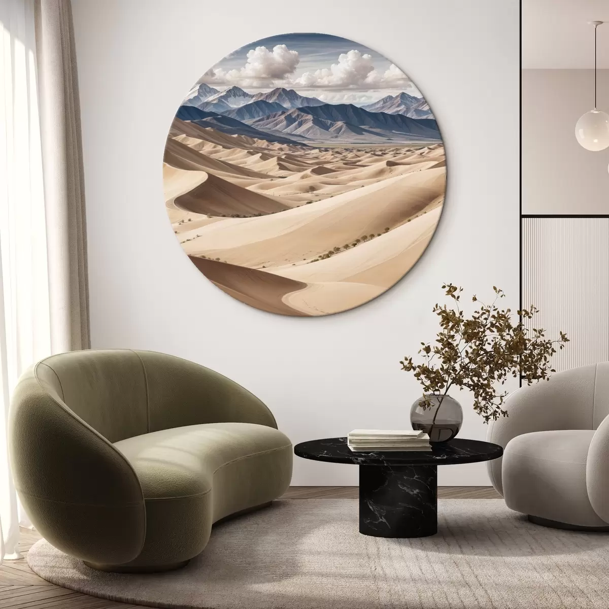 Ronde schilderijen Een uitgestrekt woestijnlandschap met glooiende duinen, ruige bergen in de verte en een dramatische wolkenlucht r41089