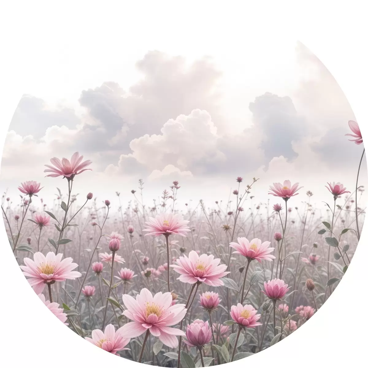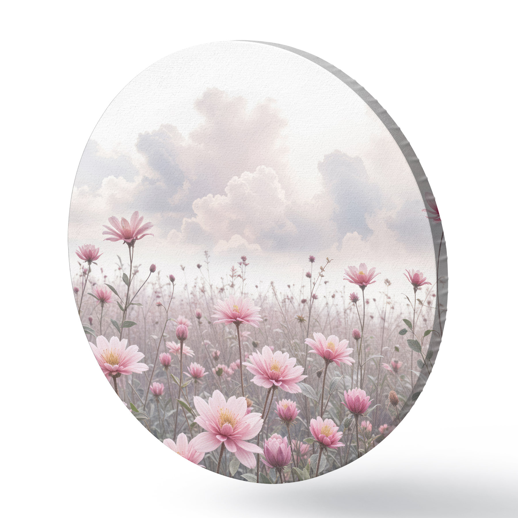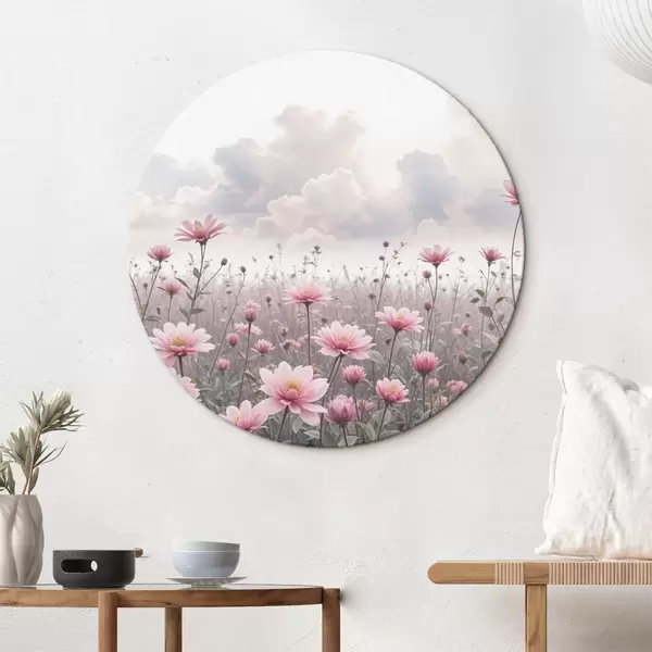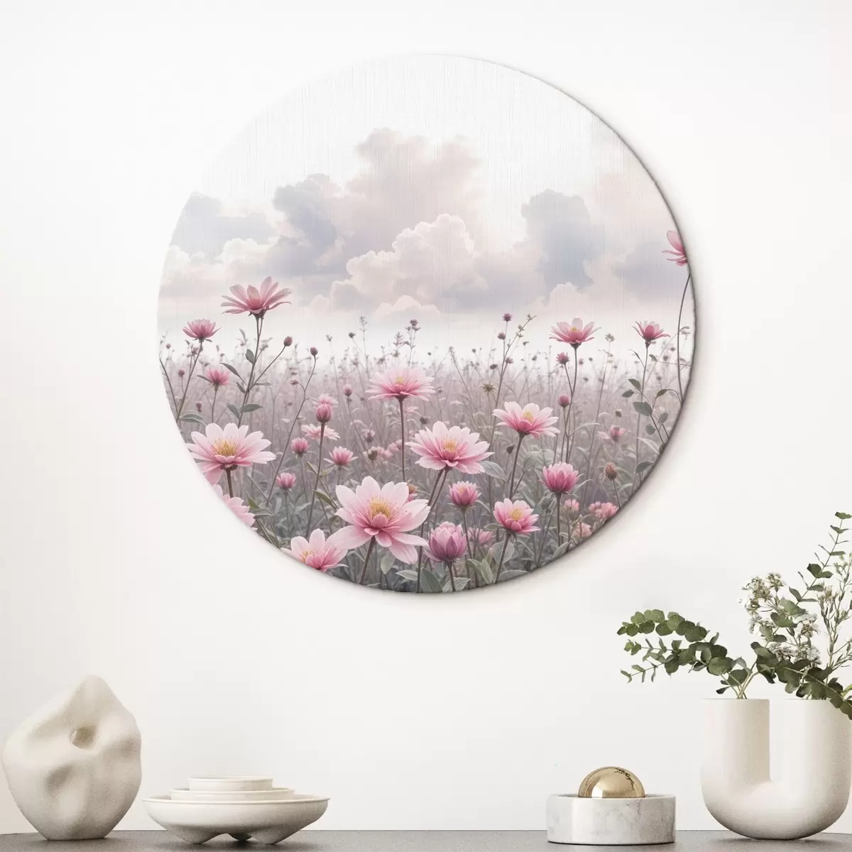 Ronde schilderijen Een veld met roze margrietbloemen tegen een bewolkte lucht r41102