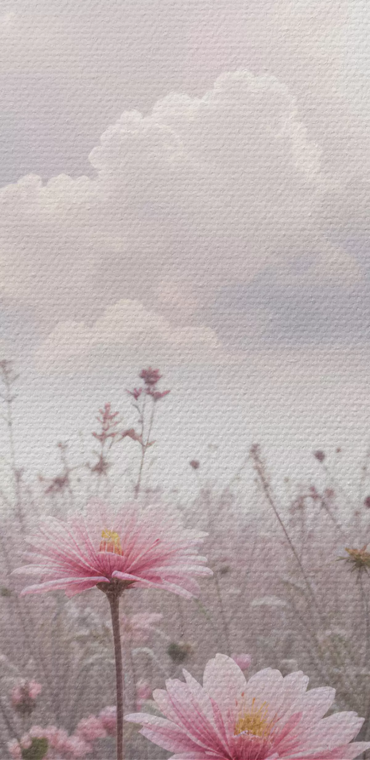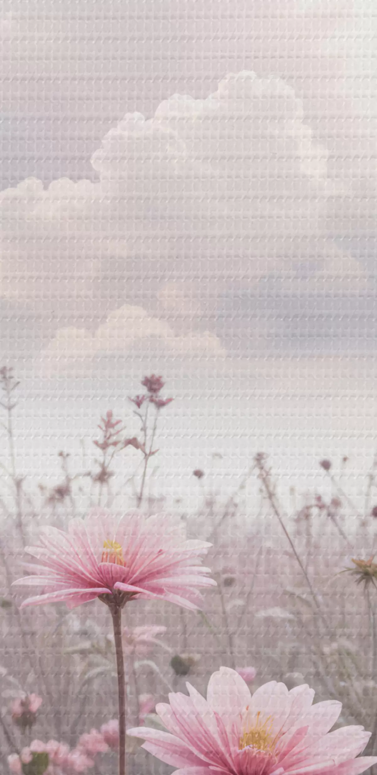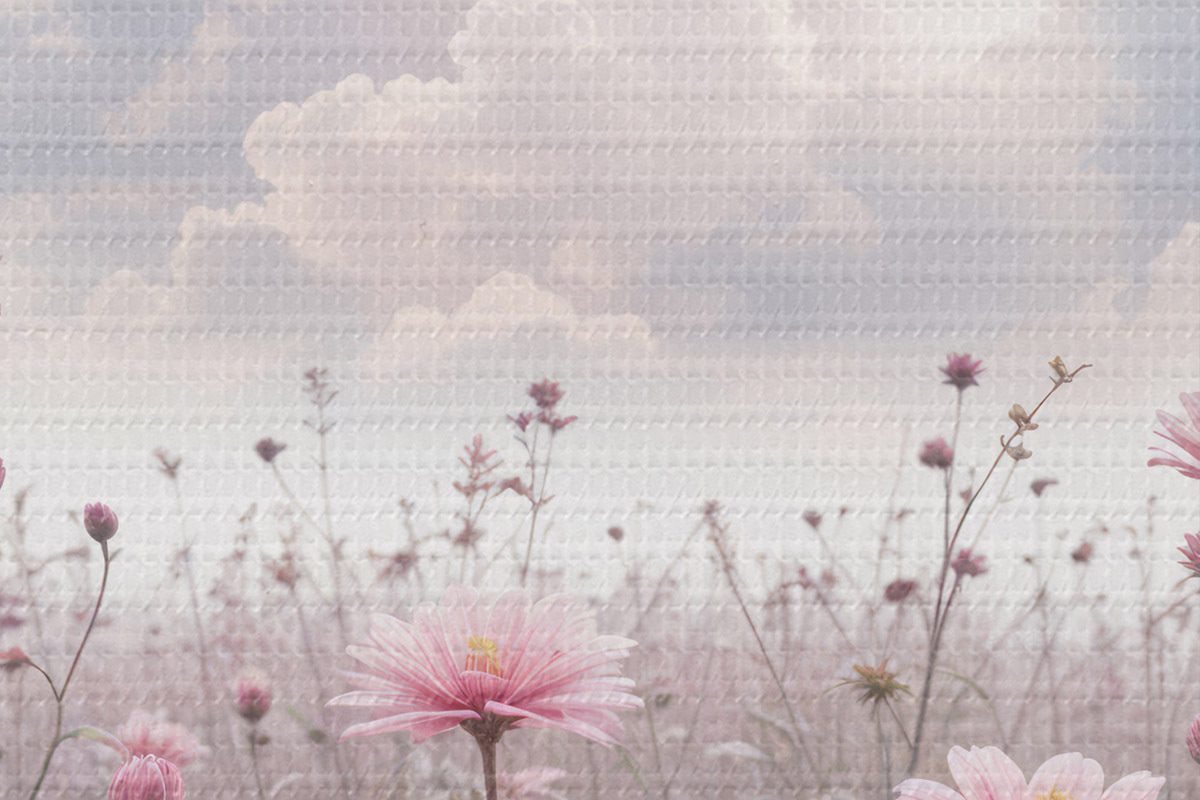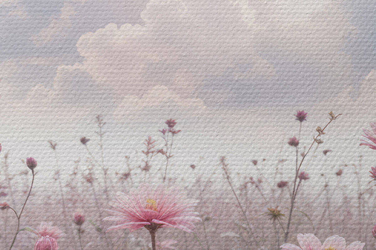 Afbeelding Een veld met roze margrietbloemen tegen een bewolkte lucht Nr r41102