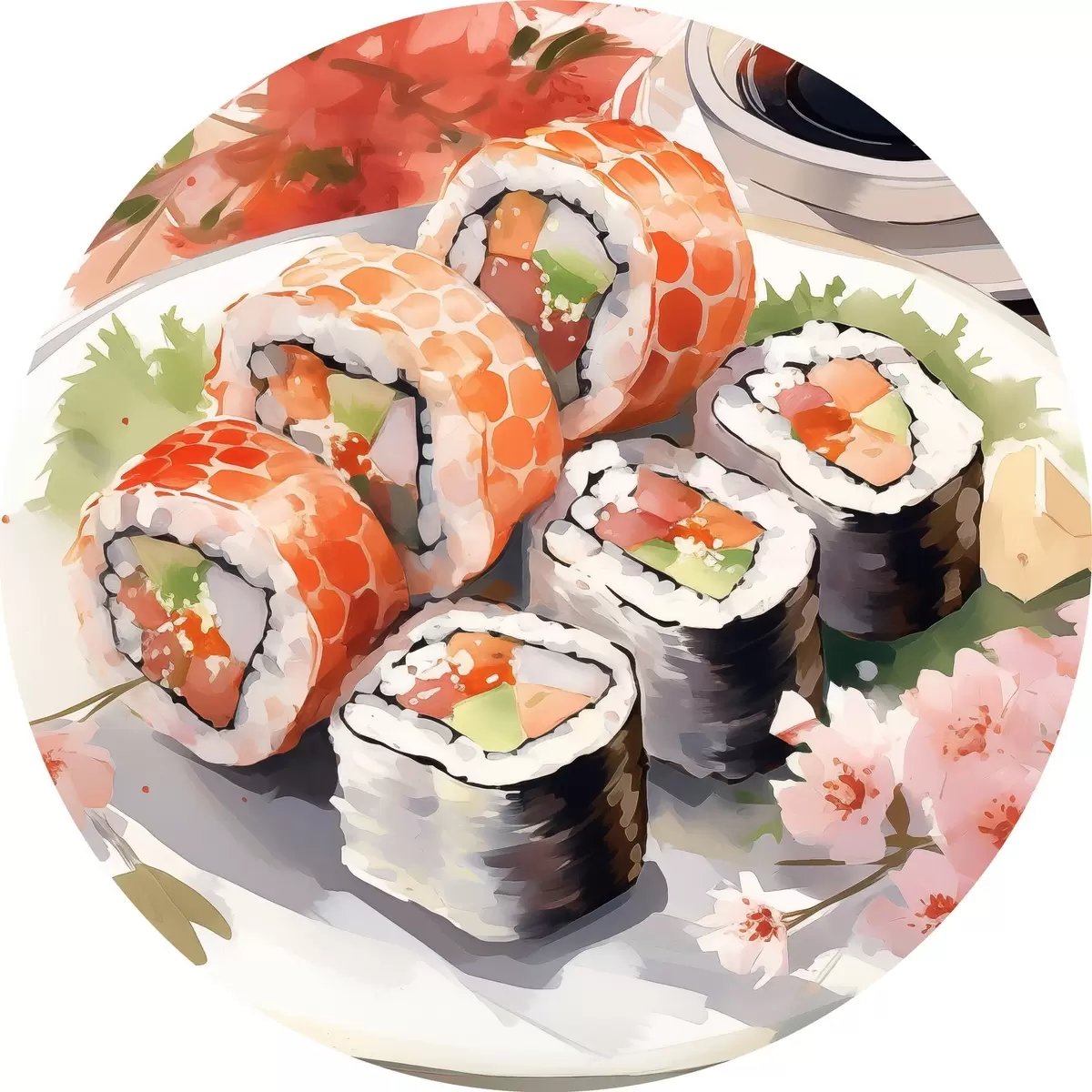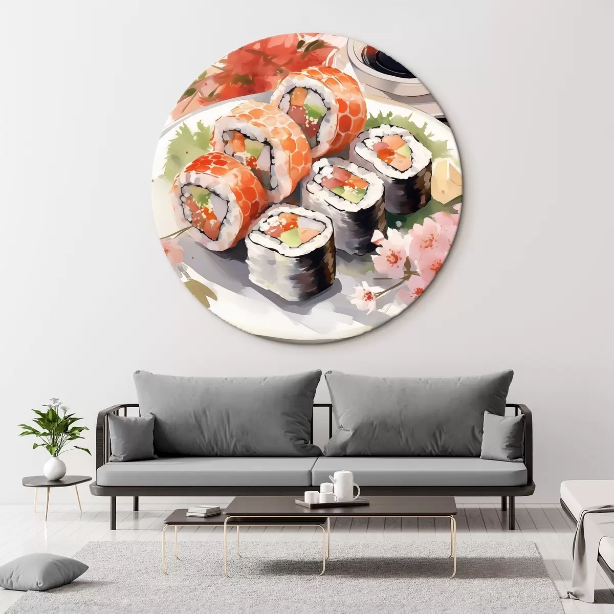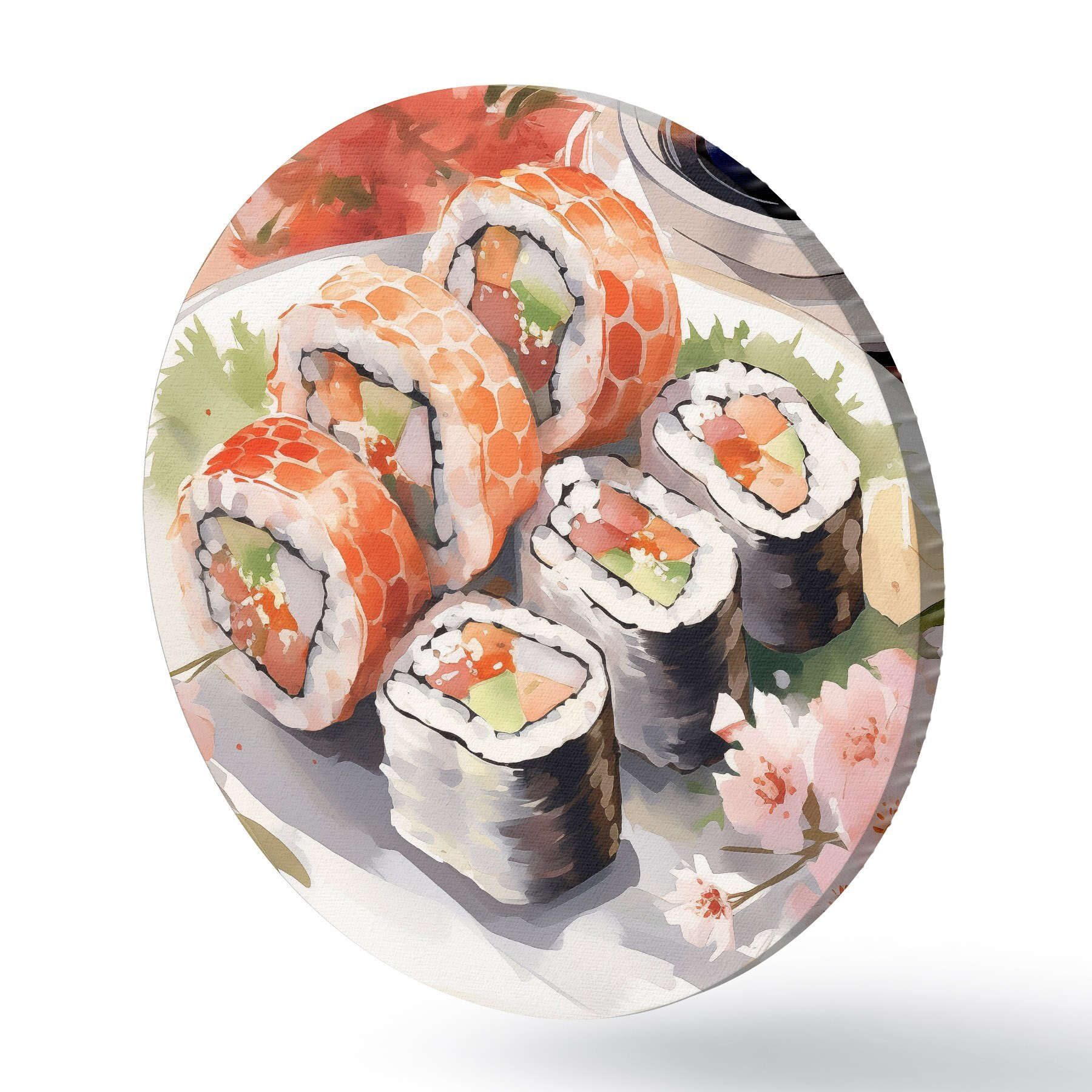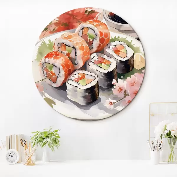 Ronde schilderijen Sushi op een bord, aquarel, bloemig, Japans r41179